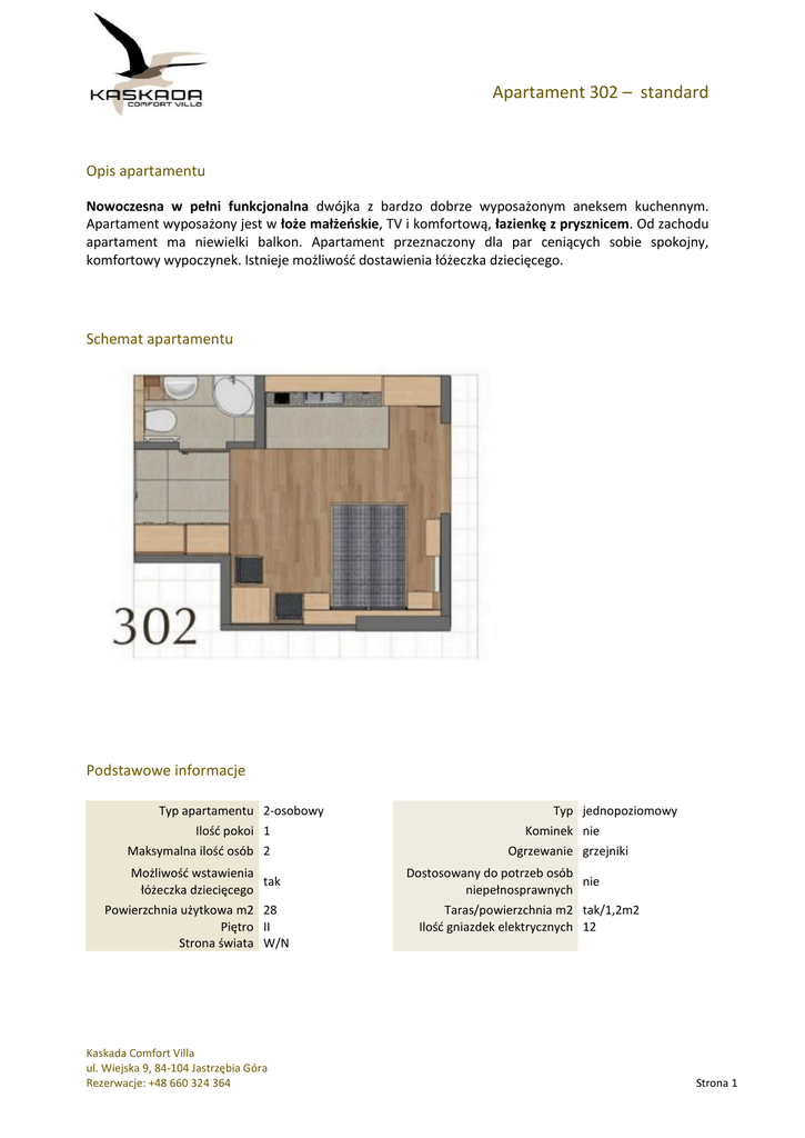 Apartament 302 – standard Opis apartamentu Nowoczesna w pełni funkcjonalna dwójka z bardzo dobrze wyposażonym aneksem kuchennym. Apartament wyposażony jest w łoże małżeńskie, TV i komfortową, łazienkę z prysznicem. Od zachodu apartament ma niewielki balkon. Apartament przeznaczony dla par ceniących sobie spokojny, komfortowy wypoczynek. Istnieje możliwość dostawienia łóżeczka dziecięcego. Schemat apartamentu Podstawowe informacje Typ apartamentu 2-osobowy Ilość pokoi 1 Maksymalna ilość osób 2 Możliwość wstawienia tak łóżeczka dziecięcego Powierzchnia użytkowa m2 28 Piętro II Strona świata W/N Kaskada Comfort Villa ul. Wiejska 9, 84-104 Jastrzębia Góra Rezerwacje: +48 660 324 364 Typ jednopoziomowy Kominek nie Ogrzewanie grzejniki Dostosowany do potrzeb osób nie niepełnosprawnych Taras/powierzchnia m2 tak/1,2m2 Ilość gniazdek elektrycznych 12 Strona 1 Apartament 302 – standard Podstawowe informacje Zestaw noży kuchennych Funkcjonalność Telewizor (cale)/ilość kanałów LCD 32/16 Odtwarzacz dvd tak Kabel HDMI tak / 6 sztuk Wyposażenie kuchni tak / 3 sztuki tak Zestaw łyżek do makaronu Pralka możliwość korzystania z pralni Zestaw drewnianych łyżek (3szt) tak Suszarka do włosów tak Durszlak tak Składana suszarka na bieliznę tak Półmisek tak Aneks kuchenny tak Kieliszki do wina tak / 6 sztuk Zmywarka/cm tak/45 Korkociąg tak Mikrofalówka tak Miska metalowa tak Lodówka/cm tak/ 80x60 Meble balkonowe tak Łóżko podwójne/ilość 1 Metalowy stojak pod garnki Korkowe podkładki pod garnki Szafki stojące/cm Łóżko pojedyncze/ilość 0 Łóżeczko dziecięce możliwość dostawienia Szafki wiszące/cm/ tak tak/ 3 sztuki tak/ łączna długość 115x86x57 tak/łączna długość 225x54x30 Pokój dzienny Wyposażenie kuchni Czajnik elektryczny tak Zaparzacz do kawy tak Garnki (duży i mały) tak Patelnia tak Zastawa/ilość kpl (talerze, talerzyki, miski, tak/ po 6 sztuk kubki, filiżanki) Sztućce (łyżki, łyżeczki, noże, widelce) tak/ po 6 sztuk Płyta indukcyjna/ceramiczna/i tak/ dwa palniki lość palników Toster tak Opiekacz/gofrownica tak Blender tak Zlewozmywak tak Tarka tak Serwetnik tak Deska do krojenia tak Kaskada Comfort Villa ul. Wiejska 9, 84-104 Jastrzębia Góra Rezerwacje: +48 660 324 364 Kanapa rozkładana 2osobowa/cm nie Fotel nie Szafa/cm tak/ 102x255x60 Szuflada z półką przylegająca do szafy tak/ 85x60x60 Pawlacz nad półką tak/ 90x60x45 Wieszaki/szt. tak/ 10 Ława/cm nie Stół/cm jadalniany tak/ 80x80x75,5 Krzesła do stołu/szt. tak/ 2 sztuki Komoda/cm nie Półki nie Okno balkonowe/cm tak/ 170x223 Okno/cm nie Rolety tak/ wewnętrzne Typ podłogi Kafelk/panele podłogowe Strona 2 Apartament 302 – standard Łazienka Część sypialna Prysznic tak/ kabina: 90x90 Wanna nie Bidet nie Umywalka/cm łóżko dwuosobowe/cm tak/ 140x200 Szuflady przy łóżku tak/ 50x33x20 tak/ 39x55 Pojedyncze łóżko/cm nie Lustro/cm tak/ 78x57 Szafa/cm nie Półki tak/ 78x53x20 Biurko tak/ 110x60x76 Szuflady nie Szafka tak/ 49,5x84x27 Szuflada z półką przylegająca do biurka nie Ręczniki tak Wieszaki na ręczniki tak / 4 szt. Krzesło tak Okno/cm nie Komoda/cm nie Zestaw kubeczki+mydelniczka Pościel tak nie Okno balkonowe/cm tak/ 170x223 Śmietnik tak Okno/cm nie Szczotka do toalety tak Rolety tak/ wewnętrzne Grzejnik tak Typ podłogi Panele podłogowe Cena w sezonie od 05.07 do 25.08 cena około-sezonowa od 01.06 do 05.07 i od 25.08 do 30.09 Cena poza sezonem* od 30.09 do 31.05 260 pln 220 pln 200 pln Cena obejmuje: Pobyt w apartamencie 2 osób Dzieci do 3 roku życia przebywają bez dodatkowych opłat. Usługi dodatkowe, takie jak: wypożyczenie rowerów, zajęcia animacyjne dla dzieci (w sezonie letnim), Korzystanie z grilla, Siłowni, Sali zabaw dla dzieci, gier PlayStation oraz XBox z kinectem, korzystanie z pralki, udogodnienia dla dzieci, internet oraz parking Kaskada Comfort Villa ul. Wiejska 9, 84-104 Jastrzębia Góra Rezerwacje: +48 660 324 364 Strona 3