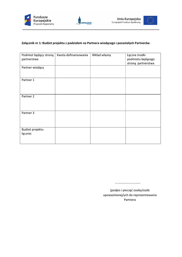 Załącznik nr 1: Budżet projektu z podziałem na Partnera wiodącego i pozostałych Partnerów. Podmiot będący stroną Kwota dofinansowania partnerstwa Partner wiodący Wkład własny Łączne środki podmiotu będącego stroną partnerstwa Partner 1 Partner 2 Partner 3 Budżet projektu łącznie: …………………………… (podpis i pieczęć osoby/osób upoważnionej/ych do reprezentowania Partnera Załącznik nr 2 : Harmonogram płatności. Partner 1: Harmonogram płatności Rok Kwartał Miesiąc Suma kwartał X Razem dla rok XXXX Wydatki kwalifikowalne Kwota zaliczki/refundacji (niepotrzebne skreślić) - Ogółem Partner 2: Harmonogram płatności Rok Kwartał Miesiąc Suma kwartał X Razem dla rok XXXX Wydatki kwalifikowalne kwota zaliczki/refundacji (niepotrzebne skreślić) - Ogółem …………………………… (podpis i pieczęć osoby/osób upoważnionej/ych do reprezentowania Partnera Załącznik nr 3 : Oświadczenie Partnera o braku wykluczenia z ubiegania się o środki europejskie oraz o niepodleganiu karze zakazu dostępu do tych środków. ……...…….…………………….. (nazwa i adres Partnera*) (miejsce i data) OŚWIADCZENIE W związku z przyznaniem ............................................................................................................. (nazwa Partnera wiodącego oraz jego status prawny) dofinansowania ze środków Europejskiego Funduszu Społecznego w ramach Regionalnego Programu Operacyjnego Województwa Opolskiego 2014-2020 na realizację projektu pt.: „......................................................................” nr …………………………………………, ...................................................... oświadcza, iż: (nazwa Partnera) 1. nie podlega wykluczeniu z możliwości otrzymania środków przeznaczonych na realizację programów finansowanych z udziałem środków europejskich, tj. wykluczeniu o którym mowa w art. 207 ustawy z dnia 27 sierpnia 2009 r. o finansach publicznych (Dz. U. z 2013r., poz. 885 z późn. zm.) oraz 2. nie podlega karze zakazu dostępu do środków, o których mowa w art. 5 ust. 3 pkt 1 i 4 ustawy z dnia 27 sierpnia 2009 r. o finansach publicznych na podstawie zapisów art. 12 ustawy z dnia 15 czerwca 2012 r. o skutkach powierzania wykonywania pracy cudzoziemcom przebywającym wbrew przepisom na terytorium Rzeczypospolitej Polskiej (Dz. U. z 2012 r., poz. 769) oraz na podstawie zapisów art. 9 ustawy z dnia 28 października 2002 r. o odpowiedzialności podmiotów zbiorowych za czyny zabronione pod groźbą kary (Dz. U. z 2015 r., poz. 1212 ze zm.). . …………………………… (podpis i pieczęć osoby/osób upoważnionej/ych do reprezentowania Partnera Załącznik nr 4 : Oświadczenie Partnera o niezaleganiu z uiszczaniem podatków, jak również z opłaceniem składek na ubezpieczenie społeczne i zdrowotne, Fundusz Pracy, Państwowy Fundusz Rehabilitacji Osób Niepełnosprawnych lub innych należności wymaganych odrębnymi przepisami. ……...…….…………………….. (nazwa i adres Partnera) (miejsce i data) OŚWIADCZENIE W związku z przyznaniem......................................................................... (nazwa Partnera wiodącego oraz jego status prawny) dofinansowania ze środków Europejskiego Funduszu Społecznego w ramach Regionalnego Programu Operacyjnego Województwa Opolskiego 2014-2020 na realizację projektu pt.:„......................................................................” nr …………………..…………………………………………, ...................................................... oświadcza, iż nie zalega z opłaceniem składek na ubezpieczenie (nazwa Partnera) społeczne i zdrowotne, Fundusz Pracy, Państwowy Fundusz Rehabilitacji Osób Niepełnosprawnych lub innych należności wymaganych odrębnymi przepisami. …………………………… (podpis i pieczęć osoby/osób upoważnionej/ych do reprezentowania Partnera) Załącznik nr 5 : Oświadczenie Partnera o kwalifikowalności podatku VAT OŚWIADCZENIE W związku z przyznaniem .............................................................................................. (nazwa Partnera wiodącego oraz jego status prawny) dofinansowania ze środków Europejskiego Funduszu Społecznego w ramach Regionalnego Programu Operacyjnego Województwa Opolskiego na lata 2014-2020 na realizację projektu .............................................................. oświadczam, iż jako Partner*: (nazwa i nr projektu) a) Nie mam prawnej możliwości odzyskania lub odliczenia poniesionego ostatecznie kosztu podatku VAT i w związku z tym wnioskuję o refundację poniesionego w ramach projektu podatku VAT. Jednocześnie zobowiązuję się do zwrotu zrefundowanej w ramach projektu części poniesionego podatku VAT, jeśli zaistnieją przesłanki umożliwiające odzyskanie lub odliczenie tego podatku; b) Mam prawną możliwość częściowego odzyskania lub odliczenia poniesionego ostatecznie kosztu podatku VAT i w związku z tym wnioskuję o refundację części poniesionego w ramach projektu podatku VAT. Jednocześnie zobowiązuję się do zwrotu zrefundowanej w ramach projektu części poniesionego podatku VAT, jeśli zaistnieją przesłanki umożliwiające odzyskanie lub odliczenie tego podatku; c) Nie mam prawnej możliwości odzyskania lub odliczenia poniesionego ostatecznie kosztu podatku VAT, jednak nie wnioskuję oraz nie będę w przyszłości wnioskować o refundację jakiejkolwiek części poniesionego w ramach projektu podatku VAT; d) Będę mógł odzyskać lub odliczyć koszt podatku VAT poniesionego w związku z realizacją działań objętych wnioskiem. …………………………… (podpis i pieczęć osoby/osób upoważnionej/ych do reprezentowania Partnera) *należy zaznaczyć właściwe