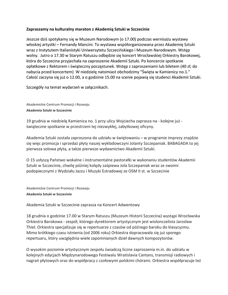 Zapraszamy na kulturalny maraton z Akademią Sztuki w Szczecinie Jeszcze dziś spotykamy się w Muzeum Narodowym (o 17.00) podczas wernisażu wystawy włoskiej artystki – Fernandy Mancini. To wystawa współorganizowana przez Akademię Sztuki wraz z Instytutem Italianistyki Uniwersytetu Szczecińskiego i Muzeum Narodowym. Wstęp wolny. Jutro o 17.30 w Starym Ratuszu odbędzie się koncert Wrocławskiej Orkiestry Barokowej, która do Szczecina przyjechała na zaproszenie Akademii Sztuki. Po koncercie spotkanie opłatkowe z Rektorem i świąteczny poczęstunek. Wstęp z zaproszeniami lub biletem (40 zł; do nabycia przed koncertem) W niedzielę natomiast obchodzimy "Święta w Kamienicy no.1." Całość zaczyna się już o 12.00, a o godzinie 15.00 na scenie pojawią się studenci Akademii Sztuki. Szczegóły na temat wydarzeń w załącznikach. Akademickie Centrum Promocji i Rozwoju Akademia Sztuki w Szczecinie 19 grudnia w niedzielę Kamienica no. 1 przy ulicy Wojciecha zaprasza na -‐ kolejne już -‐ świąteczne spotkanie w przestrzeni tej niezwykłej, zabytkowej oficyny. Akademia Sztuki została zaproszona do udziału w świętowaniu – w programie imprezy znajdzie się więc promocja i sprzedaż płyty naszej wykładowczyni Jolanty Szczepaniak. BABAGADA to jej pierwsza solowa płyta, a także pierwsze wydawnictwo Akademii Sztuki. O 15 usłyszą Państwo wokalne i instrumentalne pastorałki w wykonaniu studentów Akademii Sztuki w Szczecinie, chwilę później kolędy zaśpiewa Jola Szczepaniak wraz ze swoimi podopiecznymi z Wydziału Jazzu i Muzyki Estradowej ze OSM II st. w Szczecinie Akademickie Centrum Promocji i Rozwoju Akademia Sztuki w Szczecinie Akademia Sztuki w Szczecinie zaprasza na Koncert Adwentowy 18 grudnia o godzinie 17.00 w Starym Ratuszu (Muzeum Historii Szczecina) wystąpi Wrocławska Orkiestra Barokowa -‐ zespół, którego dyrektorem artystycznym jest wiolonczelista Jarosław Thiel. Orkiestra specjalizuje się w repertuarze z czasów od późnego baroku do klasycyzmu. Mimo krótkiego czasu istnienia (od 2006 roku) Orkiestra dopracowała się już sporego repertuaru, który uwzględnia wiele zapomnianych dzieł dawnych kompozytorów. O wysokim poziomie artystycznym zespołu świadczą liczne zaproszenia m.in. do udziału w kolejnych edycjach Międzynarodowego Festiwalu Wratislavia Cantans, transmisji radiowych i nagrań płytowych oraz do współpracy z czołowymi polskimi chórami. Orkiestra współpracuje też z największymi sławami światowej sceny muzyki dawnej -‐ gośćmi zespołu byli m.in.: Jaap ter Linden, Paul Mc Creesh, Peter Van Heyghen, Simone Kermes, Daniel Taylor, Barbara Maria Willi, Nico van der Meel, a także gwiazda Metropolitan Opera -‐ Aleksandra Kurzak. Wstęp z zaproszeniem lub biletem (40 zł do nabycia przed koncertem) Akademickie Centrum Promocji i Rozwoju Akademia Sztuki w Szczecinie PRZESTRZENIE FRAGMENTY RZECZY. NA ŚWIĘTEJ ZIEMI LO SPAZIOLE COSE I FRAMMENTI. SUL TERRENO DEL SACRO Fernanda Mancini dziś (piątek), godzina 17.00, Gmach Główny Muzeum Narodowego w Szczecinie, Wały Chrobrego 3 wernisaż wystawy, WSTĘP WOLNY „W wypadku Fotografii nigdy nie mogę zanegować faktu, że ta rzecz tam była (...). W Fotografii obecność rzeczy (w pewnej minionej chwili) nigdy nie jest metaforyczna (...). Dosłownie rzecz biorąc zdjęcie jest emanacją przedmiotu odniesienia. Od rzeczywistego ciała, które tu było, pobiegły promienie, które dotykają mnie – mnie, który tu jestem. Nieistotna jest długość trwania przekazu; zdjęcie osoby, której już nie ma, dociera do mnie jak zbłąkane promienie gwiazdy” Roland Barthes Fernanda Mancini -‐ biografia Jej sztuka czerpie inspiracje z wykształcenia filozoficznego, zdobytego na uniwersytecie „La Sapienza” w Rzymie. Za pracę o Emanuele Severino, a także w Szkole Doskonalenia Nauk Filozoficznych, gdzie obroniła pracę „Relacje Wnętrze-‐Zewnętrze w Nauce Logiki u Hegla” otrzymała stypendium naukowe w Neapolu, Kolonii i Marburgu. W latach 90-‐tych przeprowadziła się do Niemiec -‐ najpierw do Bonn, następnie (w 1993 roku) do Berlina. Wówczas zajęła się korespondencją kulturalną dla dziennika „Il Giornale” oraz dla „Il Resto del Carlino”, „Il Nostro Tempo”, „Epoca”. Ponadto rozwinęła pracę tłumacza literackiego m.in. „Arnold Schömberg-‐Thomas Man. A propos Doktora Fausta”. Również w latach 90-‐tych zajęła się organizacją konferencji i wystaw dla „Stowarzyszenia Dante Alighieri” w Berlinie. Niezadowolenie z badań prowadzonych wyłącznie w zakresie myśli i słów doprowadziły ją do głębokiej refleksji, z której wywodzi się jej własny język obrazów. Swoją edukację artystyczną pogłębiła na Universität der Künste w Berlinie, podczas kursów „Nagość i Rysunek” prowadzonych przez profesora Franka Geßnera, „Estetyk”i -‐ profesora Roberta Kudielki oraz w Akademii Sztuk Pięknych w Rzymie w podczas zajęć z „Historii Sztuki” u profesora Roberto Marii Siena. wystawa czynna: do 31 stycznia 2011 kuratorki: Diana Del Mastro i Ewa Kwidzińska bilety: 10 zł normalny/ 5 zł ulgowy/ czwartek bezpłatny godziny otwarcia: wtorek – piątek 10.00 – 18.00 sobota – niedziela 10.00 – 16.00 Organizatorzy: Katedra Italianistyki Uniwersytetu Szczecińskiego www.us.szc.pl/wt_ital Akademia Sztuki w Szczecinie www.akademiasztuki.eu Muzeum Narodowe w Szczecinie