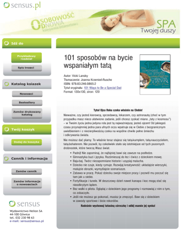 Idź do Przykładowy rozdział Spis treœci Katalog ksiazek Nowoœci 101 sposobów na bycie wspania³ym tat¹ Autor: Vicki Lansky T³umaczenie: Joanna Krzemieñ-Rusche ISBN: 978-83-246-0865-2 Tytu³ orygina³u: 101 Ways to Be a Special Dad Format: 130x130, stron: 120 Bestesllery Zamów drukowany katalog Twój koszyk Dodaj do koszyka Cennik i informacje Zamów cennik Zamów informacje o nowoœciach Tytu³ Ojca Roku czeka w³aœnie na Ciebie! Niewa¿ne, czy jesteœ kierowc¹, sprzedawc¹, lekarzem, czy astronaut¹ (choæ w tym przypadku masz nieco u³atwione zadanie, jeœli chcesz zyskaæ miano „taty z kosmosu”) – w Twoim ¿yciu jedna jedyna rola jest t¹ najwa¿niejsz¹: jesteœ ojcem! Od jakiegoœ czasu przynajmniej jedna para ufnych oczu wpatruje siê w Ciebie z bezgranicznym uwielbieniem i z niecierpliwoœci¹ czeka na wspólne chwile pe³ne œmiechu i odkrywania œwiata. Nie mo¿esz daæ plamy. To w³aœnie teraz stajesz siê tat¹-kumplem, tat¹-nauczycielem, tat¹-bohaterem. Nie pozwól, by cokolwiek sta³o siê istotniejsze od tych pozornych drobnostek, które tworz¹ Wasz œwiat. • Padnij! Nie zapominaj, ¿e najfajniej bawi siê zawsze na pod³odze. • Gimnastyka buzi i jêzyka. Rozœmieszaj do ³ez i æwicz z dzieckiem mowê. • Baju-baj. Twórz niezapomniane historie i usypiaj malucha. • Dziecko nie czuje, kiedy rymuje. Rozwijaj kreatywnoœæ: uk³adajcie wierszyki, malujcie obrazki, wymyœlajcie scenariusze. • Zabawa w pracê. Poka¿ dziecku swoje miejsce pracy i pozwól mu poczuæ siê tam jak u siebie. • Fortyfikacje i tunele. W deszczowy dzieñ nawet kanapa i koc mog¹ staæ siê nieodkrytym l¹dem. • Bez walki o pilota. Ogl¹daj z dzieckiem jego programy i rozmawiaj z nim o tym, co zobaczy³o. • Jeœli nie mo¿esz go pokonaæ, musisz je zmêczyæ. Baw siê z dzieckiem w zawody sportowe i bicie rekordów. Radoœnie wychowuj tatusin¹ córeczkê i odbij mamie jej synka! Wydawnictwo Helion SA 44-100 Gliwice tel. 032 230 98 63 e-mail: [email protected] 101 sposobów na bycie wspaniałym tatą Wymyślanie bajki na bieżąco to nie żadna filozo- fia, jeśli będziesz przestrzegać kilku zasad. Zawsze zaczynaj od „Dawno, dawno temu…”, postaciom występującym w bajce nadawaj własne imię, imię dziecka oraz jakieś wymyślone (na przykład Antonina Słonina Pikulina); nie wahaj się użyć elementów suspensu lub przemocy; a jeśli nie udaje Ci się znaleźć efektownego zakończenia, odwołaj się do magii (zastosuj terminologię w rodzaju: „Abrakadabra!” albo „Czary mary hokus-pokus”). Od czasu do czasu przyprowadź dziecko do swoje- go miejsca pracy — w godzinach roboczych albo wieczorem. Dziecku na pewno spodoba się wycieczka po firmie i z pewnością będzie je interesowało, czym się tam zajmujesz. Jeśli nic nie stoi na przeszkodzie, przedstaw dziecko szefowi i współpracownikom. Jeśli pracujesz w biurze, możesz zaaranżować małe „miejsce pracy” wyposażone w papier, spinacze, zszywacze, długopisy i ołówki, kalkulator i tym podobne drobiazgi, którymi może się zająć Twój mały „stażysta”. Wywołaj uśmiech na twarzy dziecka za pomocą następującego triku: udawaj, że poszczególne elementy Twojej twarzy to dźwignie sterujące językiem. Naciśnij palcem nos i wysuń język; pociągnij się za lewe ucho i przesuń język w prawo, wciągnij język z powrotem po naciśnięciu grdyki. Potem możesz pozwolić dziecku naciskać swój nos i grdykę oraz ciągnąć za ucho. Nie zapomnij sprawdzić, czy ten system działa u dziecka, kiedy Ty bierzesz je w obroty! Zafunduj dziecku przejażdżkę taczką wokół domu przy okazji wykonywania prac ogrodowych. Niech nie zniechęci Cię fakt, że taczka nie wygląda na specjalnie czystą (czym ryzykujesz krótkie spięcie ze zmęczoną praniem mamą). Ale czego nie robi się dla dzieci! Uzbrój dziecko pięcio- letnie lub starsze w rakietę do badmintona lub tenisa i rzucaj piłeczką tak, żeby udawało mu się ją odbić. Dziecku spodoba się sam fakt odbijania piłki. Czas na naukę wymachiwania rakietą przyjdzie później. Razem z dzieckiem zaprojektuj, wykonaj i powieś tabliczkę informacyjną „Jestem na rybach”. Zabierz wędkę, podbierak i (jeśli trzeba) kartę wędkarską dla Was. Zdobądźcie przynęty. Personel sklepu dla wędkarzy z pewnością chętnie wytłumaczy młodemu adeptowi wędkarstwa, jak się obchodzić ze sprzętem i jak wybrać stosowną przynętę. Kiedy jedziesz załatwiać różne sprawy, zabierz ze sobą dzieci i spróbuj zaangażować je w wykonywanie prostych czynności. Dzieci mogą być pomocne na szereg sposobów — mogą wrzucić listy do skrzynki, przynosić do koszyka artykuły spożywcze (takie jak płatki śniadaniowe), liczyć wydaną resztę, nosić lżejsze zakupy. Prawdopodobnie najlepszym miejscem do zabawy z dziećmi w różnym wieku jest podłoga lub trawa w ogrodzie. Połóż sobie na piersi niemowlaka i ukołysz go do snu, bawcie się w akrobacje, zagrajcie w karty lub grę planszową, poczytajcie coś albo po prostu gapcie się razem w sufit lub niebo. Zejście do parteru poprawia nastrój i pomaga wzmocnić więzi. Nudny deszczowy dzień? Zbuduj dziecku kryjówkę. Może to być forteca z koców i poduszek — albo po prostu dajcie nura pod łóżko osłonięte kapą. Wpełznijcie pod nie z latarką, nie zapominając zabrać ze sobą książki, kart do grania albo gry planszowej.