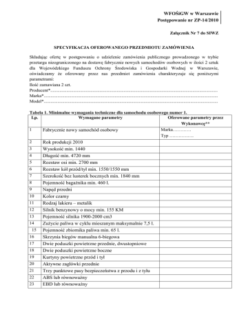 WFOŚiGW w Warszawie Postępowanie nr ZP-14/2010 Załącznik Nr 7 do SIWZ SPECYFIKACJA OFEROWANEGO PRZEDMIOTU ZAMÓWIENIA Składając ofertę w postępowaniu o udzielenie zamówienia publicznego prowadzonego w trybie przetargu nieograniczonego na dostawę fabrycznie nowych samochodów osobowych w ilości 2 sztuk dla Wojewódzkiego Funduszu Ochrony Środowiska i Gospodarki Wodnej w Warszawie, oświadczamy Ŝe oferowany przez nas przedmiot zamówienia charakteryzuje się poniŜszymi parametrami: Ilość zamawiana 2 szt. Producent*.................................................................................................................................................. Marka*........................................................................................................................................................ Model*........................................................................................................................................................ Tabela 1. Minimalne wymagania techniczne dla samochodu osobowego numer 1. Lp. Wymagane parametry Oferowane parametry przez Wykonawcę** 1 Marka………… Fabrycznie nowy samochód osobowy Typ ……………. 2 Rok produkcji 2010 3 4 5 6 7 8 9 10 11 12 13 14 15 16 17 18 19 20 21 22 23 Wysokość min. 1440 Długość min. 4720 mm Rozstaw osi min. 2700 mm Rozstaw kół przód/tył min. 1550/1550 mm Szerokość bez lusterek bocznych min. 1840 mm Pojemność bagaŜnika min. 460 l. Napęd przedni Kolor czarny Rodzaj lakieru – metalik Silnik benzynowy o mocy min. 155 KM Pojemność silnika 1900-2000 cm3 ZuŜycie paliwa w cyklu mieszanym maksymalnie 7,5 l. Pojemność zbiornika paliwa min. 65 l. Skrzynia biegów manualna 6-biegowa Dwie poduszki powietrzne przednie, dwustopniowe Dwie poduszki powietrzne boczne Kurtyny powietrzne przód i tył Aktywne zagłówki przednie Trzy punktowe pasy bezpieczeństwa z przodu i z tyłu ABS lub równowaŜny EBD lub równowaŜny WFOŚiGW w Warszawie Postępowanie nr ZP-14/2010 24 25 26 27 28 29 30 31 32 33 34 35 36 37 38 39 40 41 42 43 44 45 46 47 48 49 50 51 52 53 ESP lub równowaŜny Sterowane elektrycznie szyby przednie i tylne z systemem zapobiegającym przycięciu palców Elektrycznie sterowane, podgrzewane i składane lusterka zewnętrzne w kolorze nadwozia Kierunkowskazy boczne zintegrowane z lusterkami zewnętrznymi Automatycznie ściemniające się lusterko wsteczne Lampy przeciwmgielne z przodu Centralny zamek sterowany pilotem Dwa komplety składanych kluczyków z systemem zdalnego sterowania zamkiem Wycieraczki z czujnikiem deszczu Klimatyzacja dwustrefowa automatyczna Radioodtwarzacz z CD i RDS Dodatkowo- kpl. kół z zimowym ogumieniem (felgi aluminiowe) Podgrzewane fotele przednie Fotel kierowcy z regulacją wysokości Kierownica regulowana w dwóch płaszczyznach ze wspomaganiem elektrycznym Kierownica i drąŜek zmiany biegów - skórzane Siedzenia – ciemna tapicerka z tkaniny Podłokietniki przednich i tylnych siedzeń Uchwyty mocujące w bagaŜniku Przednie reflektory ksenonowe za spryskiwaczami Komplet dywaników Tempomat Czujniki parkowania przód i tył Elektroniczne, dwa niezaleŜne zabezpieczenia, w tym alarm Koło zapasowe, podnośnik, fabryczny zestaw narzędzi Gaśnica Apteczka Trójkąt ostrzegawczy Kamizelka odblaskowa Bezprzewodowy system obsługi telefonu Bluetooth * do wypełnienia przez wykonawcę ** do wypełnienia przez Wykonawcę, zapisy „Tak”, „Zgodne”, czy „Spełnia” „Jak obok” nie będą akceptowane, naleŜy podać rzeczywisty oferowany parametr. WFOŚiGW w Warszawie Postępowanie nr ZP-14/2010 Tabela 2. Minimalne wymagania techniczne dla samochodu osobowego numer 2. Lp. Wymagane parametry Oferowane parametry przez Wykonawcę** 1 Marka………… Fabrycznie nowy samochód osobowy Typ ……………. 2 Rok produkcji 2010 3 4 5 6 7 8 9 10 11 12 13 14 15 16 17 18 19 20 21 22 23 24 25 26 27 28 29 30 31 Wysokość min. 1440 Długość min. 4720 mm Rozstaw osi min. 2700 mm Rozstaw kół przód/tył min. 1550/1550 mm Szerokość bez lusterek bocznych min. 1840 mm Pojemność bagaŜnika min. 460 l. Napęd przedni Kolor czarny Rodzaj lakieru – metalik Silnik benzynowy o mocy min. 155 KM Pojemność silnika 1900-2000 cm3 ZuŜycie paliwa w cyklu mieszanym maksymalnie 7,5 l. Pojemność zbiornika paliwa min. 65 l. Skrzynia biegów manualna 6-biegowa Dwie poduszki powietrzne przednie, dwustopniowe Dwie poduszki powietrzne boczne Kurtyny powietrzne przód i tył Aktywne zagłówki przednie Trzy punktowe pasy bezpieczeństwa z przodu i z tyłu ABS lub równowaŜny EBD lub równowaŜny ESP lub równowaŜny Sterowane elektrycznie szyby przednie i tylne z systemem zapobiegającym przycięciu palców Elektrycznie sterowane, podgrzewane i składane lusterka zewnętrzne w kolorze nadwozia Kierunkowskazy boczne zintegrowane z lusterkami zewnętrznymi Automatycznie ściemniające się lusterko wsteczne Lampy przeciwmgielne z przodu Centralny zamek sterowany pilotem Dwa komplety składanych kluczyków z systemem zdalnego sterowania zamkiem WFOŚiGW w Warszawie Postępowanie nr ZP-14/2010 32 33 34 35 36 37 38 39 40 41 42 43 44 45 46 47 48 49 50 51 52 53 Wycieraczki z czujnikiem deszczu Klimatyzacja dwustrefowa automatyczna Radioodtwarzacz z CD i RDS Dodatkowo- kpl. kół z zimowym ogumieniem (felgi aluminiowe) Podgrzewane fotele przednie Fotel kierowcy z regulacją wysokości Kierownica regulowana w dwóch płaszczyznach ze wspomaganiem elektrycznym Kierownica i drąŜek zmiany biegów - skórzane Siedzenia – ciemna tapicerka z tkaniny Podłokietniki przednich i tylnych siedzeń Uchwyty mocujące w bagaŜniku Przednie reflektory ksenonowe za spryskiwaczami Komplet dywaników Tempomat Czujniki parkowania przód i tył Elektroniczne, dwa niezaleŜne zabezpieczenia, w tym alarm Koło zapasowe, podnośnik, fabryczny zestaw narzędzi Gaśnica Apteczka Trójkąt ostrzegawczy Kamizelka odblaskowa Bezprzewodowy system obsługi telefonu Bluetooth G
