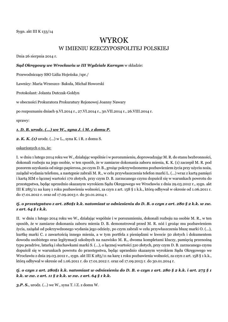Sygn. akt III K 133/14 WYROK W IMIENIU RZECZYPOSPOLITEJ POLSKIEJ Dnia 26 sierpnia 2014 r. Sąd Okręgowy we Wrocławiu w III Wydziale Karnym w składzie: Przewodniczący SSO Lidia Hojeńska /spr./ Ławnicy: Maria Wrzeszcz- Bakuła, Michał Howorski Protokolant: Jolanta Dutczak-Gołdyn w obecności Prokuratora Prokuratury Rejonowej Joanny Nawary po rozpoznaniu dniach 9.VI.2014 r., 27.VI.2014 r., 30.VII.2014 r., 26.VIII.2014 r. sprawy: 1. D. B. urodz. (...) we W., syna J. i M. z domu P. 2. K. K. (1) urodz. (...) w L., syna K. i R. z domu S. oskarżonych o to, że: I. w dniu 1 lutego 2014 roku we W., działając wspólnie i w porozumieniu, doprowadzając M. R. do stanu bezbronności, dokonali rozboju na jego osobie, w ten sposób, że w zamiarze dokonania zaboru mienia, K. K. (1) zaczepił M. R. pod pozorem uzyskania od niego papierosa, po czym D. B., grożąc pokrzywdzonemu pozbawieniem życia przy użyciu noża, zażądał wydania telefonu, a następnie zabrali M. R., w celu przywłaszczenia telefon marki L. (...) wraz z kartą pamięci i kartą SIM o łącznej wartości 170 złotych, przy czym D. B. zarzucanego czynu dopuścił się w warunkach powrotu do przestępstwa, będąc uprzednio skazanym wyrokiem Sądu Okręgowego we Wrocławiu z dnia 29.03.2012 r., sygn. akt III K 285/11 na karę 1 roku pozbawienia wolności, za czyn z art. 158 § 1 k.k., którą odbywał w okresie od 1.06.2011 r. do 17.01.2012 r. oraz od 17.09.2013 r. do 30.01.2014 r. tj. o przestępstwo z art. 280§1 k.k. natomiast w odniesieniu do D. B. o czyn z art. 280 § 2 k.k. w zw. z art. 64 § 1 k.k. II. w dniu 1 lutego 2014 roku we W., działając wspólnie i w porozumieniu, dokonali rozboju na osobie M. R., w ten sposób, że w zamiarze dokonania zaboru mienia D. B. demonstrował przed M. R. nóż i grożąc mu pozbawieniem życia, zażądał od pokrzywdzonego wydania jego odzieży, po czym zabrali w celu przywłaszczenia bluzę marki O. (...), kurtkę marki C. z zawartością innego mienia, a w tym portfela z pieniędzmi w kwocie 50 złotych i dokumentem dowodu osobistego oraz legitymacji szkolnych na nazwisko M. R., dwoma kompletami kluczy, pamięcią przenośną typu pendrive, latarką i słuchawkami marki S. (...), o łącznej wartości 510 złotych, przy czym D. B. zarzucanego czynu dopuścił się w warunkach powrotu do przestępstwa, będąc uprzednio skazanym wyrokiem Sądu Okręgowego we Wrocławiu z dnia 29.03.2012 r., sygn. akt III K 285/11 na karę 1 roku pozbawienia wolności, za czyn z art. 158 § 1 k.k., którą odbywał w okresie od 1.06.2011 r. do 17.01.2012 r. oraz od 17.09.2013 r. do 30.01.2014 r. tj. o czyn z art. 280§1 k.k. natomiast w odniesieniu do D. B. o czyn z art. 280 § 2 k.k. i art. 275 § 1 k.k. w zw. z art. 11 § 2 k.k. w zw. z art. 64 § 1 k.k. 3.P. S., urodz. (...) we W., syna T. i Z. z domu W. oskarżonego o to, że: III. w dniu 1 lutego 2014 roku we W., działając w warunkach powrotu do przestępstwa przyjął od D. B. telefon komórkowy marki L. (...) wraz z kartą SIM i kartą pamięci o łącznej wartości 170 złotych oraz słuchawki marki S. (...) o wartości 150 złotych, a następnie pomógł D. B. i K. K. (1) w zbyciu telefonu, w ten sposób, że oddał go w zastaw w lombardzie przy ulicy (...) we W. za kwotę 30 złotych, z czego otrzymał kwotę 10 złotych, przy czym wiedział, że przyjęte przez niego przedmioty pochodzą z przestępstwa przy czym czynu tego dopuścił się będąc karany wyrokiem Sądu Rejonowego dla Wrocławia- Fabrycznej z dnia 26.05.2008 r., sygn. akt. II K 649/07 za czyn z art. 280 §1 k.k. w zw. z art. 64 § 1 k.k. i wyrokiem Sądu Rejonowego dla Wrocławia- Fabrycznej z dnia 04.12. 2008 r., sygn. akt II K 1179/08 za czyn z art. 278 § 1 k.k. w zw. z art. 64 § 1 k.k., objętych następnie wyrokiem łącznym Sądu Rejonowego dla Wrocławia- Fabrycznej z dnia 19.06.2009 r., sygn. akt II K 333/09 na karę łączną 2 lat pozbawienia wolności, którą odbywał w okresach od 31.03.2009 r. do 09.10.2010 r., z zaliczeniem okresów od 09.03.2007 r. do 15.03.2007 r., od 30.03.2007 r. do 12.09.2007 r., od 10.03.2008 r. do 11.03.2008 r. tj. o czyn z art. 291 § 1 k.k. w zw. z art. 64 §1 k.k. ************************************************************************************************* I. oskarżonych D. B. i K. K. (1) uznaje za winnych popełnienia czynu opisanego w punkcie I części wstępnej wyroku eliminując z jego opisu stwierdzenie „grożąc pokrzywdzonemu pozbawieniem życia przy użyciu noża” i zastępując je słowami „grożąc pokrzywdzonemu uszkodzeniem ciała poprzez zapowiedź użycia noża, którego oskarżony D. B. nie demonstrował pokrzywdzonemu” tj. przestępstwa z art. 280 § 1 k.k. w stosunku do oskarżonego K. K. (1), a wobec oskarżonego D. B. przestępstwa z art. 280 § 1 k.k. w zw. z art. 64 § 1 k.k. i za to na podstawie art. 280 § 1 k.k. wymierza oskarżonemu D. B. karę 2 (dwóch) lat pozbawienia wolności a oskarżonemu K. K. (1) na podstawie art. 280 §1 k.k. przy zastosowaniu art. 60 § 1 i § 6 pkt. 2 k.k. karę 1 (jednego) roku pozbawienia wolności; II. oskarżonych D. B. i K. K. (1) uznaje za winnych popełnienia czynu opisanego w punkcie II części wstępnej wyroku tj. przestępstwa z art. 280 § 1 k.k. w stosunku do K. K. (1) i za to na podstawie art. 280 § 1 k.k. przy zastosowaniu art. 60 § 1 i § 6 pkt. 2 k.k. wymierza mu karę 1 (jednego) roku pozbawienia wolności, a w odniesieniu do oskarżonego D. B. przestępstwa z art. 280 § 2 k.k. i art. 275 § 1 k.k. w zw. z art. 11 § 2 k.k. w zw. z art. 64 § 1 k.k. i za to na podstawie art. 280 § 2 k.k. w zw. z art. 11 § 3 k.k. wymierza mu karę 4 (czterech) lat pozbawienia wolności; III. na podstawie art. 85 k.k. i 86 § 1 k.k. łączy orzeczone kary pozbawienia wolności i wymierza oskarżonemu D. B. karę łączną 4 (czterech) lat pozbawienia wolności a oskarżonemu K. K. (1) karę łączną 1 (jednego) roku i 6 (sześciu) miesięcy pozbawienia w
