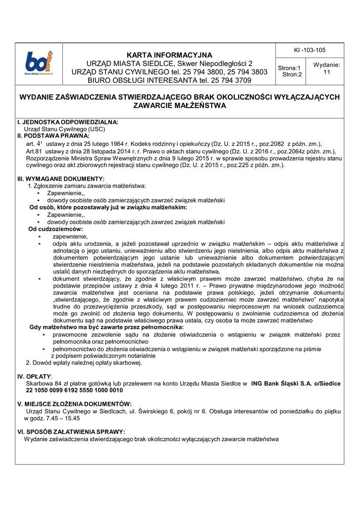 KARTA INFORMACYJNA URZĄD MIASTA SIEDLCE, Skwer Niepodległości 2 URZĄD STANU CYWILNEGO tel. 25 794 3800, 25 794 3803 BIURO OBSŁUGI INTERESANTA tel. 25 794 3709 KI -103-105 Strona:1 Stron:2 Wydanie: 11 WYDANIE ZAŚWIADCZENIA STWIERDZAJĄCEGO BRAK OKOLICZNOŚCI WYŁĄCZAJĄCYCH ZAWARCIE MAŁŻEŃSTWA I. JEDNOSTKA ODPOWIEDZIALNA: Urząd Stanu Cywilnego (USC) II. PODSTAWA PRAWNA: art. 4¹ ustawy z dnia 25 lutego 1964 r. Kodeks rodzinny i opiekuńczy (Dz. U. z 2015 r., poz.2082 z późn. zm.), Art.81 ustawy z dnia 28 listopada 2014 r. r. Prawo o aktach stanu cywilnego (Dz. U. z 2016 r., poz.2064z późn. zm.), Rozporządzenie Ministra Spraw Wewnętrznych z dnia 9 lutego 2015 r. w sprawie sposobu prowadzenia rejestru stanu cywilnego oraz akt zbiorowych rejestracji stanu cywilnego (Dz. U. z 2015 r., poz.225 z późn. zm.). III. WYMAGANE DOKUMENTY: 1. Zgłoszenie zamiaru zawarcia małżeństwa: • Zapewnienie,, • dowody osobiste osób zamierzających zawrzeć związek małżeński Od osób, które pozostawały już w związku małżeńskim: • Zapewnienie,, • dowody osobiste osób zamierzających zawrzeć związek małżeński Od cudzoziemców: • zapewnienie, • odpis aktu urodzenia, a jeżeli pozostawał uprzednio w związku małżeńskim – odpis aktu małżeństwa z adnotacją o jego ustaniu, unieważnieniu albo stwierdzeniu jego nieistnienia, albo odpis aktu małżeństwa z dokumentem potwierdzającym jego ustanie lub unieważnienie albo dokumentem potwierdzającym stwierdzenie nieistnienia małżeństwa, jeżeli na podstawie pozostałych składanych dokumentów nie można ustalić danych niezbędnych do sporządzenia aktu małżeństwa, • dokument stwierdzający, że zgodnie z właściwym prawem może zawrzeć małżeństwo, chyba że na podstawie przepisów ustawy z dnia 4 lutego 2011 r. – Prawo prywatne międzynarodowe jego możność zawarcia małżeństwa jest oceniana na podstawie prawa polskiego, jeżeli otrzymanie dokumentu „stwierdzającego, że zgodnie z właściwym prawem cudzoziemiec może zawrzeć małżeństwo” napotyka trudne do przezwyciężenia przeszkody, sąd w postępowaniu nieprocesowym na wniosek cudzoziemca może go zwolnić od złożenia tego dokumentu. W postępowaniu o zwolnienie cudzoziemca od złożenia dokumentu sąd na podstawie właściwego prawa ustala, czy osoba ta może zawrzeć małżeństwo Gdy małżeństwo ma być zawarte przez pełnomocnika: • prawomocne zezwolenie sądu na złożenie oświadczenia o wstąpieniu w związek małżeński przez pełnomocnika oraz pełnomocnictwo • pełnomocnictwo do złożenia oświadczenia o wstąpieniu w związek małżeński sporządzone na piśmie z podpisem poświadczonym notarialnie 2. Dowód wpłaty należnej opłaty skarbowej. IV. OPŁATY: Skarbowa 84 zł płatne gotówką lub przelewem na konto Urzędu Miasta Siedlce w ING Bank Śląski S.A. o/Siedlce 22 1050 0099 6192 5550 1000 0010 V. MIEJSCE ZŁOŻENIA DOKUMENTÓW: Urząd Stanu Cywilnego w Siedlcach, ul. Świrskiego 6, pokój nr 6. Obsługa interesantów od poniedziałku do piątku w godz. 7.45 – 15.45 VI. SPOSÓB ZAŁATWIENIA SPRAWY: W ydanie zaświadczenia stwierdzającego brak okoliczności wyłączających zawarcie małżeństwa KARTA INFORMACYJNA URZĄD MIASTA SIEDLCE, Skwer Niepodległości 2 URZĄD STANU CYWILNEGO tel. 25 794 3800, 25 794 3803 BIURO OBSŁUGI INTERESANTA tel. 25 794 3709 KI -103-105 Strona:2 Stron: 2 W ydanie:11 WYDANIE ZAŚWIADCZENIA STWIERDZAJĄCEGO BRAK OKOLICZNOŚCI WYŁĄCZAJĄCYCH ZAWARCIE MAŁŻEŃSTWA VII. TERMIN ZAŁATWIENIA: Od ręki VIII. TRYB ODWOŁAWCZY Nie służy odwołanie w trybie administracyjnym UWAGI: Zgodnie z art.6, ust.1, pkt.1 ustawy z dnia 16 listopada 2006r. o opłacie skarbowej (Dz. U. z 2016, poz.1827). Obowiązek zapłaty opłaty skarbowej od dokonania czynności urzędowej powstaje z chwilą złożenia wniosku o dokonanie czynności urzędowej.