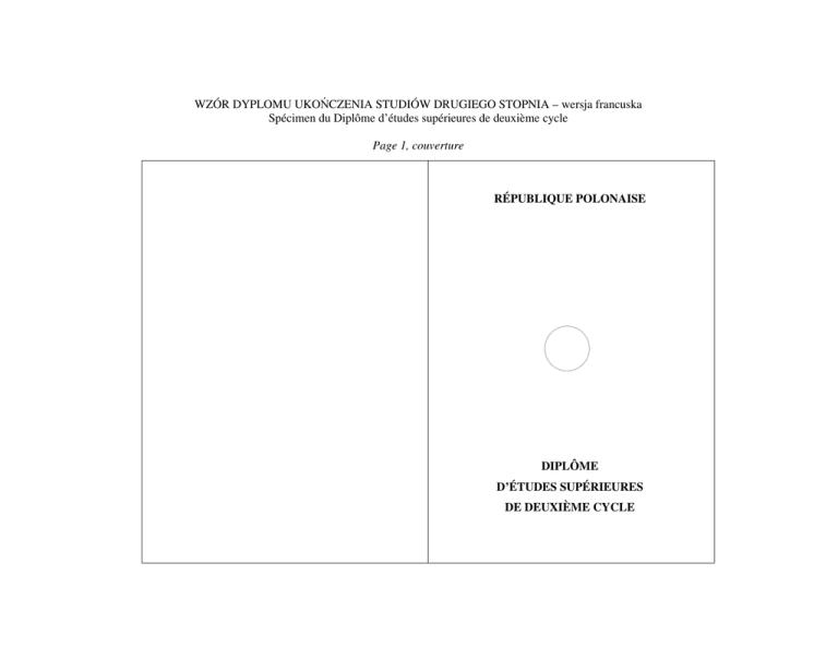WZÓR DYPLOMU UKOŃCZENIA STUDIÓW DRUGIEGO STOPNIA – wersja francuska Spécimen du Diplôme d’études supérieures de deuxième cycle Page 1, couverture RÉPUBLIQUE POLONAISE DIPLÔME D’ÉTUDES SUPÉRIEURES DE DEUXIÈME CYCLE page 2, gauche intérieure page 3, droite ............................................................................................ (nom de l’établissement) …………………………………………………………… (nom de l’unité de formation) 45x65 mm Photo DIPLÔME de fin d’études ……………………..……………………………………. dans le domaine .......................................................................... spécialité …................................................................................ avec la mention …….………..…………………........................ obtenu le …………………………………...............................…………. conférant le titre de ...................................................................... Mlle/Mme/M .............................................................. Le Directeur né(e) le ........................................................................ de l’unité de formation Le Recteur à .................................................................................. …………………………………………… (signature du titulaire) Numéro du diplôme ........................................ ……………………… (sceau et signature) ...................................... (lieu) ………………………. (sceau et signature) fait le ...................... page 4, gauche page 5, droite intérieure Page réservée à la légalisation page 6, gauche page 7, droite intérieure Page réservée à l’apostille Page réservée à l’apostille