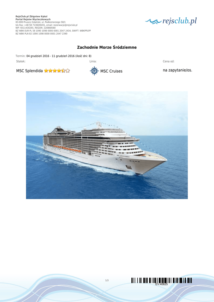 RejsClub.pl Zbigniew Kąkol Portal Rejsów Wycieczkowych 83-000 Pruszcz Gdański, ul. Podkomorzego 58/1 tel./fax: +48 58 7138200/01, email: [email protected] NIP: 6511430265, REGON: 220868580 BZ WBK EUR PL 58 1090 1098 0000 0001 2047 2434, SWIFT: WBKPPLPP BZ WBK PLN 82 1090 1098 0000 0001 2047 2390 Zachodnie Morze Śródziemne Termin: 04 grudzień 2016 - 11 grudzień 2016 (ilość dni: 8) Statek: MSC Splendida Linia: Cena od: MSC Cruises na zapytanie/os. 1/3 EV:40625 RejsClub.pl Zbigniew Kąkol Portal Rejsów Wycieczkowych 83-000 Pruszcz Gdański, ul. Podkomorzego 58/1 tel./fax: +48 58 7138200/01, email: [email protected] NIP: 6511430265, REGON: 220868580 BZ WBK EUR PL 58 1090 1098 0000 0001 2047 2434, SWIFT: WBKPPLPP BZ WBK PLN 82 1090 1098 0000 0001 2047 2390 TRASA REJSU dzień 1 Data Port Wpłynięcie Wypłynięcie niedziela 04.12.2016 Genua --:-- 18:00 08:00 19:00 10:00 17:00 10:00 18:00 Włochy poniedziałek 05.12.2016 Civitavecchia, Rzym wtorek 06.12.2016 Palermo, Sycylia środa 07.12.2016 Valletta dzień 5 czwartek 08.12.2016 Dzień na morzu --:-- --:-- dzień 6 piątek 09.12.2016 Barcelona 09:00 18:00 sobota 10.12.2016 Marsylia 08:00 17:00 08:00 --:-- dzień 2 dzień 3 dzień 4 dzień 7 dzień 8 Legenda Włochy niedziela 11.12.2016 Włochy Malta Hiszpania Francja Genua Włochy CENNIK Cena katalogowa Kabina wewnętrzna na zapytanie Kabina zewnętrzna z oknem na zapytanie Kabina zewnętrzna z balkonem na zapytanie Suite (apartament) na zapytanie MSC Yacht Club Suite na zapytanie Kabina jednoosobowa na zapytanie 3 i 4 osoba dorosła w kabinie na zapytanie dziecko do 12 lat jako 3 i 4 osoba w kabinie dziecko od 13 do 17 lat jako 3 i 4 osoba w kabinie Cena promocyjna tylko opłaty portowe na zapytanie 2/3 EV:40625 RejsClub.pl Zbigniew Kąkol Portal Rejsów Wycieczkowych 83-000 Pruszcz Gdański, ul. Podkomorzego 58/1 tel./fax: +48 58 7138200/01, email: [email protected] NIP: 6511430265, REGON: 220868580 BZ WBK EUR PL 58 1090 1098 0000 0001 2047 2434, SWIFT: WBKPPLPP BZ WBK PLN 82 1090 1098 0000 0001 2047 2390 Opłaty portowe €120.00 Uwaga! Ceny za osobę w kabinie dwuosobowej. Cena zawiera: zakwaterowanie w kabinie wybranej kategorii; wyżywienie - 3 główne posiłki, przekąski między posiłkami, bufet lub przekąski o północy; napoje serwowane do śniadania i w bufetach samoobsługowych; serwis bagażowy podczas wejścia i zejścia ze statku; serwis kabinowy; korzystanie ze wszystkich urządzeń sportowo - rekreacyjnych znajdujących się na pokładzie statku (basen, jacuzzi, sala fitness, itp.); udział we wszystkich imprezach organizowanych na statku (przedstawienia w teatrze, koncerty, programy animacyjne itp.). Cena nie zawiera: kosztów dojazdu do portu; opłat portowych; ewentualnych noclegów w hotelu przed/po rejsie i transferów; wycieczek fakultatywnych w trakcie rejsu; korzystania z barów, mini baru w kabinie oraz napojów zamawianych w restauracji; korzystania z punktów usługowych (fryzjer, pralnia, fotograf, salon piękności i odnowy biologicznej, internet) i wydatków osobistych; napiwków dla obsługi na statku (kwota uzależniona od długości rejsu); ubezpieczenia KL, NNW i bagaż, kosztów wiz (tam gdzie wymagane). Uwagi: na wszystkich rejsach MSC Cruises można zarezerwować pakiety all inclusive: Allegrissimo 24h: 26€/os./dzień i 12€/dziecko/dzień; Allegrissimo Premium: 44€/os./dzień i 21€/dziecko/dzień (pakiet musi być wykupiony przez każdą osobę zakwaterowaną w kabinie - można zakupić w biurze przed rejsem). Na Państwa życzenie zarezerwujemy przelot, transfery do/z portu, parking, dodatkowe noclegi oraz zadbamy o odpowiednie ubezpieczenie podróżne. 3/3 EV:40625