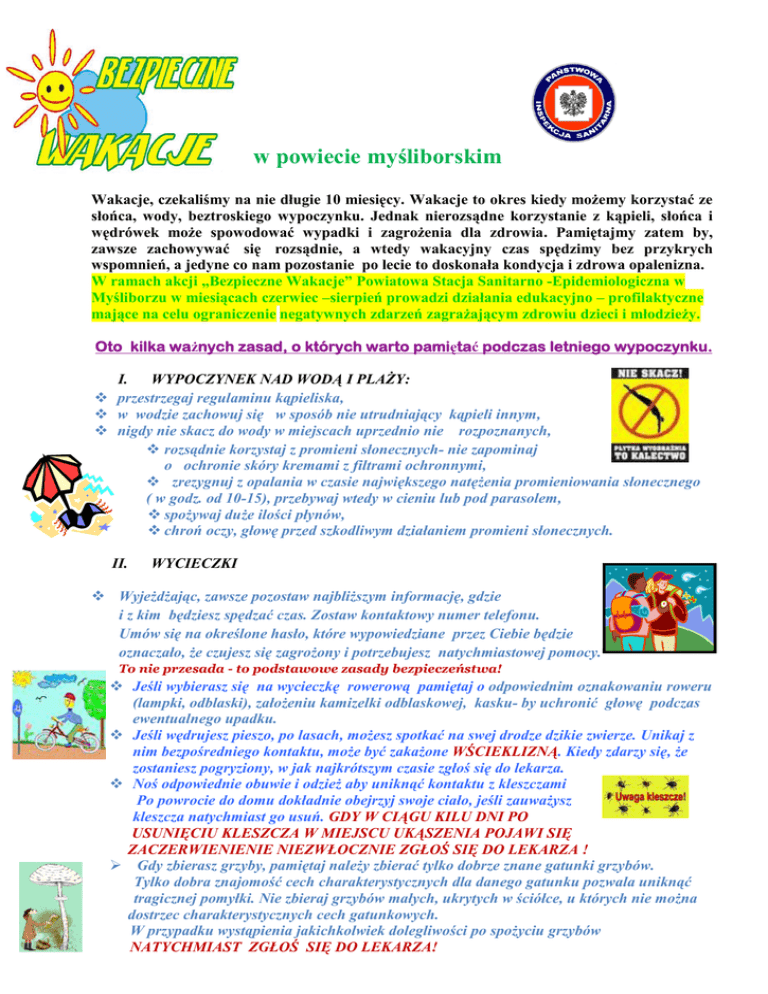 w powiecie myśliborskim w powiecie Wakacje, czekaliśmy na nie długie 10 miesięcy. Wakacje to okres kiedy możemy korzystać ze słońca, wody, beztroskiego wypoczynku. Jednak nierozsądne korzystanie z kąpieli, słońca i wędrówek może spowodować wypadki i zagrożenia dla zdrowia. Pamiętajmy zatem by, zawsze zachowywać się rozsądnie, a wtedy wakacyjny czas spędzimy bez przykrych wspomnień, a jedyne co nam pozostanie po lecie to doskonała kondycja i zdrowa opalenizna. W ramach akcji „Bezpieczne Wakacje” Powiatowa Stacja Sanitarno -Epidemiologiczna w Myśliborzu w miesiącach czerwiec –sierpień prowadzi działania edukacyjno – profilaktyczne mające na celu ograniczenie negatywnych zdarzeń zagrażającym zdrowiu dzieci i młodzieży. Oto kilka ważnych zasad, o których warto pamiętać podczas letniego wypoczynku. I. WYPOCZYNEK NAD WODĄ I PLAŻY: przestrzegaj regulaminu kąpieliska, w wodzie zachowuj się w sposób nie utrudniający kąpieli innym, nigdy nie skacz do wody w miejscach uprzednio nie rozpoznanych, rozsądnie korzystaj z promieni słonecznych- nie zapominaj o ochronie skóry kremami z filtrami ochronnymi, zrezygnuj z opalania w czasie największego natężenia promieniowania słonecznego ( w godz. od 10-15), przebywaj wtedy w cieniu lub pod parasolem, spożywaj duże ilości płynów, chroń oczy, głowę przed szkodliwym działaniem promieni słonecznych. II. WYCIECZKI Wyjeżdżając, zawsze pozostaw najbliższym informację, gdzie i z kim będziesz spędzać czas. Zostaw kontaktowy numer telefonu. Umów się na określone hasło, które wypowiedziane przez Ciebie będzie oznaczało, że czujesz się zagrożony i potrzebujesz natychmiastowej pomocy. To nie przesada - to podstawowe zasady bezpieczeństwa! Jeśli wybierasz się na wycieczkę rowerową pamiętaj o odpowiednim oznakowaniu roweru (lampki, odblaski), założeniu kamizelki odblaskowej, kasku- by uchronić głowę podczas ewentualnego upadku. Jeśli wędrujesz pieszo, po lasach, możesz spotkać na swej drodze dzikie zwierze. Unikaj z nim bezpośredniego kontaktu, może być zakażone WŚCIEKLIZNĄ. Kiedy zdarzy się, że zostaniesz pogryziony, w jak najkrótszym czasie zgłoś się do lekarza. Noś odpowiednie obuwie i odzież aby uniknąć kontaktu z kleszczami Po powrocie do domu dokładnie obejrzyj swoje ciało, jeśli zauważysz kleszcza natychmiast go usuń. GDY W CIĄGU KILU DNI PO USUNIĘCIU KLESZCZA W MIEJSCU UKĄSZENIA POJAWI SIĘ ZACZERWIENIENIE NIEZWŁOCZNIE ZGŁOŚ SIĘ DO LEKARZA ! Gdy zbierasz grzyby, pamiętaj należy zbierać tylko dobrze znane gatunki grzybów. Tylko dobra znajomość cech charakterystycznych dla danego gatunku pozwala uniknąć tragicznej pomyłki. Nie zbieraj grzybów małych, ukrytych w ściółce, u których nie można dostrzec charakterystycznych cech gatunkowych. W przypadku wystąpienia jakichkolwiek dolegliwości po spożyciu grzybów NATYCHMIAST ZGŁOŚ SIĘ DO LEKARZA! III POSIŁKI Okres letni, wysokie temperatury sprzyjają szybszemu rozwojowi bakterii. W związku z tym łatwiej może przytrafić się nam zatrucie pokarmowe. Zatrucia pokarmowe najczęściej powodują nieświeże wyroby cukiernicze z dodatkiem kremów, lody, wyroby garmażeryjne oraz potrawy z jaj, mięsa, ryb, i ich przetwory. Potrawy te są narażone na szybkie, stanowią dobre podłoże do rozwoju mikroorganizmów. Aby ustrzec się przykrych dolegliwości związanych z zatruciem pokarmowym zawsze: j z myj ręce przed przygotowywaniem i spożywaniem posiłków, myj ręce po wyjściu z toalety, przechowuj żywność w niskiej temperaturze, nigdy powtórnie nie zamrażaj artykułów spożywczych, unikaj spożywania pokarmów pochodzących od nieznanych wytwórców, zwracaj uwagę na daty przydatności do spożycia wszystkich produktów. GDY WYSTĄPIĄ DOLEGLIWOŚCI TYPU: BIEGUNKA, WYMIOTY, NUDNOŚCI, TEMPERATURA. NIE CZEKAJ- ZGŁOŚ SIĘ DO LEKARZA! IV NOWE ZNAJOMOŚCI Okres wakacyjny to czas gdy, spotykamy nowych ludzi i zawieramy nowe znajomości. ZAWSZE: powiedz NIE gdy ktoś zaproponuje Ci alkoholalkohol sprzyja ryzykownym zachowaniom, powiedz NIE gdy ktoś zaproponuje Ci narkotyk, powiedz NIE na szybki seks bez zabezpieczenia -Każdy, kto podejmuje ryzykowne zachowania, może ulec zakażeniu HIV – bez względu na wykształcenie, wyznanie, kolor skóry, wiek, płeć czy orientację seksualną . Zakażenia HIV nie można rozpoznać po wyglądzie! powiedz NIE w sytuacji, kiedy czujesz, że ryzykujesz. PAMIĘTAJ! NAD TWOIM BEZPIECZEŃSTWEM CZUWA WIELE SŁUŻB. W RAZIE POTRZEBY DZWOŃ: Powiatowa Stacja Sanitarno-Epidemiologiczna w Myśliborzu życzy wesołych, słonecznych i bezpiecznych wakacji. Opracowała: Giniewicz Regina OZiPZ PSSE Myślibórz