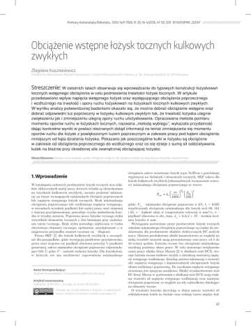 Pomiary Automatyka Robotyka, ISSN 1427-9126, R. 20, Nr 4/2016, 47-50, DOI: 10.14313/PAR_222/47 Obciążenie wstępne łożysk tocznych kulkowych zwykłych Zbigniew Kusznierewicz Politechnika Warszawska, Wydział Mechatroniki, Instytut Mikromechaniki i Fotoniki, ul. Św. Andrzeja Boboli 8, 02-525 Warszawa Streszczenie: W ostatnich latach obserwuje się wprowadzanie do typowych konstrukcji łożyskowań tocznych wstępnego obciążenia w celu podniesienia trwałości łożysk tocznych. W artykule przedstawiono wpływ napięcia wstępnego łożysk oraz występującego obciążenia poprzecznego i wzdłużnego na trwałość i opory ruchu łożyskowań na łożyskach tocznych kulkowych zwykłych. W wyniku analizy potwierdzonej badaniami okazało się, że można dobrać obciążenie wstępne oraz dobrać odpowiedni luz poprzeczny w łożysku kulkowym zwykłym tak, że trwałość łożyska ulegnie zwiększeniu jak i zmniejszeniu ulegną opory ruchu ułożyskowania. Opracowana metoda pomiaru momentu oporów ruchu w łożyskach tocznych, nazwana „metodą wybiegu”, wykazała przydatność dając konkretne wyniki w postaci nieznanych dotąd informacji na temat zmniejszania się momentu oporów ruchu dla łożysk z powiększonym luzem poprzecznym w zakresie pracy pod kątem obciążenia mniejszym od kąta działania łożyska. Pokazano jak poszczególne kulki w łożysku są obciążone w zakresie od obciążenia poprzecznego do wzdłużnego oraz co się dzieje z sumą sił oddziaływania kulek na bieżnie przy określonej sile zewnętrznej obciążającej łożysko. Słowa kluczowe: łożysko toczne kulkowe zwykłe, obciążenie wstępne, kąt działania łożyska, luz poprzeczny w łożysku, moment tarcia 1. Wprowadzenie W katalogach czołowych producentów łożysk tocznych oraz silników elektrycznych małej mocy, których wirniki są ułożyskowane na łożyskach kulkowych zwykłych, zaczęto podawać informacje na temat wymaganych minimalnych obciążeń poprzecznych lub napięcia wstępnego łożysk tocznych. Brak minimalnego obciążenia poprzecznego lub wzdłużnego napięcia wstępnego, w warunkach wysokich prędkości lub częstej pracy start stopowej z dużymi przyśpieszeniami, powoduje ryzyko uszkodzenia łożyska w wyniku zatarcia. Poprawna praca łożyska wymaga styku wszystkich elementów tocznych z obu bieżniami przy zachowaniu tarcia tocznego. Brak styku powoduje zakłócenia w ruchu obrotowym elementu tocznego: opóźnienie, przyśpieszenie a w najgorszym przypadku zamiast toczenia się – ślizganie. Firma SKF [1] dla łożysk kulkowych zwykłych a szczególnie dla przypadków, gdzie występują gwałtowne przyśpieszenia, praca start stopowa czy prędkość obrotowa powyżej ½ prędkości granicznej, zaleca minimalne obciążenie poprzeczne odpowiadające 0,01 C, gdzie C – nośność ruchowa łożyska. Dla łożyskowań, w których nie ma możliwości zapewnienia minimalnego Autor korespondujący: Zbigniew Kusznierewicz, [email protected] Artykuł recenzowany nadesłany 10.10.2016 r., przyjęty do druku 09.12.2016 r. Zezwala się na korzystanie z artykułu na warunkach licencji Creative Commons Uznanie autorstwa 3.0 obciążenia zaleca stosowanie łożysk typu NoWear z powłokami węglowymi na bieżniach i elementach tocznych. SKF zaleca dla łożysk kulkowych zwykłych jednorzędowych wyznaczenie wartości minimalnego obciążenia poprzecznego ze wzoru: gdzie: Frm – minimalne obciążenie poprzeczne w kN, kr = 0,025 współczynnik obciążenia minimalnego dla łożysk serii 60, 161 i 62, v – lepkość oleju w temperaturze roboczej w mm²/s, n – prędkość obrotowa w obr./min, dm = 0,5(d + D) – średnia średnica łożyska w mm. Wymagania postawione przez producentów łożysk tocznych odnośnie minimalnego obciążenia poprzecznego są trudne do zrealizowania dla producentów silników elektrycznych DC małych mocy. Masowo produkowane silniki komutatorowe ze względu na niską trwałość szczotek mają gwarantowany czas pracy od 5 do 10 tysięcy godzin. Łożyska toczne bez obciążenia minimalnego uzyskują podobny okres pracy. W celu znacznego zwiększenia czasu pracy silnika firma Maxon [2] w silnikach serii DCX, stosuje łożyska toczne kulkowe zwykłe z określoną wartością napięcia wstępnego wzdłużnego. Katalog zawiera informację o wartości siły napięcia wstępnego i dopuszczalnych obciążeniach łożysk siłami wzdłużną i poprzeczną. Do uzyskania napięcia wstępnego stosowana jest sprężyna naciskowa. Silniki wysokoobrotowe serii EC firmy Maxon w porównaniu z silnikami serii DCX mają większe wartości sił napięcia wstępnego wzdłużnego oraz mniejsze obciążenia poprzeczne ze względu na siły odśrodkowe działające na elementy toczne. O trwałości łożyska decydują w dużej mierze wartości sił oddziaływania kulek na bieżnie oraz rodzaje tarcia między kul- 47 Obciążenie wstępne łożysk tocznych kulkowych zwykłych Rys. 3. Wykresy sił oddziaływania kulek na bieżnie łożyska typu 607 w funkcji kąta kierunku obciążenia zewnętrznego β. Wartość obciążenia ulegającego zmianie od poprzecznego do wzdłużnego P0 = 17 N, luz poprzeczny w łożysku gp = 8 µm, a, b, c, α0, Pw – identyczne jak na rys. 2 Fig. 3. Graphs of interaction forces between the balls and the raceways in bearing type 607 vs. external load direction angle β; value of the load changes its direction from radial to axial P0 = 17 N, radial clearance in the bearing gp = 8 µm, a, b, c, α0, Pw – same as in Fig. 2 Rys. 1. Konstrukcja łożyska tocznego kulkowego zwykłego: αo – maksymalny kąta działania łożyska przy obciążeniu siłą wzdłużną; Rbz, Rbw – promienie zarysu bieżni odpowiednio pierścienia zewnętrznego (z) i wewnętrznego (w) mierzone w płaszczyźnie osiowej łożyska Fig. 1. Design of a standard ball bearing: αo – maximal contact angle of the bearing while loaded with axial force; Rbz, Rbw – outline r