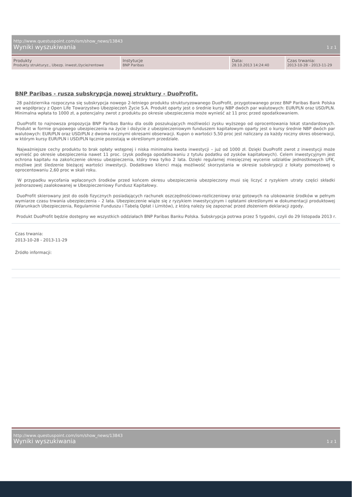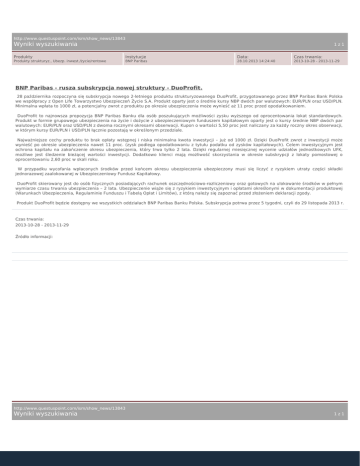 http://www.questuspoint.com/ism/show_news/13843 Wyniki wyszukiwania Produkty Produkty strukturyz., Ubezp. inwest./życie/rentowe 1z1 Instytucje BNP Paribas Data: 28.10.2013 14:24:40 Czas trwania: 2013-10-28 - 2013-11-29 BNP Paribas - rusza subskrypcja nowej struktury - DuoProfit. 28 października rozpoczyna się subskrypcja nowego 2-letniego produktu strukturyzowanego DuoProfit, przygotowanego przez BNP Paribas Bank Polska we współpracy z Open Life Towarzystwo Ubezpieczeń Życie S.A. Produkt oparty jest o średnie kursy NBP dwóch par walutowych: EUR/PLN oraz USD/PLN. Minimalna wpłata to 1000 zł, a potencjalny zwrot z produktu po okresie ubezpieczenia może wynieść aż 11 proc przed opodatkowaniem. DuoProfit to najnowsza propozycja BNP Paribas Banku dla osób poszukujących możliwości zysku wyższego od oprocentowania lokat standardowych. Produkt w formie grupowego ubezpieczenia na życie i dożycie z ubezpieczeniowym funduszem kapitałowym oparty jest o kursy średnie NBP dwóch par walutowych: EUR/PLN oraz USD/PLN z dwoma rocznymi okresami obserwacji. Kupon o wartości 5,50 proc jest naliczany za każdy roczny okres obserwacji, w którym kursy EUR/PLN i USD/PLN łącznie pozostają w określonym przedziale. Najważniejsze cechy produktu to brak opłaty wstępnej i niska minimalna kwota inwestycji – już od 1000 zł. Dzięki DuoProfit zwrot z inwestycji może wynieść po okresie ubezpieczenia nawet 11 proc. (zysk podlega opodatkowaniu z tytułu podatku od zysków kapitałowych). Celem inwestycyjnym jest ochrona kapitału na zakończenie okresu ubezpieczenia, który trwa tylko 2 lata. Dzięki regularnej miesięcznej wycenie udziałów jednostkowych UFK, możliwe jest śledzenie bieżącej wartości inwestycji. Dodatkowo klienci mają możliwość skorzystania w okresie subskrypcji z lokaty pomostowej o oprocentowaniu 2,60 proc w skali roku. W przypadku wycofania wpłaconych środków przed końcem okresu ubezpieczenia ubezpieczony musi się liczyć z ryzykiem utraty części składki jednorazowej zaalokowanej w Ubezpieczeniowy Fundusz Kapitałowy. DuoProfit skierowany jest do osób fizycznych posiadających rachunek oszczędnościowo-rozliczeniowy oraz gotowych na ulokowanie środków w pełnym wymiarze czasu trwania ubezpieczenia – 2 lata. Ubezpieczenie wiąże się z ryzykiem inwestycyjnym i opłatami określonymi w dokumentacji produktowej (Warunkach Ubezpieczenia, Regulaminie Funduszu i Tabelą Opłat i Limitów), z którą należy się zapoznać przed złożeniem deklaracji zgody. Produkt DuoProfit będzie dostępny we wszystkich oddziałach BNP Paribas Banku Polska. Subskrypcja potrwa przez 5 tygodni, czyli do 29 listopada 2013 r. Czas trwania: 2013-10-28 - 2013-11-29 Źródło informacji: http://www.questuspoint.com/ism/show_news/13843 Wyniki wyszukiwania Powered by TCPDF (www.tcpdf.org) 1z1