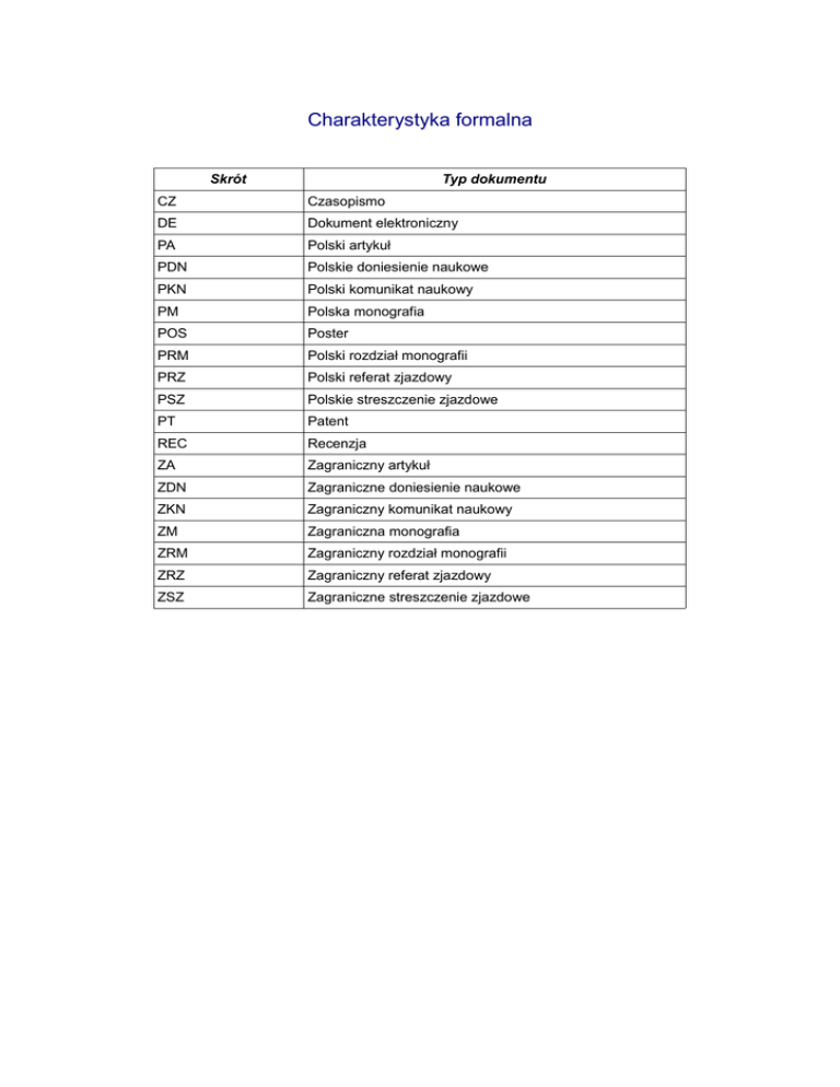 Charakterystyka formalna Skrót Typ dokumentu CZ Czasopismo DE Dokument elektroniczny PA Polski artykuł PDN Polskie doniesienie naukowe PKN Polski komunikat naukowy PM Polska monografia POS Poster PRM Polski rozdział monografii PRZ Polski referat zjazdowy PSZ Polskie streszczenie zjazdowe PT Patent REC Recenzja ZA Zagraniczny artykuł ZDN Zagraniczne doniesienie naukowe ZKN Zagraniczny komunikat naukowy ZM Zagraniczna monografia ZRM Zagraniczny rozdział monografii ZRZ Zagraniczny referat zjazdowy ZSZ Zagraniczne streszczenie zjazdowe