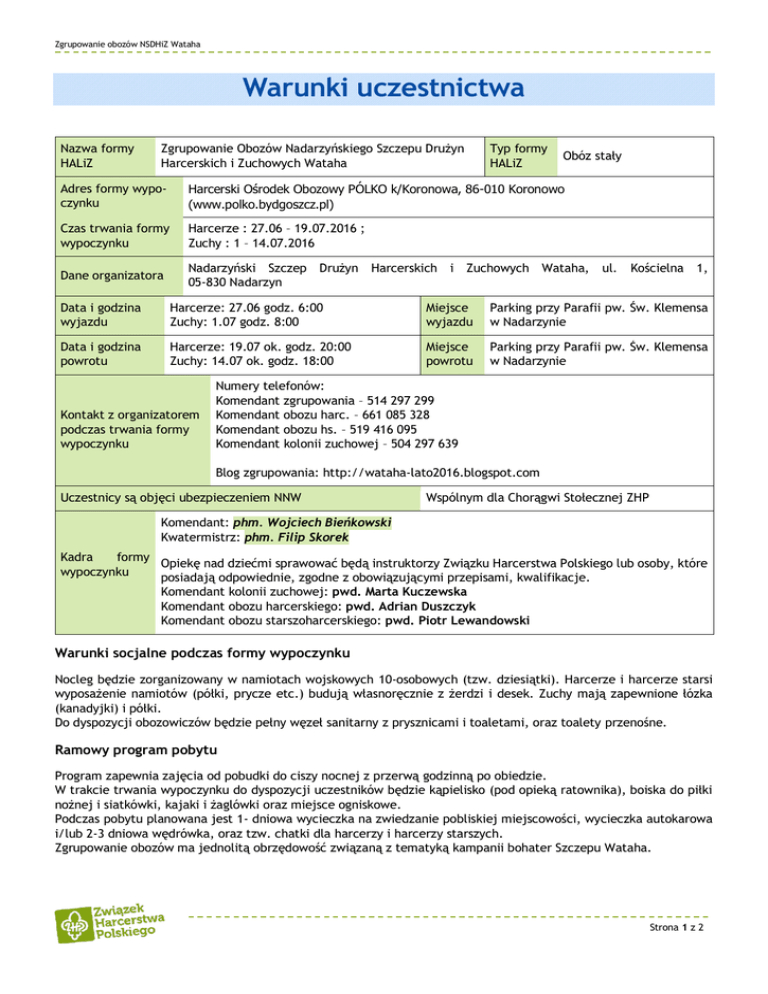 Zgrupowanie obozów NSDHiZ Wataha Warunki uczestnictwa Nazwa formy HALiZ Zgrupowanie Obozów Nadarzyńskiego Szczepu Drużyn Harcerskich i Zuchowych Wataha Typ formy HALiZ Obóz stały Adres formy wypoczynku Harcerski Ośrodek Obozowy PÓLKO k/Koronowa, 86-010 Koronowo (www.polko.bydgoszcz.pl) Czas trwania formy wypoczynku Harcerze : 27.06 – 19.07.2016 ; Zuchy : 1 – 14.07.2016 Dane organizatora Nadarzyński Szczep Drużyn Harcerskich i Zuchowych Wataha, ul. 05-830 Nadarzyn Kościelna 1, Data i godzina wyjazdu Harcerze: 27.06 godz. 6:00 Zuchy: 1.07 godz. 8:00 Miejsce wyjazdu Parking przy Parafii pw. Św. Klemensa w Nadarzynie Data i godzina powrotu Harcerze: 19.07 ok. godz. 20:00 Zuchy: 14.07 ok. godz. 18:00 Miejsce powrotu Parking przy Parafii pw. Św. Klemensa w Nadarzynie Kontakt z organizatorem podczas trwania formy wypoczynku Numery telefonów: Komendant zgrupowania – 514 297 299 Komendant obozu harc. – 661 085 328 Komendant obozu hs. – 519 416 095 Komendant kolonii zuchowej – 504 297 639 Blog zgrupowania: http://wataha-lato2016.blogspot.com Uczestnicy są objęci ubezpieczeniem NNW Wspólnym dla Chorągwi Stołecznej ZHP Komendant: phm. Wojciech Bieńkowski Kwatermistrz: phm. Filip Skorek Kadra formy Opiekę nad dziećmi sprawować będą instruktorzy Związku Harcerstwa Polskiego lub osoby, które wypoczynku posiadają odpowiednie, zgodne z obowiązującymi przepisami, kwalifikacje. Komendant kolonii zuchowej: pwd. Marta Kuczewska Komendant obozu harcerskiego: pwd. Adrian Duszczyk Komendant obozu starszoharcerskiego: pwd. Piotr Lewandowski Warunki socjalne podczas formy wypoczynku Nocleg będzie zorganizowany w namiotach wojskowych 10-osobowych (tzw. dziesiątki). Harcerze i harcerze starsi wyposażenie namiotów (półki, prycze etc.) budują własnoręcznie z żerdzi i desek. Zuchy mają zapewnione łózka (kanadyjki) i półki. Do dyspozycji obozowiczów będzie pełny węzeł sanitarny z prysznicami i toaletami, oraz toalety przenośne. Ramowy program pobytu Program zapewnia zajęcia od pobudki do ciszy nocnej z przerwą godzinną po obiedzie. W trakcie trwania wypoczynku do dyspozycji uczestników będzie kąpielisko (pod opieką ratownika), boiska do piłki nożnej i siatkówki, kajaki i żaglówki oraz miejsce ogniskowe. Podczas pobytu planowana jest 1- dniowa wycieczka na zwiedzanie pobliskiej miejscowości, wycieczka autokarowa i/lub 2-3 dniowa wędrówka, oraz tzw. chatki dla harcerzy i harcerzy starszych. Zgrupowanie obozów ma jednolitą obrzędowość związaną z tematyką kampanii bohater Szczepu Wataha. Strona 1 z 2 Warunki uczestnictwa Posiłki Liczba posiłków w ciągu dnia : cztery – śniadanie, obiad, podwieczorek, kolacja Sposób przygotowania: Posiłki są przygotowane przez wykwalifikowany personel zatrudniony na bazie. Wykaz niezbędnego wyposażenia uczestnika (dla harcerzy i harcerzy starszych): Mundur Plecak Plecak mniejszy np na wyjście do sklepu Karimata Prześcieradło Spodnie mundurowe Buty: - Wygodne na wędrówkę - Klapki nad jezioro - Buty na co dzień. Bluza ciepła Koszulki z krótkim rękawem Ubranie do zniszczenia na pionierce i depionierce Spodnie długie nie mundurowe Krótkie spodenki Bielizna Śpiwór Strój kąpielowy Nakrycie głowy Krem do opalania Strój obrzędowy! Latarka Śpiewnik Ewentualnie gitara Przybory do pisania Przybory toaletowe Menażka, niezbędnik, kubek Lina do wyplatania pryczy –50 m Warunki rezygnacji z uczestnictwa Uczestnik może zrezygnować z wyjazdu: - bez podania powodu – do momentu wpłacenia drugiej raty (do 1go maja) - po wykazaniu istotnej przyczyny: – do 1go czerwca – zwrotowi podlega kwota wpłaty pomniejszona 400 zł - po 1 czerwca – zwrotowi podlega tylko i wyłącznie ostatnia rata (jeśli została wpłacona) – 250 zł dla zuchów, 400 zł dla harcerzy W trakcie trwania wypoczynku, każdy uczestnik może być zabrany na żądanie rodziców/prawnych opiekunów po wypełnieniu stosownego oświadczenia. W takim wypadku, zwrotowi nie podlega żadna część kwoty wpłaty. Dodatkowe informacje Podczas Zgrupowania Obozów NSDHiZ Wataha uczestnicy mogą być zabierani z terenu obozu wyłącznie przez swych rodziców/opiekunów prawnych. Jeśli życzą sobie Państwo, by Państwa dziecko mogło być odebrane przez inne osoby (np. członków dalszej rodziny), niezbędne będzie złożenie takiej deklaracji w formie pisemnej w obecności przedstawiciela organizatora wypoczynku. W razie rażącego naruszenia przez uczestnika regulaminów zgrupowania ( dostępne do wglądu u komendanta), może on zostać dyscyplinarnie wydalony i odesłany do domu. W takim wypadku rodzic ma obowiązek bezzwłocznego odebrania dziecka. Bardzo prosimy o podanie kadrze (wpisanie w kartach kwalifikacyjnych) wszelkich informacji dotyczących stanu zdrowia dziecka, przyjmowanych leków, ewentualnych alergii itp. Uczestnicy nie mogą samodzielnie przyjmować i przechowywać żadnych lekarstw – należy je przekazać (opisane!) kadrze obozu przy wyjeździe. Informujemy, że w nagłych wypadkach będziemy podejmowali próby skontaktowania się z Państwem dostępnymi nam sposobami w oparciu o dane podane przez Państwa w karcie kwalifikacyjnej wraz z dodatkiem. Jeśli nie uda nam się nawiązać kontaktu, a sytuacja będzie tego wymagała, będziemy podejmowali wszelkie działania zmierzające do ochrony zdrowia i życia Państwa dziecka. W trakcie trwania obozu obowiązuje bezwzględny zakaz posiadania telefonów komórkowych i gier elektronicznych. Wszelkie pozostałe urządzenia elektroniczne uczestnik bierze na własną odpowiedzialność ( kadra nie odpowiada za ewentualne uszkodzenia, zgubienie itp.) i nie ma możliwości używania ich w trakcie trwania zajęć programowych. Strona 2 z 2
