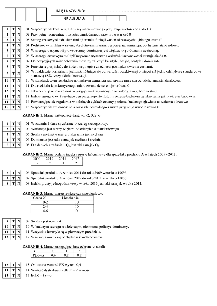 IMIĘ I NAZWISKO: ............................................................................................................................... NR ALBUMU: 1 2 3 4 5 6 7 8 T T T T T T T T 9 T N 10 11 12 13 14 15 T T T T T T N N N N N N N N N N N N N N 01. Współczynnik korelacji jest miarą niemianowaną i przyjmuje wartości od 0 do 100. 02. Przy pełnej koncentracji współczynnik Giniego przyjmuje wartość 0 03. Szereg czasowy składa się z funkcji trendu, funkcji wahań okresowych i „białego szumu” 04. Podstawowymi, klasycznymi, absolutnymi miarami dyspersji są: wariancja, odchylenie standardowe. 05. W szeregu o asymetrii prawostronnej dominanta jest większa w porównaniu ze średnią. 06. W szeregu czasowym multiplikatywne oczyszczone wskaźniki sezonowości sumują się do 0. 07. Do pozycyjnych miar położenia możemy zaliczyć kwartyle, decyle, centyle i dominantę. 08. Funkcja regresji służy do ilościowego opisu zależności pomiędzy dwiema cechami. 09. W rozkładzie normalnym jednostki różniące się od wartości oczekiwanej o więcej niż jedno odchylenie standardowe stanowią 68%. wszystkich obserwacji. 10. W standardowym rozkładzie normalnym wariancja jest zawsze mniejsza od odchylenia standardowego. 11. Dla rozkładu leptokurtycznego miara zwana ekscesem jest równa 0 12. Jako cechę jakościową można przyjąć wiek wyrażony jako: młody, stary, bardzo stary. 13. Indeks agregatowy Paaschego cen przyjmuje, że ilości w okresie badanym są takie same jak w okresie bazowym. 14. Powtarzające się regularnie w kolejnych cyklach zmiany poziomu badanego zjawiska to wahania okresowe 15. Współczynnik zmienności dla rozkładu normalnego zawsze przyjmuje wartość równą 0 ZADANIE 1. Mamy następujące dane: -6, -2, 0, 2, 6 1 2 3 4 5 T T T T T N N N N N 01. W zadaniu 1 dane są zebrane w szereg szczegółowy. 02. Wariancja jest 4 razy większa od odchylenia standardowego. 03. Średnia arytmetyczna jest taka sama jak mediana. 04. Dominanta jest taka sama jak mediana i średnia. 05. Dla danych z zadania 1 Q1 jest taki sam jak Q3 ZADANIE 2. Mamy podane indeksy proste łańcuchowe dla sprzedaży produktu A w latach 2009 - 2012: 2009 2010 2011 2012 2 1 2 6 7 8 T N T N T N 06. Sprzedaż produktu A w roku 2011 do roku 2009 wzrosła o 100% 07. Sprzedaż produktu A w roku 2012 do roku 2011 zmalała o 100% 08. Indeks prosty jednopodstawowy w roku 2010 jest taki sam jak w roku 2011. ZADANIE 3. Mamy szereg rozdzielczy przedziałowy: Cecha X Liczebności 0-2 10 2-4 10 4-6 0 9 10 11 12 T T T T N N N N 09. Średnia jest równa 4 10. W badanym szeregu rozdzielczym, nie można policzyć dominanty. 11. Wszystkie kwartyle są w pierwszym przedziale. 12. Wariancja równa się odchyleniu standardowemu ZADANIE 4. Mamy następujące dane zebrane w tabeli: X 0 1 2 P(X=x) 0.6 0.2 0.2 13 14 15 T N T N T N 13. Obliczona wartość EX wynosi 0,4 14. Wartość dystrybuanty dla X = 2 wynosi 1 15. E(5X – 3) = 0 1 2 3 T N T N T N 4 T N 5 T N 6 7 8 T N T N T N 9 T N 10 T N 01. Krzywa naniesiona na histogram nazywa się dystrybuantą empiryczną 02. Krzywa przechodząca przez środek najwyższych słupków jest konieczna do określenia wartości dominanty. 03. W takim przypadku dominanta zawsze wynosi 0. 04. Zakładając, że średnia wynosi 0, a wariancja 100. Na wykresie typowy obszar zmienności, obejmuje 4 słupki. Nie zawiera jedynie słupka o najmniejszej liczności. 05. Wartość minimalna cechy X wynosi 0, a maksymalna 35 06. Współczynnik korelacji jest mniejszy od zera 07. Jeżeli X wynosi 5 to Y wynosi 18 08. Stała regresji jest równa 6 09. Dla X równego 4 nie powinno się przeprowadzać prognozy, ponieważ nie obserwowano takich wartości w zakresie badanych X-ów 10. Jeżeli X wzrośnie o jednostkę to Y średnio zmaleje o 6