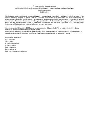 Program studiów drugiego stopnia na kierunku filologia angielska, specjalność Język i komunikacja w mediach i polityce Studia stacjonarne Od 2013/2014 Studia stacjonarne magisterskie, specjalność Język i komunikacja w mediach i polityce, trwają 4 semestry. Plan studiów obejmuje zajęcia w formie wykładów, ćwiczeń, konwersatoriów i seminariów. W planie wyróżnione są przedmioty podstawowe, uzupełniające i przedmioty do wyboru związane ze specjalnością. Po dokonaniu wyboru student jest zobowiązany do zaliczenia wybranych przedmiotów. Oprócz przedmiotów wyszczególnionych w planie, każdy student rozpoczynający studia na UAM jest zobowiązany do zaliczenia kursu BHP oraz kursu Edukacja informacyjna i źródłowa (kursy przeprowadzane w formie e-learningu). Student uzyskuje 120 punktów ECTS po zakończeniu studiów (60 punktów ECTS za każdy rok studiów). Studia kończą się uzyskaniem tytułu zawodowego magistra. Szczegółowe informacje na temat liczby godzin, formy zajęć, formy zaliczenia i liczby punktów ECTS znajdują się w siatkach godzin poniżej. Zaliczenie przedmiotu ma w każdym przypadku formę zaliczenia z oceną. Oznaczenia w siatkach: Ćw - ćwiczenia W – wykład K – konwersatorium S – seminarium Egz. – egzamin Zal. – zaliczenie Egz. mgr. – egzamin magisterski (1MA LANCOM 2013-2014) l.p. Nazwa przedmiotu Forma zajęć Liczba godzin Forma zaliczenia Punkty ECTS Kod ROK I, SEMESTR I Przedmioty podstawowe 1. Praktyczna nauka języka angielskiego Ćw 60 Zal. 7 15-PNJA-SPK-JIK-12 15-PNJA-WR-JIK-12 2. Wstęp do Unii Europejskiej W 30 Zal. 4 15-WDUE-JIK-12 3. Seminarium przedmiotowe 1: Wstęp do analizy tekstu i dyskursu S 30 Zal. 4 15-SP1-WDATID-JIK-11 4. Wykład 1: Wstęp do teorii komunikacji W 30 Zal. 4 15-WDRK-JIK-11 Przedmioty do wyboru 5. Lektorat z języka obcego (do wyboru jeden z listy) Ćw 30 Zal. 2 15-LJO-14 6. Seminarium magisterskie (wybór przy rekrutacji) S 30 Zal. 5 15-SM-14 7 Metodologia badań lingwistycznych LUB Metodologia badań literackich W 30 Zal. 4 15-MBLIN-JIK-11 lub 15-MBLIT-JIK-11 Przedmioty nadobowiązkowe 8. Praktyczna nauka języka angielskiego (fonetyka korekcyjna) Ćw 30 Zal. 1 15-PNJA-GK-JIK-12 9 Praktyczna nauka języka angielskiego (gramatyka korekcyjna) Ćw 30 Zal. 1 15-PNJA-FK-JIK-12 RAZEM i SEMESTR 300 30/32 ROK I, SEMESTR II Przedmioty podstawowe 1. Praktyczna nauka języka angielskiego Ćw 90 Egz. 7 15-PNJA-SPK-JIK-22 15-PNJA-WR-JIK-22 15-PNJA-AWR-JIK-11 2. Wstęp do Unii Europejskiej W 30 Egz. 4 15-WDUE-JIK-22 3. Seminarium przedmiotowe 2: Media i kultura S 30 Zal 4 15-SP2-MIK-JIK-11 4. Wykład 2: Tekst reklamowy W 30 Zal. 4 15-TREKL-JIK-11 5. Wykład 3: Reklama Polityczna W 30 Zal. 4 15-RPOL-JIK-11 Przedmioty do wyboru 6. Lektorat z języka obcego (kontynuacja wybranego lektoratu) Ćw 30 Egz. 2 15-LJO-24 7. Seminarium magisterskie (kontynuacja wybranego seminarium) S 30 Zal. 5 15-SM-24 8. Statystyka w badaniach naukowych LUB Najnowsze teorie w literaturoznawstwie K 30 Zal. 2 15-SWBN-JIK-11 lub 15-NTWL-JIK-11 Przedmioty nadobowiązkowe 9. Praktyczna nauka języka angielskiego (fonetyka korekcyjna Ćw 30 Zal. 1 15-PNJA-GK-JIK-22 10. Praktyczna nauka języka angielskiego (gramatyka korekcyjna) Ćw. 30 Zal 1 15-PNJA-FK-JIK-22 RAZEM II SEMESTR 360 30/32 RAZEM I ROK 660 60/64 (2MA LANCOM 2014-2015) l.p. Nazwa przedmiotu Forma zajęć Liczba godzin Forma zaliczenia Punkty ECTS Kod ROK II, SEMESTR III Przedmioty obowiązkowe 1. Dyskurs akademicki Ćw 30 Zal. 5 15-DYSAKA-JIK-12 2. Seminarium uzupełniające 1: Kognitywna Analiza Dyskursu S 30 Zal. 3 15-SU1-KAD-JIK-11 3. Seminarium Przedmiotowe 3: Ideologie i wartości w mediach S 30 Zal. 2 15-SP3-IIWWDM-JIK-11 4. Wykład 4: Komunikacja w Unii Europejskiej W 30 Zal. 2 5. Wykład 5: Wstęp do organizacji międzynarodowych W 30 Zal 3 6. Dziennikarstwo internetowe K 30 Zal 3 15-DINT-JIK-11 7. Pisanie Dziennikarskie K 30 Zal 3 15-PDZI-JIK-12 30 Zal. 9 15-SM-34 15-KWUE-JIK-11 15-WDOM-JIK-11 Przedmioty do wyboru 8. Seminarium magisterskie (kontynuacja wybranego seminarium) S RAZEM III SEMESTR 240 30 ROK II SEMESTR IV Przedmioty obowiązkowe 1. Seminarium uzupełniające 2: Gender w komunikacji: media i reklama S 30 Zal. 3 15-SU2-GWKMIR-JIK11 2. Seminarium Przedmiotowe 4: Komunikacja za pośrednictwem nowych mediów S 30 Zal. 3 15-SP4-KZPNM-JIK-11 3. Wykład 6: Perswazja w mediach W 30 Zal. 3 15-PWM-JIK-11 4. Wykład 7: Public relations W 30 Zal. 3 15-PREL-JIK-11 5. Pisanie Dziennikarskie K 30 Zal. 3 15-PDZI-JIK-22 30 Egz. mgr. 15 15-SM-44 Przedmioty do wyboru 6. Seminarium magisterskie S RAZEM IV SEMESTR 180 30 RAZEM II ROK 420 60