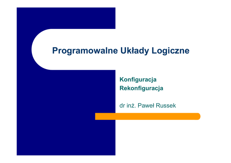 Programowalne Układy Logiczne Konfiguracja Rekonfiguracja dr inż. Paweł Russek Program wykładu Technologie Metody konfigurowania PLD Zaawansowane metody konfigurowania FPGA Rekonfigurowalne systemy obliczeniowe Pamięć konfiguracji Technologie Programowanie EPROM. EEPROM Programator EPROM/EEPROM Swobodny dostęp do pamięci konfiguracji Wykorzystanie wszystkich pinów Konieczny adaptor Gang-programatory Rozwiązanie uniwersalne Konieczne ciągłe wsparcie producenta ISP. EEPROM/FLASH In System Programming, In System Configuration Szeregowy dostęp do danych Boundary Scan. JTAG Brak fizycznego kontaktu z końcówkami układu scalonego Interfejs JTAG IEEE1532/IEEE1149.1(JTAG) Rozwiązanie relatywnie wolne Prototypowanie/serwis Daisy-chain Oprogramowanie IMPACT Pliki programujące JEDEC Files are XC9500 family programming files generated by the Xilinx fitter. BSDL. The Boundary-Scan Description Language (BSDL) files describe the boundary scan features of a device. BIT Files are Xilinx FPGA configuration files generated by the Xilinx FPGA design software. Programowanie FPGA Tryby programowania ISP Zewnętrzna pamięć Dedykowany mikrokontroler Serial Flash PROM Xilinx Platform FLASH PROM Wydajność systemu rekonfigurowalnego Od 300k bitów do 30M bitów danych konfiguracyjnych Wydajność spada przy konieczności częstej podmiany konfiguracji Układy wielokontekstowe Akceleracja sprzętowa = Czas realizacji algorytmu przez procesor Czas realizacji algorytmu przez FPGA + Czas konfiguracji FPGA Konfigu racja 4 3 2 1 FPGA Konfiguracja CPLD: „On the Fly” Relatywnie długi czas programowania Pamięć nieulotna NV i ulotna V Nie zakłóca pracy układu IMPACT „On the Fly” Zapis do pamięci nieulotnej Po zapisie układ pracuje zgodnie ze „starą” konfiguracją Nowa konf. może być później aktywowana „On the Fly” zastosowanie W wielu zastosowaniach CPLD pracuje z kilkoma przełączanymi konfiguracjami Aplikacje: – Programowalna matryca komutacyjna – Programowanie FPGA Częściowa rekonfiguracja Oszczędność czasu Swobodny dostęp do danych FPGA. Możliwość odczytu konfiguracji Problemy z DRC ??? bit1 bit2 ∆bit Rodzina XC6200 XC6216, XC6264 Interface FastMAP. Pamięć konfiguracji dostępna tak jak zwykła pamięć RAM Dostępu szeregowy i równoległy Odczyt i zapis Atmel AT40K FPGA Zgodne z rodziną XC4000 Częściowa rekonfiguracja Kompresja pliku konfiguracyjnego Run Time Reconfiguration - RTR Niezakłócona praca układu podczas rekonfiguracji jego części. Konfiguracja Virtex FPGA Tryby programowania Struktura pliku bit Kolumnowa organizacja pamięci konfiguracji. Cechy rodziny Virtex SelectMap RTR. Możliwość konfiguracji części struktury podczas gdy reszta ciągle pracuje. Minimalny kwant konfiguracji to ramka Możliwe 2 tryby rekonfiguracji: – Modułowa. Kiedy ,moduły są całkowicie niezależne – Różnicowa. Kiedy wprowadzamy tylko niewielkie różnice do konfiguracji Wysokość rekonfigurowalnego modułu jest zawsze pełną wysokością struktury, a szerokość to wielokrotność 4 kolumn CLB Modular Design. Bus Macro Dla konfiguracji gdzie moduły muszą się ze sobą komunikować Modular Design Projektowanie w zespołach wielu ludzi Projektowanie dla RTR