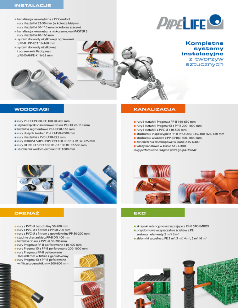 INSTALACJE r kanalizacja wewnętrzna z PP Comfort rury i kształtki 32-50 mm (w kolorze białym) rury i kształtki 50-110 mm (w kolorze szarym) r kanalizacja wewnętrzna niskoszumowa MASTER 3 rury i kształtki 40-160 mm r system do wody użytkowej i ogrzewania z PP-R i PP-RCT 16-160 mm r system do wody użytkowej i ogrzewania Radopress z PE-X/Al/PE-X 16-63 mm INSTALACJE WODOCIĄGI Kompletne systemy instalacyjne z tworzyw sztucznych KANALIZACJA r rury PE-HD: PE 80, PE 100 20-400 mm r szybkozłączki ciśnieniowe do rur PE-HD 20-110 mm r k ształtki segmentowe PE-HD 90-160 mm r rury dużych średnic PE-HD 450-2000 mm r rury i kształtki z PVC-U 90-225 mm r rury ROBUST SUPERPIPE z PE100 RC/PP-HM 32-225 mm r r ury HERKULES z PE100 RC /PE100 RC 32-500 mm r studzienki wodomierzowe z PE 1000 mm r r ury i kształtki Pragma z PP-B 160-630 mm r r ury i kształtki Pragma+ID z PP-B 200-1000 mm r rury i kształtki z PVC-U 110-500 mm r studzienki inspekcyjne z PP-B PRO: 200, 315, 400, 425, 630 mm r s tudzienki włazowe z PP-B PRO: 800, 1000 mm r zwieńczenia teleskopowe w klasie A15-D400 r włazy kanałowe w klasie A15-D400 Rury perforowane Pragma patrz grupa Drenaż DRENAŻ EKO r rury z PVC-U bez otuliny 50-200 mm r rury z PVC-U z filtrem z PP 50-200 mm r rury z PVC-U z filtrem z geowłókniny PP 50-200 mm r s tudnie drenarskie z PP-B DN 400 mm r kształtki do rur z PVC-U 50-200 mm r rury Pragma z PP-B perforowane 110-400 mm r rury Pragma+ID z PP-B perforowane 200-1000 mm r rury Pragma z PP-B peforowane 160-200 mm w filtrze z geowłókniny r rury Pragma+ID z PP-B peforowane w filtrze z geowłókniny 200-800 mm r s krzynki retencyjno-rozsączające z PP-B STORMBOX rp rzydomowe oczyszczalnie ścieków z PE zestawy i elementy 2 m3 i 3 m3 r z biorniki szczelne z PE 2 m3, 3 m3, 4 m3, 5 m3 i 6 m3 Przedstawiciele regionalni Składy Fabryczne Pipelife Aby ułatwić Państwu kontakt z naszą firmą, podajemy numery telefonów do przedstawicieli Pipelife w różnych regionach kraju. Kierownicy Regionów Sprzedaży chętnie odpowiedzą na Państwa wszystkie pytania dotyczące produktów Pipelife oraz udostępnią Katalog Techniczny. Jesteśmy blisko Ciebie! Nieustannie doskonalimy poziom obsługi Klienta naszej firmy. Chcąc być bliżej Odbiorców stale rozbudowujemy sieć dystrybucji na terenie całego kraju. Nasz wykwalifikowany, profesjonalny zespół służy Klientom ciągłą pomocą. Białystok ul. Elewatorska 29 tel. (85) 652 28 11 fax (85) 651 85 39 Opole ul. Armii Krajowej 36 tel. (77) 402 52 58 fax (77) 402 52 59 Bydgoszcz ul. Ołowiana 12 tel. (52) 321 24 95 fax (52) 569 10 05 Ostrów Wielkopolski ul. Bema 186 tel: (62) 733 46 38 fax: (62) 594 06 38 Bytom - Radzionków ul. Strzelców Bytomskich 100 tel. (32) 289 32 32 fax (32) 387 17 51 Poznań ul. Lutycka 107-109 tel./fax (61) 816 21 32 Gdynia ul. Hutnicza 35 tel. (58) 662 35 32 fax (58) 662 35 42 Gorzów Wielkopolski ul. Słowiańska 61 tel. (95) 728 83 67 fax (95) 728 83 68 tel. 606 112 010 tel. 606 915 595 tel. 606 112 033 Region 4 tel. 606 112 055 Region 5 tel. 602 132 015 tel. 660 412 432 Region 1 Region 2 Region 3 Region 6 Jelenia Góra ul. Spółdzielcza 33 B tel. (75) 752 55 50 fax (75) 752 55 51 Koszalin ul. Szczecińska 65 tel. (94) 310 84 23 fax (94) 355 60 65 Kraków - Rudawa Kochanów, ul. Lubomirskich 116 tel. (12) 653 43 29 fax (12) 653 43 25 Lublin ul. Mełgiewska 80 tel. (81) 749 66 90 fax (81) 749 66 91 Łódź - Rzgów ul. Rudzka 2 tel. (42) 214 23 32 tel./fax (42) 227 15 72 Aprobaty Wzorową jakość naszych produktów potwierdzają aprobaty techniczne i świadectwa, zarówno polskie jak i zagraniczne. Posiadamy stale aktualizowaną Bibliotekę Aprobat Technicznych. Dokumenty te są dostępne na naszej stronie www.pipelife.pl. Olsztyn ul. Towarowa 21 tel. (89) 532 27 70 fax (89) 722 81 20 Radom ul. Czarnieckiego 136 tel. (48) 365 53 92 fax (48) 365 54 67 Rzeszów ul. Połonińska 7 tel. (17) 864 02 02 fax (17) 864 02 03 Szczecin - Mierzyn ul. Welecka 22 E tel. (91) 486 91 93 fax (91) 486 91 94 Toruń ul. Nieszawska 13 E tel. (56) 612 60 15 fax (56) 621 98 39 Tychy ul. Centralna 56 43-210 Kobiór tel. (32) 216 73 65 fax (32) 722 03 65 Warszawa ul. Modlińska 205 tel. (22) 853 75 01 tel. (22) 847 39 61 fax (22) 355 28 55 Wrocław ul. Tyska 2/6 tel. (71) 785 60 31 fax (71) 785 60 30 Referencje Grono naszych zadowolonych Klientów stale się powiększa. Dowodem na to jest coraz obszerniejsza lista referencji. Dokumenty te dostępne są we wszystkich naszych Składach Fabrycznych jak również u Kierowników Regionów Sprzedaży. Pipelife Polska S.A. Kartoszyno, ul. Torfowa 4, 84-110 Krokowa tel.: (+ 48 58) 77 48 888, fax: (+ 48 58) 77 48 807 E-mail: [email protected] www.pipelife.pl