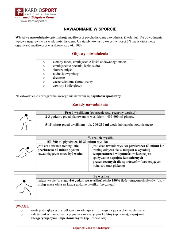 dr n. med. Zbigniew Krenc www.kardiosport.pl NAWADNIANIE W SPORCIE Właściwe nawodnienie optymalizuje możliwości psychofizyczne zawodnika. Z kolei już 1% odwodnienie wpływa negatywnie na wydolność fizyczną. Utrata płynów ustrojowych w ilości 2% masy ciała może ograniczyć możliwości wysiłkowe aż o ok. 10%. Objawy odwodnienia o o o o o o o ciemny mocz, zmniejszenie ilości oddawanego moczu zmniejszenie pocenia, lepka skóra skurcze mięśni nudności/wymioty dreszcze zaczerwieniona skóra twarzy zawroty i bóle głowy Na odwodnienie i przegrzanie szczególnie narażeni są najmłodsi sportowcy. Zasady nawadniania Przed wysiłkiem (tworzenie tzw. rezerwy wodnej) 2-3 godziny przed planowanym wysiłkiem - 400-600 ml płynów 5-15 minut przed wysiłkiem - ok. 200-250 ml wody lub napoju izotonicznego W trakcie wysiłku 150-300 ml płynów co 15-20 minut wysiłku jeśli czas trwania treningu nie jeśli czas trwania wysiłku przekracza 60 minut lub przekracza 60 minut płynem trening odbywa się w miejscu o wysokiej nawadniającym może być woda; temperaturze i wilgotności wskazane jest spożywanie napojów izotonicznych przeznaczonych dla sportowców (zawierających m.in. sód oraz glukozę) Po wysiłku należy wypić (w ciągu 4-6 godzin po wysiłku) około 150% ilości utraconych płynów (ok. 4 ml/kg masy ciała na każdą godzinę wysiłku fizycznego) UWAGI: o woda jest najlepszym środkiem nawadniającym z uwagi na jej szybkie wchłanianie o należy unikać nawadniania płynami zawierającymi kofeinę (np. kawa), napojami energetyzującymi i hipertonicznymi (np. Coca-Cola) Copyright 2013 © Kardiosport