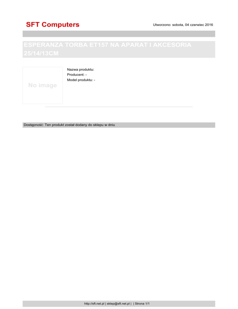SFT Computers Utworzono: sobota, 04 czerwiec 2016 ESPERANZA TORBA ET157 NA APARAT I AKCESORIA 25/14/13CM Nazwa produktu: Producent: Model produktu: - No image Dostępność: Ten produkt został dodany do sklepu w dniu http://sft.net.pl | [email protected] | | Strona 1/1
