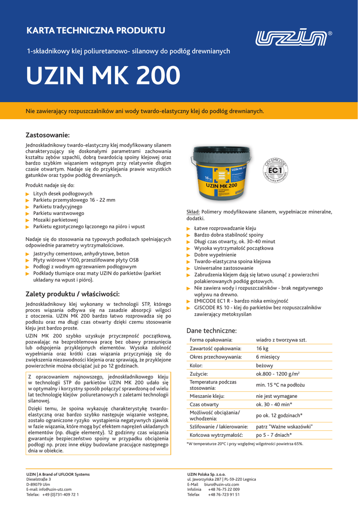 KARTA TECHNICZNA PRODUKTU 1-składnikowy klej poliuretanowo- silanowy do podłóg drewnianych UZIN MK 200 Nie zawierający rozpuszczalników ani wody twardo-elastyczny klej do podłóg drewnianych. Zastosowanie: ® GE MIC V-E OD E Jednoskładnikowy twardo-elastyczny klej modyfikowany silanem charakteryzujący się doskonałymi parametrami zachowania kształtu zębów szpachli, dobrą twardością spoiny klejowej oraz bardzo szybkim wiązaniem wstępnym przy relatywnie długim czasie otwartym. Nadaje się do przyklejania prawie wszystkich gatunków oraz typów podłóg drewnianych. Produkt nadaje się do: ÷ ÷ ÷ ÷ ÷ ÷ Litych desek podłogowych Parkietu przemysłowego 16 - 22 mm Parkietu tradycyjnego Parkietu warstwowego Mozaiki parkietowej Parkietu egzotycznego łączonego na pióro i wpust Nadaje się do stosowania na typowych podłożach spełniających odpowiednie parametry wytrzymałościowe. ÷ ÷ ÷ ÷ Jastrychy cementowe, anhydrytowe, beton Płyty wiórowe V100, przeszlifowane płyty OSB Podłogi z wodnym ogrzewaniem podłogowym Podkłady tłumiące oraz maty UZIN do parkietów (parkiet układany na wpust i pióro). Zalety produktu / właściwości: Jednoskładnikowy klej wykonany w technologii STP, którego proces wiązania odbywa się na zasadzie absorpcji wilgoci z otoczenia. UZIN MK 200 bardzo łatwo rozprowadza się po podłożu oraz ma długi czas otwarty dzięki czemu stosowanie kleju jest bardzo proste. UZIN MK 200 szybko uzyskuje przyczepność początkową, pozwalając na bezproblemowa pracę bez obawy przesunięcia lub odspojenia przyklejonych elementów. Wysoka zdolność wypełniania oraz krótki czas wiązania przyczyniają się do zwiększenia niezawodności klejenia oraz sprawiają, że przyklejone powierzchnie można obciążać już po 12 godzinach. Z opracowaniem najnowszego, jednoskładnikowego kleju w technologii STP do parkietów UZIN MK 200 udało się w optymalny i korzystny sposób połączyć sprawdzoną od wielu lat technologię klejów poliuretanowych z zaletami technologii silanowej. Dzięki temu, że spoina wykazuję charakterystykę twardoelastyczną oraz bardzo szybko następuje wiązanie wstępne, zostało ograniczone ryzyko wystąpienia negatywnych zjawisk w fazie wiązania, które mogą być efektem naprężeń układanych elementów (np. długie elementy). 12 godzinny czas wiązania gwarantuje bezpieczeństwo spoiny w przypadku obciążenia podłogi np. przez inne ekipy budowlane pracujące następnego dnia w obiekcie. UZIN | A Brand of UFLOOR Systems Dieselstraße 3 D-89079 Ulm E-mail: [email protected] Telefax: +49 (0)731-409 72 1 Skład: Polimery modyfikowane silanem, wypełniacze mineralne, dodatki. ÷ ÷ ÷ ÷ ÷ ÷ ÷ ÷ ÷ ÷ ÷ Łatwe rozprowadzanie kleju Bardzo dobra stabilność spoiny Długi czas otwarty, ok. 30-40 minut Wysoka wytrzymałość początkowa Dobre wypełnienie Twardo-elastyczna spoina klejowa Uniwersalne zastosowanie Zabrudzenia klejem dają się łatwo usunąć z powierzchni polakierowanych podłóg gotowych. Nie zawiera wody i rozpuszczalników - brak negatywnego wpływu na drewno. EMICODE EC1 R - bardzo niska emisyjność GISCODE RS 10 - klej do parkietów bez rozpuszczalników zawierający metoksysilan Dane techniczne: Forma opakowania: wiadro z tworzywa szt. Zawartość opakowania: 16 kg Okres przechowywania: 6 miesięcy Kolor: beżowy Zużycie: Temperatura podczas stosowania: Mieszanie kleju: ok.800 - 1200 g/m2 Czas otwarty Możliwość obciążania/ wchodzenia: Szlifowanie / lakierowanie: ok. 30 - 40 min* Końcowa wytrzymałość: po 5 - 7 dniach* min. 15 °C na podłożu nie jest wymagane po ok. 12 godzinach* patrz "Ważne wskazówki" *W temperaturze 20°C i przy względnej wilgotności powietrza 65%. UZIN Polska Sp. z.o.o. ul. Jaworzyńska 287 | PL-59-220 Legnica E-Mail [email protected] Infolinia +48 76-75 22 009 Telefax +48 76-723 91 51 UZIN MK 200 Przygotowanie podłoża: Podłoże musi być równe, mocne, suche, bez spękań, czyste i wolne od substancji mogących zmniejszać przyczepność. Jastrychy cementowe i anhydrytowe należy przeszlifować i odkurzyć. Podłoże należy sprawdzić w oparciu o obowiązujące normy i odpowiednie instrukcje. W razie stwierdzenia niezgodności należy zgłosić zastrzeżenia. W przypadku prac parkieciarskich zaleca się szczególnie staranne sprawdzenie podłoża. Warstwy niestabilne lub zmniejszające przyczepność należy usunąć poprzez szczotkowanie, szlifowanie, frezowanie lub śrutowanie. Odspojone fragmenty oraz pył należy dokładnie odkurzyć. Chłonne i porowate podłoża należy zagruntować 1-składnikowym szybkim gruntem poliuretanowym UZIN PE 414 Turbo lub 2-składnikową, epoksydową żywicą UZIN PE 460 lub PE 480. Przestrzegać właściwego czasu schnięcia gruntu odpowiedniego do klejenia parkietu. Podłoża bardzo nierówne lub zbyt chropowate należy po oczyszczeniu zagruntować gruntem uniwersalnym UZIN PE 360, a następnie wyszpachlować masą pod parkiet UZIN NC 174 na grubość co najmniej 3 mm lub masą szpachlową UZIN NC 172 Bi Turbo na grubość co najmniej 2 mm. Ważne wskazówki: ÷ ÷ ÷ ÷ ÷ Podczas pracy należy przestrzegać wskazówek zawartych w kartach technicznych stosowanych produktów. ÷ Sposób stosowania: 1. Zawartość opakowania doprowadzić do temperatury pokojowej. Po otwarciu opakowania wyjąć pochłaniacz wilgoci, zdjąć aluminiową folię zabezpieczającą. Usunąć z powierzchni kleju ewentualną związaną skórkę. Klej nie wymaga mieszania. Klej równomiernie rozprowadzić po podłożu przy pomocy odpowiedniej szpachli zębatej. Nakładać tylko na takiej powierzchni, jaka może być przykryta parkietem w ciągu ok. 2025 min. 2.Elementy parkietu układać na kleju lekko je dociskając i przesuwając w płaszczyźnie poziomej, pamiętając o optymalnym zwilżeniu klejem całej powierzchni spodu klepek. 3.Wskazówka: Podczas pracy z elementami fabrycznie lakierowanymi ewentualne zabrudzenia należy natychmiast