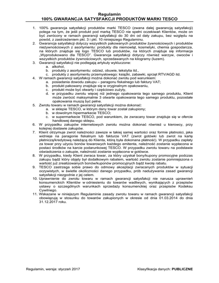 Regulamin 100% GWARANCJA SATYSFAKCJI PRODUKTÓW MARKI TESCO 1. 100% gwarancja satysfakcji produktów marki TESCO (zwana dalej gwarancją satysfakcji) polega na tym, że jeśli produkt pod marką TESCO nie spełni oczekiwań Klientów, może on być zwrócony w ramach gwarancji satysfakcji do 30 dni od daty zakupu, bez względu na powód, z zastrzeżeniem pkt. 3 i pkt. 10 niniejszego Regulaminu. 2. Gwarancja satysfakcji dotyczy wszystkich pakowanych produktów żywnościowych i produktów nieżywnościowych z asortymentu: produkty dla niemowląt, kosmetyki, chemia gospodarcza, na których znajduje się logo TESCO lub produktów, na których znajduje się informacja „Wyprodukowano dla TESCO”. Gwarancja satysfakcji dotyczy również warzyw, owoców i wszystkich produktów żywnościowych, sprzedawanych na kilogramy (luzem). 3. Gwarancji satysfakcji nie podlegają artykuły wykluczone: a. alkohol, b. produkty z asortymentu: odzież, obuwie, tekstylia itd., c. produkty z asortymentu przemysłowego: książki, zabawki, sprzęt RTV/AGD itd. 4. W ramach gwarancji satysfakcji można dokonać zwrotu pod warunkiem: a. posiadania dowodu zakupu – paragonu fiskalnego lub faktury VAT; b. produkt pakowany znajduje się w oryginalnym opakowaniu, c. produkt może być otwarty i częściowo zużyty, d. w przypadku zwrotu więcej niż jednego opakowania tego samego produktu, Klient może zwrócić maksymalnie 3 otwarte opakowania tego samego produktu, pozostałe opakowania muszą być pełne. 5. Zwrotu towaru w ramach gwarancji satysfakcji można dokonać: a. w sklepie TESCO, w którym dany towar został zakupiony; b. w dowolnym hipermarkecie TESCO; c. w supermarkecie TESCO, pod warunkiem, że zwracany towar znajduje się w ofercie handlowej danego sklepu. 6. W przypadku zakupów internetowych zwrotu można dokonać również u kierowcy, przy kolejnej dostawie zakupów. 7. Klient otrzymuje zwrot należności zawsze w takiej samej wartości oraz formie płatności, jaka widnieje na paragonie fiskalnym lub fakturze VAT (zwrot gotówki lub zwrot na kartę płatniczą/kredytową należącą do Klienta, którą była dokonana płatność). W przypadku zapłaty za towar przy użyciu bonów towarowych każdego emitenta, należność zostanie wypłacona w postaci środków na karcie podarunkowej TESCO. W przypadku zwrotu towaru na podstawie oświadczenia o zakupie, należność zostanie wypłacona w gotówce. 8. W przypadku, kiedy Klient zwraca towar, za który uzyskał bony/kupony promocyjne podczas zakupu bądź który objęty był dodatkowym rabatem, wartość zwrotu zostanie pomniejszona o wartość już zrealizowanych bonów/kuponów promocyjnych bądź kwotę rabatu. 9. TESCO zastrzega sobie prawo do odmowy akceptacji zwracanych produktów w sytuacji oczywistych, w świetle okoliczności danego przypadku, prób nadużywania zasad gwarancji satysfakcji niezgodnie z jej celem. 10. Uprawnienie do zwrotu towaru w ramach gwarancji satysfakcji nie narusza uprawnień konsumenckich Klientów w odniesieniu do towarów wadliwych, wynikających z przepisów ustawy o szczególnych warunkach sprzedaży konsumenckiej oraz przepisów Kodeksu Cywilnego. 11. Wskazane w niniejszym Regulaminie zasady zwrotu towaru w ramach gwarancji satysfakcji obowiązują w stosunku do towarów zakupionych w okresie od dnia 01.03.2014 do dnia 31.12.2017 roku. Regulamin, wersja: styczeń 2017 Klasyfikacja danych: PUBLICZNE