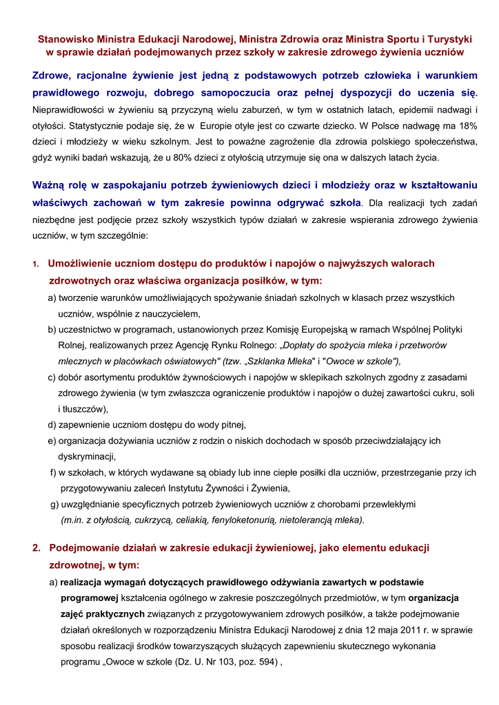 Stanowisko Ministra Edukacji Narodowej, Ministra Zdrowia oraz Ministra Sportu i Turystyki w sprawie działań podejmowanych przez szkoły w zakresie zdrowego żywienia uczniów Zdrowe, racjonalne żywienie jest jedną z podstawowych potrzeb człowieka i warunkiem prawidłowego rozwoju, dobrego samopoczucia oraz pełnej dyspozycji do uczenia się. Nieprawidłowości w żywieniu są przyczyną wielu zaburzeń, w tym w ostatnich latach, epidemii nadwagi i otyłości. Statystycznie podaje się, że w Europie otyłe jest co czwarte dziecko. W Polsce nadwagę ma 18% dzieci i młodzieży w wieku szkolnym. Jest to poważne zagrożenie dla zdrowia polskiego społeczeństwa, gdyż wyniki badań wskazują, że u 80% dzieci z otyłością utrzymuje się ona w dalszych latach życia. Ważną rolę w zaspokajaniu potrzeb żywieniowych dzieci i młodzieży oraz w kształtowaniu właściwych zachowań w tym zakresie powinna odgrywać szkoła. Dla realizacji tych zadań niezbędne jest podjęcie przez szkoły wszystkich typów działań w zakresie wspierania zdrowego żywienia uczniów, w tym szczególnie: 1. Umożliwienie uczniom dostępu do produktów i napojów o najwyższych walorach zdrowotnych oraz właściwa organizacja posiłków, w tym: a) tworzenie warunków umożliwiających spożywanie śniadań szkolnych w klasach przez wszystkich uczniów, wspólnie z nauczycielem, b) uczestnictwo w programach, ustanowionych przez Komisję Europejską w ramach Wspólnej Polityki Rolnej, realizowanych przez Agencję Rynku Rolnego: „Dopłaty do spożycia mleka i przetworów mlecznych w placówkach oświatowych" (tzw. „Szklanka Mleka" i "Owoce w szkole"), c) dobór asortymentu produktów żywnościowych i napojów w sklepikach szkolnych zgodny z zasadami zdrowego żywienia (w tym zwłaszcza ograniczenie produktów i napojów o dużej zawartości cukru, soli i tłuszczów), d) zapewnienie uczniom dostępu do wody pitnej, e) organizacja dożywiania uczniów z rodzin o niskich dochodach w sposób przeciwdziałający ich dyskryminacji, f) w szkołach, w których wydawane są obiady lub inne ciepłe posiłki dla uczniów, przestrzeganie przy ich przygotowywaniu zaleceń Instytutu Żywności i Żywienia, g) uwzględnianie specyficznych potrzeb żywieniowych uczniów z chorobami przewlekłymi (m.in. z otyłością, cukrzycą, celiakią, fenyloketonurią, nietolerancją mleka). 2. Podejmowanie działań w zakresie edukacji żywieniowej, jako elementu edukacji zdrowotnej, w tym: a) realizacja wymagań dotyczących prawidłowego odżywiania zawartych w podstawie programowej kształcenia ogólnego w zakresie poszczególnych przedmiotów, w tym organizacja zajęć praktycznych związanych z przygotowywaniem zdrowych posiłków, a także podejmowanie działań określonych w rozporządzeniu Ministra Edukacji Narodowej z dnia 12 maja 2011 r. w sprawie sposobu realizacji środków towarzyszących służących zapewnieniu skutecznego wykonania programu „Owoce w szkole (Dz. U. Nr 103, poz. 594) , b) wdrażanie dodatkowych programów edukacyjnych, dotyczących prawidłowego odżywiania się dzieci i młodzieży; dokonywanie ewaluacji wyników realizacji tych programów, c) umożliwianie nauczycielom i innym pracownikom szkoły udziału w różnych formach doskonalenia zawodowego w zakresie zdrowego żywienia, d) podejmowanie współpracy na poziomie lokalnym (z rodzicami, jednostką samorządu terytorialnego, społecznością lokalną). Powyższe działania zostały opracowane w wyniku współpracy Ministerstwa Edukacji Narodowej, Ministerstwa Zdrowia oraz Ministerstwa Sportu i Turystyki podjętej na podstawie podpisanego w dniu 23 listopada 2009 r. Porozumienia o współpracy między Ministrem Edukacji Narodowej, Ministrem Zdrowia i Ministrem Sportu i Turystyki w sprawie promocji zdrowia i profilaktyki problemów dzieci i młodzieży.