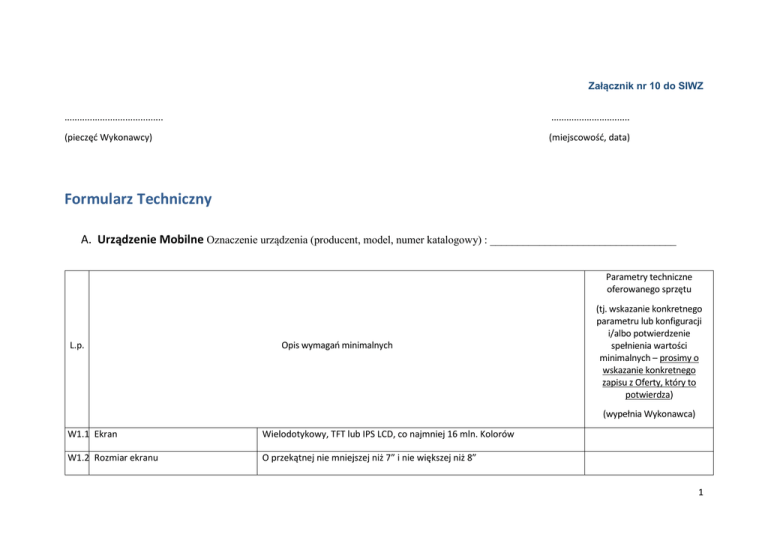 Załącznik nr 10 do SIWZ ....................................... ............................... (pieczęć Wykonawcy) (miejscowość, data) Formularz Techniczny A. Urządzenie Mobilne Oznaczenie urządzenia (producent, model, numer katalogowy) : __________________________________ Parametry techniczne oferowanego sprzętu L.p. Opis wymagań minimalnych (tj. wskazanie konkretnego parametru lub konfiguracji i/albo potwierdzenie spełnienia wartości minimalnych – prosimy o wskazanie konkretnego zapisu z Oferty, który to potwierdza) (wypełnia Wykonawca) W1.1 Ekran Wielodotykowy, TFT lub IPS LCD, co najmniej 16 mln. Kolorów W1.2 Rozmiar ekranu O przekątnej nie mniejszej niż 7” i nie większej niż 8” 1 W1.3 Powierzchnia aktywna Nie mniejsza niż 13 cm x 8 cm w każdym wymiarze W1.4 Rozdzielczość ekranu Nie mniejsza niż 1200x800 pkt, dla każdego wymiaru, nie mniej niż 170 ppi1 W1.5 Jasność ekranu Nie mniejsza niż 350 Nitów2 (cd/m2) W1.6 Kąt widzenia Symetrycznie, nie mniej niż 75 stopni W1.7 Pamięć wewnętrzna / pamięć wbudowana O pojemności nie mniejszej niż 16GB W1.8 Pamięć RAM Co najmniej 1,5 GB W1.9 Procesor Czterordzeniowy, taktowanie minimum 1,2 GHz W1.10 System operacyjny Dowolny umożliwiający programowe włączanie oraz wyłącznie co najmniej interface: Bluetooth Sieć 2/3/4 G oraz odbiornik GPS W1.11 Ogólna wydajność zestawu Urządzenie osiąga nie mniej niż 3500 pkt w teście Ice Storm Unlimited 3DMark Dostępnym na stronie: http://www.futuremark.com/support/downloads Zamawiający do weryfikacji spełnienia wymagania użyje oprogramowania opublikowanego w najnowszej wersji na powyższej stronie na dzień składania ofert. 1 2 ppi - (ang. pixels per inch) – liczba pikseli przypadająca na cal długości. Nit – jednostka luminacji 2 W1.12 Rysik Dostarczony wraz z Urządzeniem Mobilnym. Rysik powinien być wskazany przez producenta rysika jako właściwy do rysowania na ekranie urządzeń lub składania odręcznego podpisu o cechach biometrycznych. Odrzucone zostaną rozwiązania dedykowane jedynie do nawigowania. W1.13 Rysik O kształcie zbliżonym do walca (np. kształt długopisu) o minimalnej długości 120 mm i średnicy w granicach 6 - 12 mm oraz końcówce o średnicy w punkcie styku z ekranem wynoszącej maksymalnie 3 mm. i masie nie większej niż 30 g. W1.14 Rysik Zasilanie rysika (o ile dotyczy) musi zapewnić minimum 9 godzin nieprzerwanej pracy. Jeśli rysik jest zasilany własną baterią, wymaga się by miał możliwość ładowania, czyli musi być dostarczony z własną ładowarką W1.15 Dopuszczalne odchylenie rysika od pionu podczas kreślenia linii na urządzeniu Co najmniej 45 stopni. Różnica nie większa niż 0,5 mm W1.16 Dokładność odwzorowania położenia rysika przy styku z ekranem urządzenia pod kątem 90 stopni W1.17 Minimalna częstotliwość akwizycji danych – punktów kreślonej linii wraz z siłą nacisku Zestaw (urządzenie wraz z rysikiem) powinno umożliwiać rejestrację co najmniej 100 próbek (jednocześnie: punktów położenia –x/y , siły nacisku oraz czasu odznaczenia punktu) na sekundę. W1.18 Wyłączenie programowe lub sprzętowe wrażliwości ekranu na interakcję z dłonią z pozostawieniem wrażliwości na działanie rysika Możliwość położenia dłoni w momencie składania podpisu na ekranie urządzenia bez ingerencji w składany podpis W1.19 Skala rejestracji siły nacisku rysika na powierzchnię ekranu urządzenia Co najmniej 256 stopni 3 możliwa do odczytu przez oprogramowanie użytkowe W1.20 Oprogramowanie SDK umożliwiające zbieranie (odczyt) danych punktów wchodzących w skład kreślonej na powierzchni Urządzenia Mobilnego linii. Każdy punkt posiada co najmniej następujące składowe: - współrzędna x - współrzędna y - czas - siła nacisku W przypadku licencjonowania oprogramowania należy dostarczyć licencje dla co najmniej 4 programistów. W1.21 Łączność (wbudowane interface) W1.22 Wbudowane interface: W1.23 Aparat fotograficzny/Kamera W ofercie opisać komponenty, które zostaną dostarczone lub wskazanie, iż odpowiednie API jest dostępne w systemie operacyjnym. Wymaga się by oprogramowanie użytkowe wytworzone przez Zamawiającego lub podwykonawcę Zamawiającego nie było obciążone ograniczeniami licencyjnymi ani jakimikolwiek opłatami z tytułu wykorzystania SDK/API. W przypadku rozwiązanie nie stanowiącego integralnej części systemu operacyjnego urządzenia Wykonawca udzieli wsparcia merytorycznego Zamawiającemu lub podmiotowi przez niego wskazanemu w zakresie integracji aplikacji użytkowej Zamawiającego z API w wymiarze wymaganym przez Zamawiającego. • • • WiFi (WLAN 802.11a/b/g/n) Bluetooth 4.0 HSDPA 2100 (900/1800/2100 MHz), GPRS, EDGE, HSPA+ lub LTE USB 2.0 lub wyższe , dowolne złącze SD (dowolny rodzaj) – z możliwością obsługi kart co najmniej do 32 GB Wbudowany aparat fotograficzny ( lub kamera ) z lampą błyskową, z obiektywem na tylnej (w stosunku do ekranu) stronie Urządzenia Mobilnego o rozdzielczości minimalnej 3Mpx, z autofocus umożliwiającym skanowanie kodów kreskowych 2D/3D. Wymaga się by rozwiązanie nie posiadało wbudowanych komponentów sprzętowych lub programowych, które uniemożliwią lub mogą utrudnić skanowanie kodów kreskowych. 4 W1.24 Moduł GPS Wbudowany, możliwość wyłączania i włączania software’oewego. Moduł powinien bazować na danych pozyskanych z satelitów. Dopuszcza się rozwiązanie hybrydowe tzn. korzystające również z danych operatora telefonii komórkowej do czasu synchronizacji z sygnałem z satelitów W1.25 Etui ochronne Zalecane przez producenta Urządzenia Mobilnego etui chroniące przed działaniem czynników atmosferycznych i zewnętrznych (deszcz, pył, słońce) w tym w szczególności gniazda portów interface. Etui powinno być typu „rugged case” i chronić Urządzenie Mobilne przed uszkodzeniem w razie upadku. Etui nie powinno ograniczać walorów uż