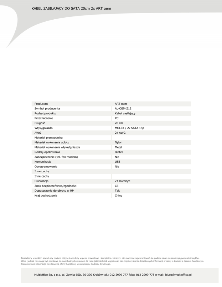 KABEL ZASILAJĄCY DO SATA 20cm 2x ART oem Producent ART oem Symbol producenta AL-OEM-Z12 Rodzaj produktu Kabel zasilający Przeznaczenie PC Długość 20 cm Wtyk/gniazdo MOLEX / 2x SATA 15p AWG 24 AWG Materiał przewodnika Materiał wykonania oplotu Nylon Materiał wykonania wtyku/gniazda Metal Rodzaj opakowania Blister Zabezpieczenie (tel.-fax-modem) Nie Komunikacja USB Oprogramowanie Nie Inne cechy Inne cechy Gwarancja 24 miesiące Znak bezpieczeństwa/zgodności CE Dopuszczenie do obrotu w RP Tak Kraj pochodzenia Chiny Dokładamy wszelkich starań aby podane zdjęcie i opis były w pełni prawidłowe i kompletne. Niestety, nie możemy zagwarantować, że podane dane nie zawierają pomyłek i błędów, które jednak nie mogą być podstawą do ewentualnych roszczeń. W razie jakichkolwiek wątpliwości lub chęci uzyskania dodatkowych informacji prosimy o kontakt z działem handlowym. Prezentowane informacje nie stanowią oferty handlowej w rozumieniu Kodeksu Cywilnego. Multioffice Sp. z o.o. ul. Zawiła 65D, 30-390 Kraków tel.: 012 2999 777 faks: 012 2999 778 e-mail: [email protected]