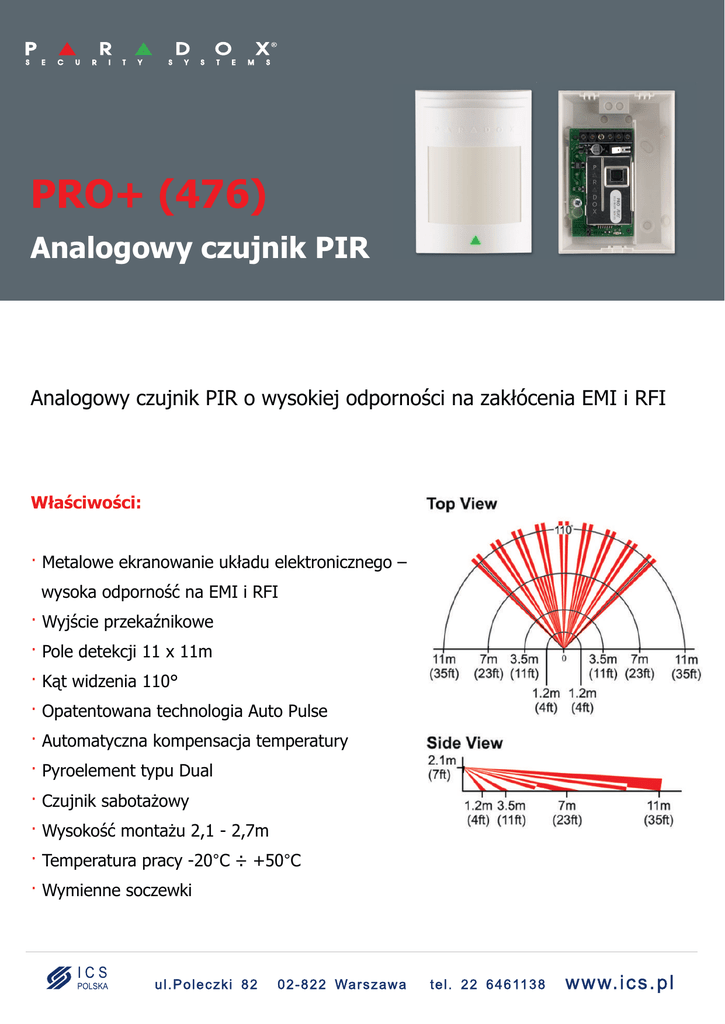 PRO+ (476) Analogowy czujnik PIR Analogowy czujnik PIR o wysokiej odpornoœci na zak³ócenia EMI i RFI W³aœciwoœci: · Metalowe ekranowanie uk³adu elektronicznego – wysoka odpornoœæ na EMI i RFI · Wyjœcie przekaŸnikowe · Pole detekcji 11 x 11m · K¹t widzenia 110° · Opatentowana technologia Auto Pulse · Automatyczna kompensacja temperatury · Pyroelement typu Dual · Czujnik sabota¿owy · Wysokoœæ monta¿u 2,1 - 2,7m · Temperatura pracy -20°C ÷ +50°C · Wymienne soczewki u l .P o l e czki 8 2 0 2 - 8 2 2 Wa r sza w a te l . 2 2 6 4 6 11 3 8 w w w.i c s .p l