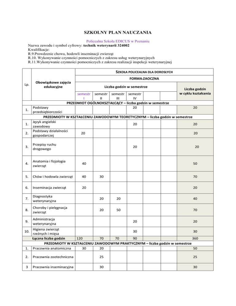 SZKOLNY PLAN NAUCZANIA Policealna Szkoła EDICUS w Poznaniu Nazwa zawodu i symbol cyfrowy: technik weterynarii 324002 Kwalifikacje: R.9.Prowdzenie chowu, hodowli inseminacji zwierząt R.10. Wykonywanie czynności pomocniczych z zakresu usług weterynaryjnych R.11.Wykonywanie czynności pomocniczych z zakresu realizacji inspekcji weterynaryjnej SZKOŁA POLICEALNA DLA DOROSŁYCH FORMA ZAOCZNA Lp. 1. 1. 2. Obowiązkowe zajęcia edukacyjne Liczba godzin w semestrze semestr semestr semestr semestr I II III IV PRZEDMIOT OGÓLNOKSZTAŁCĄCY – liczba godzin w semestrze 20 Liczba godzin w cyklu kształcenia Podstawy 20 przedsiębiorczości PRZEDMIOTY W KSZTAŁCENIU ZAWODOWYM TEORETYCZNYM – liczba godzin w semestrze Język angielski 20 20 zawodowy Podstawy działalności 20 20 gospodarczej 3. Przepisy ruchu drogowego 4. Anatomia i fizjologia zwierząt 40 5. Chów i hodowla zwierząt 40 6. Inseminacja zwierząt 20 7. Diagnostyka weterynaryjna 20 20 40 8. Choroby i pielęgnacja zwierząt 20 50 70 9. Administracja weterynaryjna 20 20 50 30 70 20 20 20 1. Higiena zwierząt 30 30 rzeźnych i mięsa Łączna liczba godzin 120 70 70 90 360 PRZEDMIOTY W KSZTAŁCENIU ZAWODOWYM PRAKTYCZNYM – liczba godzin w semestrze Pracownia anatomiczna 30 20 50 2. Pracownia zootechniczna 25 25 3 Pracownia inseminacyjna 30 30 10. 4. Pracownia zabiegowa 5. Pracownia diagnostyczna 6. Pracownia laboratoryjna 25 7. Kontrola i nadzór weterynaryjny 40 40 . Łączna liczba godzin Łączna liczba godzin kształcenia zawodowego Semestralny wymiar godzin obowiązkowych zajęd edukacyjnych 25 30 50 20 55 115 55 55 105 105 85 340 175 175 175 175 680 175 175 175 195 720 . 160 godz. Praktyka zawodowa/wymiar Egzamin potwierdzający kwalifikacje K 1 odbywa się pod koniec II semestru Egzamin potwierdzający kwalifikacje K 2 odbywa się pod koniec III semestru Egzamin potwierdzający kwalifikacje odbywa się pod koniec IV semestru 160 godz.