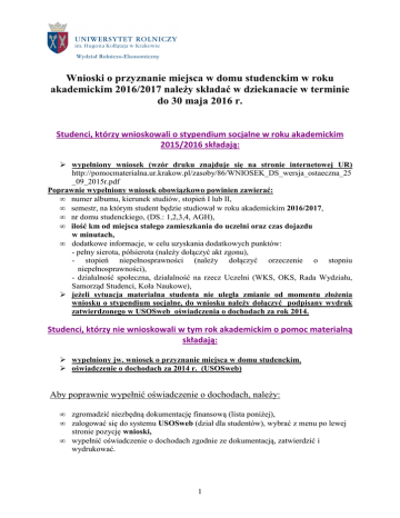 Wydział Rolniczo-Ekonomiczny Wnioski o przyznanie miejsca w domu studenckim w roku akademickim 2016/2017 należy składać w dziekanacie w terminie do 30 maja 2016 r. Studenci, którzy wnioskowali o stypendium socjalne w roku akademickim 2015/2016 składają: wypełniony wniosek (wzór druku znajduje się na stronie internetowej UR) http://pomocmaterialna.ur.krakow.pl/zasoby/86/WNIOSEK_DS_wersja_ostaeczna_25 _09_2015r.pdf Poprawnie wypełniony wniosek obowiązkowo powinien zawierać: • numer albumu, kierunek studiów, stopień I lub II, • semestr, na którym student będzie studiował w roku akademickim 2016/2017, • nr domu studenckiego, (DS.: 1,2,3,4, AGH), • ilość km od miejsca stałego zamieszkania do uczelni oraz czas dojazdu w minutach, • dodatkowe informacje, w celu uzyskania dodatkowych punktów: - pełny sierota, półsierota (należy dołączyć akt zgonu), - stopień niepełnosprawności (należy dołączyć orzeczenie o stopniu niepełnosprawności), - działalność społeczna, działalność na rzecz Uczelni (WKS, OKS, Rada Wydziału, Samorząd Studenci, Koła Naukowe), jeżeli sytuacja materialna studenta nie uległa zmianie od momentu złożenia wniosku o stypendium socjalne, do wniosku należy dołączyć podpisany wydruk zatwierdzonego w USOSweb oświadczenia o dochodach za rok 2014. Studenci, którzy nie wnioskowali w tym rok akademickim o pomoc materialną składają: wypełniony jw. wniosek o przyznanie miejsca w domu studenckim, oświadczenie o dochodach za 2014 r. (USOSweb) Aby poprawnie wypełnić oświadczenie o dochodach, należy: • • • zgromadzić niezbędną dokumentację finansową (lista poniżej), zalogować się do systemu USOSweb (dział dla studentów), wybrać z menu po lewej stronie pozycję wnioski, wypełnić oświadczenie o dochodach zgodnie ze dokumentacją, zatwierdzić i wydrukować. 1 Dokumenty niezbędne do obliczenia dochodu za 2014 r. a. zaświadczenia z Urzędu Skarbowego o dochodzie uzyskanym w roku podatkowym poprzedzającym rok akademicki- 2014 (student oraz wszyscy pełnoletni członkowie rodziny, dochód rodziców nawet, jeśli rozliczają się wspólnie dostarczyć NA OSOBNYCH DRUKACH!!!); b. w przypadku rozliczania się na podstawie przepisów o zryczałtowanym podatku dochodowym stosowne oświadczenie (Zał. nr 9 - Oświadczenie członka rodziny rozliczającego się na podstawie ryczałtu); c. oświadczenia studenta oraz wszystkich pełnoletnich członków rodziny o wysokości dochodu niepodlegającego opodatkowaniu (Zał. nr 8 - Oświadczenie o dochodzie niepodlegającym opodatkowaniu); d. osoby ubezpieczone w ZUS -zaświadczenie lub oświadczenie o wysokości składek na ubezpieczenie zdrowotne (osoby pracujące, bezrobotni, prowadzący działalność gosp.); e. osoby ubezpieczone w KRUS -zaświadczenie o składkach i zaświadczenie o wysokości wypłaconych zasiłków chorobowych w roku 2014; f. zaświadczenie z Urzędu Gminy o wielkości gospodarstwa rolnego lub nakaz płatniczy, g. oświadczenia studenta oraz wszystkich pełnoletnich członków rodziny o wielkości gospodarstwa rolnego; (Zał. nr 11 - Oświadczenie o wielkości gospodarstwa rolnego); h. skrócony odpis aktu urodzenia w przypadku niepełnoletniego rodzeństwa/ dziecka zaświadczenie o uczęszczaniu rodzeństwa/ dziecka pobierającego naukę do 26 roku życia; i. zaświadczenie z Urzędu Pracy bezrobotnych członków rodziny, (jeżeli osoba bezrobotna pobiera zasiłek w zaświadczeniu powinna być podana miesięczna kwota netto pobieranego świadczenia); j. alimenty należy udokumentować aktualnymi orzeczeniami Sądu oraz przekazami lub przelewami pieniężnymi dokumentującymi wysokość alimentów; k. w przypadku, gdy dochód netto na członka rodziny jest mniejszy niż 110,00 zł/m-c należy dostarczyć potwierdzenie korzystania z pomocy społecznej, otrzymywania świadczeń rodzinnych itp. Pracownik dziekanatu może zażądać dodatkowych zaświadczeń potwierdzających dochód oraz warunki bytowe studenta. Wzory oświadczeń określa załącznik Regulaminu przyznawania pomocy materialnej UR http://pomocmaterialna.ur.krakow.pl/index/site/2149 Wyżej wymienione dokument należy dostarczyć osobiście lub listownie do dziekanatu, pokój 223 najpóźniej do 30 maja 2016 r. Szczegółowe informacje dotyczące domów studenckich, Regulaminu przyznawania pomocy materialnej studentom Uniwersytetu Rolniczego im. Hugona Kołłątaja w Krakowie oraz instrukcje obsługi systemu USOSweb znajdują się na stronie http://pomocmaterialna.ur.krakow.pl/ 2