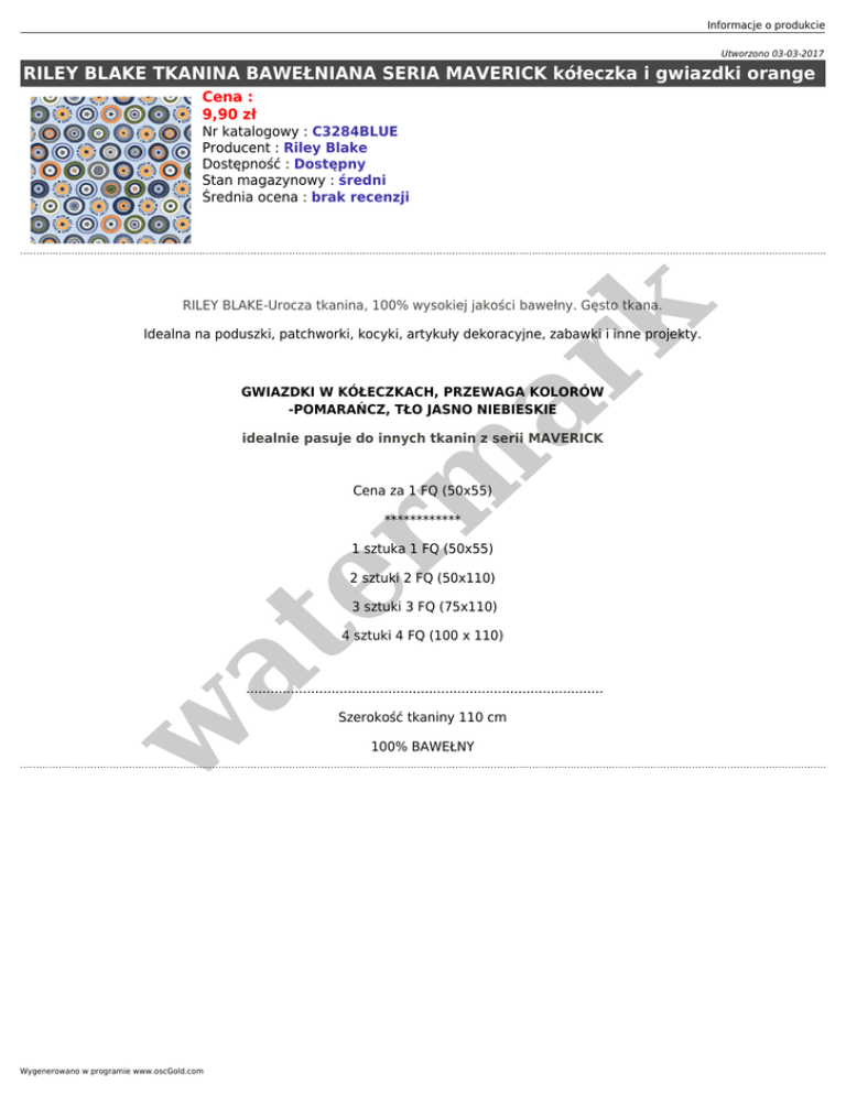 Informacje o produkcie Utworzono 03-03-2017 RILEY BLAKE TKANINA BAWEŁNIANA SERIA MAVERICK kółeczka i gwiazdki orange Cena : 9,90 zł Nr katalogowy : C3284BLUE Producent : Riley Blake Dostępność : Dostępny Stan magazynowy : średni Średnia ocena : brak recenzji er m ar k RILEY BLAKE-Urocza tkanina, 100% wysokiej jakości bawełny. Gęsto tkana. Idealna na poduszki, patchworki, kocyki, artykuły dekoracyjne, zabawki i inne projekty. GWIAZDKI W KÓŁECZKACH, PRZEWAGA KOLORÓW -POMARAŃCZ, TŁO JASNO NIEBIESKIE idealnie pasuje do innych tkanin z serii MAVERICK Cena za 1 FQ (50x55) ************ 1 sztuka 1 FQ (50x55) 2 sztuki 2 FQ (50x110) 3 sztuki 3 FQ (75x110) at 4 sztuki 4 FQ (100 x 110) w ........................................................................................ Wygenerowano w programie www.oscGold.com Szerokość tkaniny 110 cm 100% BAWEŁNY