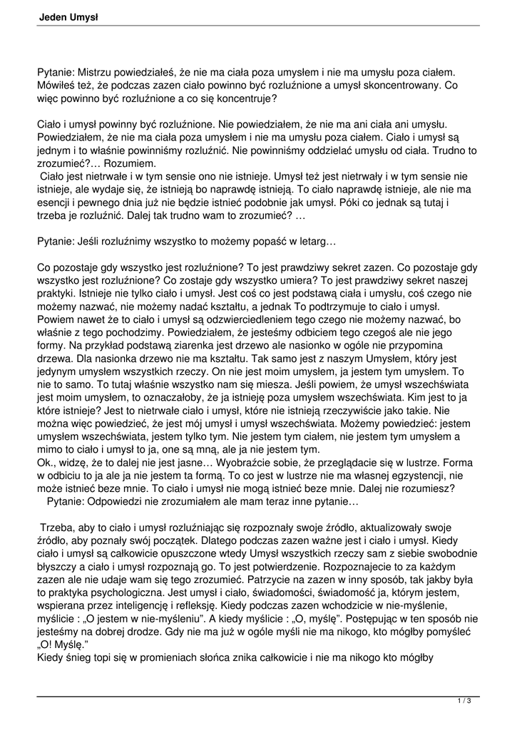 Jeden Umysł Pytanie: Mistrzu powiedziałeś, że nie ma ciała poza umysłem i nie ma umysłu poza ciałem. Mówiłeś też, że podczas zazen ciało powinno być rozluźnione a umysł skoncentrowany. Co więc powinno być rozluźnione a co się koncentruje? Ciało i umysł powinny być rozluźnione. Nie powiedziałem, że nie ma ani ciała ani umysłu. Powiedziałem, że nie ma ciała poza umysłem i nie ma umysłu poza ciałem. Ciało i umysł są jednym i to właśnie powinniśmy rozluźnić. Nie powinniśmy oddzielać umysłu od ciała. Trudno to zrozumieć?… Rozumiem. Ciało jest nietrwałe i w tym sensie ono nie istnieje. Umysł też jest nietrwały i w tym sensie nie istnieje, ale wydaje się, że istnieją bo naprawdę istnieją. To ciało naprawdę istnieje, ale nie ma esencji i pewnego dnia już nie będzie istnieć podobnie jak umysł. Póki co jednak są tutaj i trzeba je rozluźnić. Dalej tak trudno wam to zrozumieć? … Pytanie: Jeśli rozluźnimy wszystko to możemy popaść w letarg… Co pozostaje gdy wszystko jest rozluźnione? To jest prawdziwy sekret zazen. Co pozostaje gdy wszystko jest rozluźnione? Co zostaje gdy wszystko umiera? To jest prawdziwy sekret naszej praktyki. Istnieje nie tylko ciało i umysł. Jest coś co jest podstawą ciała i umysłu, coś czego nie możemy nazwać, nie możemy nadać kształtu, a jednak To podtrzymuje to ciało i umysł. Powiem nawet że to ciało i umysł są odzwierciedleniem tego czego nie możemy nazwać, bo właśnie z tego pochodzimy. Powiedziałem, że jesteśmy odbiciem tego czegoś ale nie jego formy. Na przykład podstawą ziarenka jest drzewo ale nasionko w ogóle nie przypomina drzewa. Dla nasionka drzewo nie ma kształtu. Tak samo jest z naszym Umysłem, który jest jedynym umysłem wszystkich rzeczy. On nie jest moim umysłem, ja jestem tym umysłem. To nie to samo. To tutaj właśnie wszystko nam się miesza. Jeśli powiem, że umysł wszechświata jest moim umysłem, to oznaczałoby, że ja istnieję poza umysłem wszechświata. Kim jest to ja które istnieje? Jest to nietrwałe ciało i umysł, które nie istnieją rzeczywiście jako takie. Nie można więc powiedzieć, że jest mój umysł i umysł wszechświata. Możemy powiedzieć: jestem umysłem wszechświata, jestem tylko tym. Nie jestem tym ciałem, nie jestem tym umysłem a mimo to ciało i umysł to ja, one są mną, ale ja nie jestem tym. Ok., widzę, że to dalej nie jest jasne… Wyobraźcie sobie, że przeglądacie się w lustrze. Forma w odbiciu to ja ale ja nie jestem ta formą. To co jest w lustrze nie ma własnej egzystencji, nie może istnieć beze mnie. To ciało i umysł nie mogą istnieć beze mnie. Dalej nie rozumiesz? Pytanie: Odpowiedzi nie zrozumiałem ale mam teraz inne pytanie… Trzeba, aby to ciało i umysł rozluźniając się rozpoznały swoje źródło, aktualizowały swoje źródło, aby poznały swój początek. Dlatego podczas zazen ważne jest i ciało i umysł. Kiedy ciało i umysł są całkowicie opuszczone wtedy Umysł wszystkich rzeczy sam z siebie swobodnie błyszczy a ciało i umysł rozpoznają go. To jest potwierdzenie. Rozpoznajecie to za każdym zazen ale nie udaje wam się tego zrozumieć. Patrzycie na zazen w inny sposób, tak jakby była to praktyka psychologiczna. Jest umysł i ciało, świadomości, świadomość ja, którym jestem, wspierana przez inteligencję i refleksję. Kiedy podczas zazen wchodzicie w nie-myślenie, myślicie : „O jestem w nie-myśleniu”. A kiedy myślicie : „O, myślę”. Postępując w ten sposób nie jesteśmy na dobrej drodze. Gdy nie ma już w ogóle myśli nie ma nikogo, kto mógłby pomyśleć „O! Myślę.” Kiedy śnieg topi się w promieniach słońca znika całkowicie i nie ma nikogo kto mógłby 1/3 Jeden Umysł pomyśleć :”O! Zniknąłem!” Kiedy to rozumiemy, wtedy odkrywamy Jedyny Umysł wszystkich rzeczy. Jeśli jednak zatrzymacie się na refleksji, zazen stanie się psychologiczny. Ani ciało ani umysł nie są wtedy opuszczone. Wasz sposób patrzenia jest niewłaściwy. Nie powinniśmy obserwować. Nic nie powinno być obserwowane. Jest jedynie cichy Świadek. On nie jest myślą, jest czuwaniem, jak światełko, którego zadaniem nie jest oświetlenie pomieszczenia. Dyskretny świadek. Tak jak w wieży stereo jest mała świecąca dioda. Podczas zazen jest coś co czuwa, co rozumie bezpośrednio. Słowo „rozumie” nie jest najwłaściwsze, chodzi o czucie, o pewien sposób odczuwania. To nie jest coś co myśli lecz czuje, że to jest właśnie tak, żeby nie powiedzieć, że widzi bezpośrednio. Bezpośrednio wejrzeć w swoją pierwotną naturę. To właśnie ten świadek. On pozostaje kiedy już nie ma niczego. W naszej pierwotnej świadomości jest coś co widzi bezpośrednio przed myślą, widzi albo czuje. Trudno jest to wyrazić, jest to po prostu obecność. W uwadze zwracanej na coś jest obecność. To jak usłyszeć bezpośrednio dźwięk, rozpoznać go bezpośrednio, nie analizując, nie myśląc o nim. Dźwięk przenika mnie całkowicie i w jednej chwili go pojmuję. W zazen mamy czas. Siedzimy w naszej naturze i nie myślimy. To nie jest dźwięk, który pojawia się i znika. Jesteście tak bardzo w tym, że tego nie widzicie. Dlaczego? Dlatego, że właśnie w tej chwili tym jesteście, więc nie możecie się zobaczyć. Możecie jednak zobaczyć się w swoim własnym lustrze. W życiu też nie możecie zobaczyć się bezpośrednio a jedynie w lustrze. Co wtedy widzicie? Przejaw myśli. To po prostu świadek. Widzicie jak się pojawia. Dopóki jesteście świadkiem wszystko jest w porządku. Kiedy jednak zaczynacie analizować to już nie jest tak dobrze. Wyszliście z tego, już nie jesteście świadkiem i tworzycie świat koncepcji. Myślę, nie myślę, nie powinienem myśleć itd.…Dlatego mówi się, że droga jest prosta i określa się ją w ten sposób: Budda to mój umysł, Droga to położenie kresu koncepcjom. To proste, nie