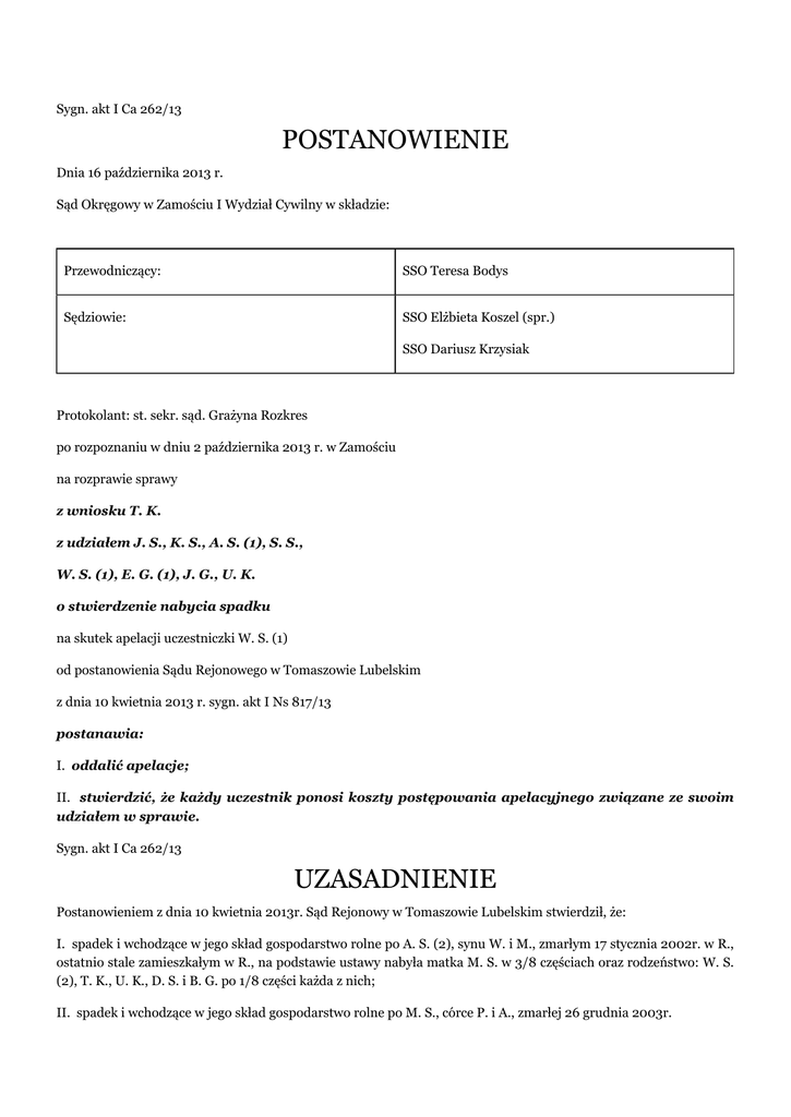 Sygn. akt I Ca 262/13 POSTANOWIENIE Dnia 16 października 2013 r. Sąd Okręgowy w Zamościu I Wydział Cywilny w składzie: Przewodniczący: SSO Teresa Bodys Sędziowie: SSO Elżbieta Koszel (spr.) SSO Dariusz Krzysiak Protokolant: st. sekr. sąd. Grażyna Rozkres po rozpoznaniu w dniu 2 października 2013 r. w Zamościu na rozprawie sprawy z wniosku T. K. z udziałem J. S., K. S., A. S. (1), S. S., W. S. (1), E. G. (1), J. G., U. K. o stwierdzenie nabycia spadku na skutek apelacji uczestniczki W. S. (1) od postanowienia Sądu Rejonowego w Tomaszowie Lubelskim z dnia 10 kwietnia 2013 r. sygn. akt I Ns 817/13 postanawia: I. oddalić apelacje; II. stwierdzić, że każdy uczestnik ponosi koszty postępowania apelacyjnego związane ze swoim udziałem w sprawie. Sygn. akt I Ca 262/13 UZASADNIENIE Postanowieniem z dnia 10 kwietnia 2013r. Sąd Rejonowy w Tomaszowie Lubelskim stwierdził, że: I. spadek i wchodzące w jego skład gospodarstwo rolne po A. S. (2), synu W. i M., zmarłym 17 stycznia 2002r. w R., ostatnio stale zamieszkałym w R., na podstawie ustawy nabyła matka M. S. w 3/8 częściach oraz rodzeństwo: W. S. (2), T. K., U. K., D. S. i B. G. po 1/8 części każda z nich; II. spadek i wchodzące w jego skład gospodarstwo rolne po M. S., córce P. i A., zmarłej 26 grudnia 2003r. w miejscowości Ł., ostatnio stale zamieszkałej w miejscowości P., na podstawie ustawy nabyły dzieci: W. S. (1), T. K., U. K., D. S. i B. G. po 1/5 części każde z nich; III. umorzył postępowanie w części dotyczącej stwierdzenia nabycia spadku po D. S. i B. G.; IV. ustalił, że każdy uczestnik ponosi koszty postępowania związane ze swoim udziałem w sprawie. Sąd Rejonowy dokonał następujących ustaleń i oceny prawnej. Spadkodawca A. S. (3) zmarł 17 stycznia 2001r. w miejscowości R. i tam ostatnio stale mieszkał. W dacie śmierci był kawalerem. Wnioskodawczyni i obecni na rozprawie uczestnicy postępowania, poza E. G. (1) i J. G., w zapewnieniu podali, że A. S. (2) dzieci nie miał, zaś jego ojciec zmarł wcześniej. Testamentu nie pozostawił. Nikt spadku nie odrzucił, nie zrzekł się dziedziczenia, nie został uznany za niegodnego dziedziczenia. Zgodnie z art. 932 §3 i 4 k.c. w braku zstępnych i małżonka spadkodawcy spadek przypada jego rodzicom w częściach równych. Jeżeli jedno z rodziców spadkodawcy nie dożyło otwarcia spadku, udział spadkowy, który by mu przypadał, dziedziczy rodzeństwo spadkodawcy w częściach równych. Tylko matka spadkodawcy M. S. dożyła otwarcia spadku. Spadkodawca miał siostry: T. K., W. S. (1), U. K. oraz obecnie nie żyjące D. S. i B. G.. Właśnie ci spadkobiercy ustawowi dziedziczą spadek po A. S. (2). W skład spadku po spadkodawcy A. S. (2) wchodzi gospodarstwo rolne. Zgon spadkodawcy nastąpił jeszcze przed wejściem w życie orzeczenia Trybunału Konstytucyjnego, tj. przed dniem 14 lutego 2001r. Sąd Rejonowy ustalał, którzy spośród spadkobierców powołanych do spadku z ustawy odpowiadają warunkom przewidzianym do dziedziczenia gospodarstwa rolnego. Krąg spadkobierców dziedziczących gospodarstwo rolne wchodzące w skład spadku po A. S. (2) określa art. 1059 k.c., w brzmieniu obowiązującym na dzień otwarcia spadku, tj. 17 stycznia 2001r. Powołany przepis stanowi, że spadkobiercy dziedziczą z ustawy gospodarstwo rolne, jeżeli w chwili otwarcia spadku stale pracowali bezpośrednio przy produkcji rolnej, mają przygotowanie zawodowe do prowadzenia produkcji rolnej, są małoletni bądź pobierają naukę zawodu lub uczęszczają do szkół, albo też w chwili otwarcia spadku byli trwale niezdolni do pracy. Spadkobiercy w osobach wnioskodawczyni oraz uczestniczek postępowania: W. U. K. byli zgodni co do tego, że wszyscy spadkobiercy ustawowi winni dziedziczyć gospodarstwo rolne w częściach równych. Osoby te zgodnie podawały, że matka spadkodawcy w chwili jego śmierci pracowała w gospodarstwie spadkodawcy. Wnioskodawczyni oraz uczestniczki postępowania: W. S. (1) i U. K. w chwili śmierci spadkodawcy pracowały we własnych gospodarstwach rolnych. Uczestniczki D. S. i B. G. własnych gospodarstw nie miały, ale pracowały w gospodarstwach przy pracach dorywczych, dodatkowo D. S. od roku 1997 pozostawała na świadczeniu rentowym ZUS- owskim z powodu całkowitej niezdolności do pracy. Świadczenie to było wypłacane przez opiekę społeczną. W 1998r. zmarł małżonek D. S. i przeszła ona na jego świadczenie rentowe. Biorąc pod uwagę powyższe spadek i wchodzące w skład spadku gospodarstwo rolne po A. S. (2) według ustawy dziedziczy jego matka M. S. w 3/8 częściach oraz jego siostry: W. S. (1), T. K., U. K., D. S. i B. G. po 1/8 części. Spadkodawczyni M. S. zmarła w dniu 26 grudnia 2003r. w miejscowości Ł., ostatnio stale zamieszkiwała w miejscowości P.. Testamentu nie pozostawiła. Nikt spadku nie odrzucił, nie zrzekł się dziedziczenia, nie został uznany za niegodnego dziedziczenia. Nie było sporządzane przed notariuszem poświadczenie dziedziczenia, była to pierwsza sprawa spadkowa po zmarłej M. S.. Zgodnie z art. 931 k.c. udział każdego ze spadkobierców wynosi po 1/5 części. O kosztach postępowania Sąd I instancji orzekł na podstawie art. 520 §1 k.p.c. Apelację od postanowienia Sądu Rejonowego złożyła uczestniczka postępowania W. S. (1) w części dotyczącej orzeczenia w pkt I o stwierdzeniu nabycia przez D. S. i B. G. praw do dziedziczenia gospodarstwa rolnego po A. S. (2). Apelująca zarzuciła: 1/ naruszenie prawa materialnego - art. 1059 §1 pkt 1 k.p.c. (obowiązującego w dniu otwarcia spadku tj. 17 stycznia 2001r.) poprzez przyjęcie, że praca dorywcza w gospodarstwie rolnym jest przesłanką dziedziczenia przez spadkobierców gospodarstwa rolnego, w sytuacji gdy ustawa (przepis art. 1059 k.c.) wymaga stałej pracy bezpośrednio przy produkcji rolnej; 2/ mające wpływ na treść rozstrzygnięcia naruszenie prawa procesowego w postaci art. 328 §2