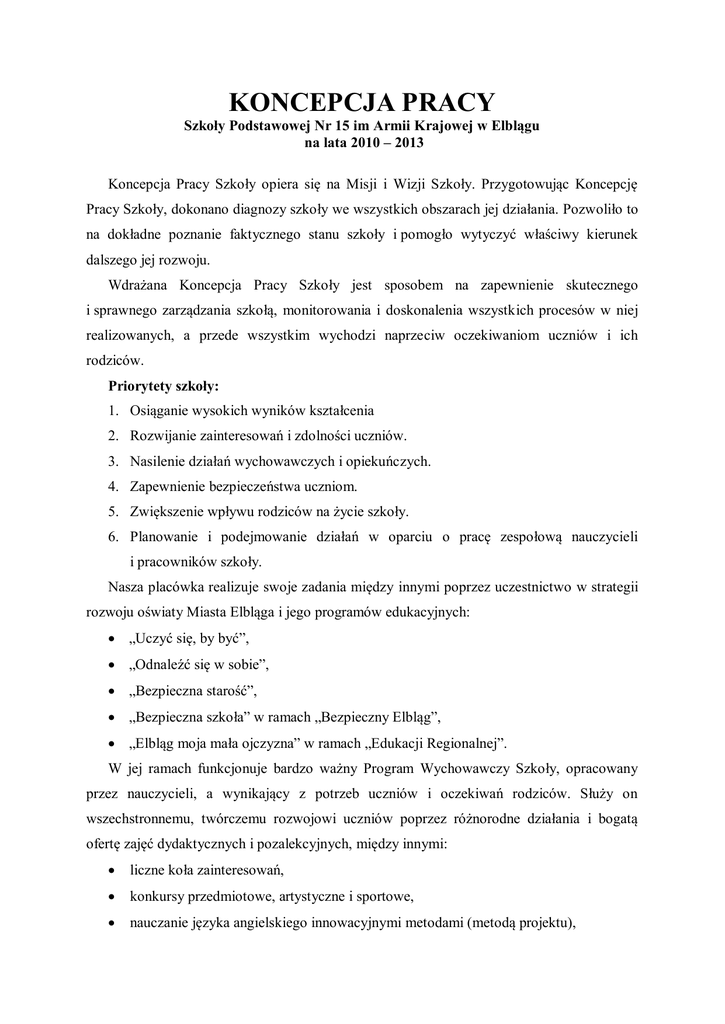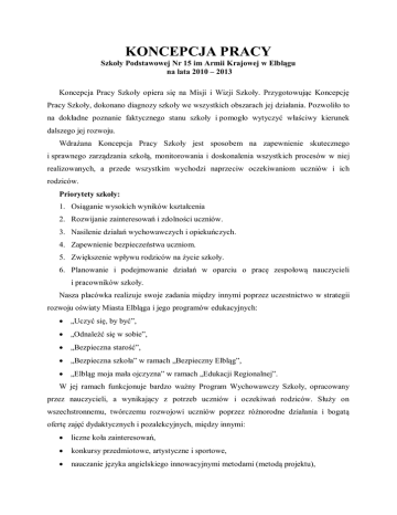 KONCEPCJA PRACY Szkoły Podstawowej Nr 15 im Armii Krajowej w Elblągu na lata 2010 – 2013 Koncepcja Pracy Szkoły opiera się na Misji i Wizji Szkoły. Przygotowując Koncepcję Pracy Szkoły, dokonano diagnozy szkoły we wszystkich obszarach jej działania. Pozwoliło to na dokładne poznanie faktycznego stanu szkoły i pomogło wytyczyć właściwy kierunek dalszego jej rozwoju. Wdrażana Koncepcja Pracy Szkoły jest sposobem na zapewnienie skutecznego i sprawnego zarządzania szkołą, monitorowania i doskonalenia wszystkich procesów w niej realizowanych, a przede wszystkim wychodzi naprzeciw oczekiwaniom uczniów i ich rodziców. Priorytety szkoły: 1. Osiąganie wysokich wyników kształcenia 2. Rozwijanie zainteresowań i zdolności uczniów. 3. Nasilenie działań wychowawczych i opiekuńczych. 4. Zapewnienie bezpieczeństwa uczniom. 5. Zwiększenie wpływu rodziców na życie szkoły. 6. Planowanie i podejmowanie działań w oparciu o pracę zespołową nauczycieli i pracowników szkoły. Nasza placówka realizuje swoje zadania między innymi poprzez uczestnictwo w strategii rozwoju oświaty Miasta Elbląga i jego programów edukacyjnych: „Uczyć się, by być”, „Odnaleźć się w sobie”, „Bezpieczna starość”, „Bezpieczna szkoła” w ramach „Bezpieczny Elbląg”, „Elbląg moja mała ojczyzna” w ramach „Edukacji Regionalnej”. W jej ramach funkcjonuje bardzo ważny Program Wychowawczy Szkoły, opracowany przez nauczycieli, a wynikający z potrzeb uczniów i oczekiwań rodziców. Służy on wszechstronnemu, twórczemu rozwojowi uczniów poprzez różnorodne działania i bogatą ofertę zajęć dydaktycznych i pozalekcyjnych, między innymi: liczne koła zainteresowań, konkursy przedmiotowe, artystyczne i sportowe, nauczanie języka angielskiego innowacyjnymi metodami (metodą projektu), zajęcia korekcyjno – kompensacyjne, prowadzenie gimnastyki korekcyjnej, realizowanie autorskiego programu wychowania fizycznego w klasach IV-VI, edukacji ekologicznej i intensywnej nauki pływania w klasach I-III. Ważną rolę w życiu szkoły odgrywa współpraca, jaką podejmujemy z różnymi instytucjami państwowymi, społecznymi, kulturalnymi ponieważ znacząco wpływa ona na działalność dydaktyczno - wychowawczo - opiekuńczą naszej placówki. MISJA SZKOŁY Nasza placówka pracuje pod hasłem „SZKOŁA PRZYJAZNA DZIECIOM”. W związku z tym, jest: bliska uczniowi i jego rodzinie poprzez dobrą współpracę między nimi, ciekawa pozwalająca rozwijać zdolności i zainteresowania, bezpieczna, gdyż czyni starania, by przeciwdziałać agresji i likwidować przejawy patologii, sprzyjająca harmonijnemu, twórczemu oraz wszechstronnemu rozwojowi dzieci poprzez różnorodne działania i bogatą ofertę edukacyjną skierowaną do ucznia, przygotowująca absolwentów do samodzielnego funkcjonowania w otaczającym świecie, nastawionych na osiągnięcie sukcesów. Zapewniamy: warunki wszechstronnego i harmonijnego rozwoju osobowości ucznia, korzystanie z najnowszych zdobyczy techniki, rozwijanie indywidualnych uzdolnień i zainteresowań poprzez udział w zajęciach pozalekcyjnych, wychowanie młodego człowieka mającego poczucie więzi ze swoją szkołą, miejscowością, regionem, ojczyzną, poszanowanie dla polskiego dziedzictwa kulturowego – kultywowanie tradycji patriotycznych, wychowanie w duchu tolerancji, przyjaźni, zrozumienia i szacunku, kształtowanie odpowiedzialności za siebie i innych, sprawiedliwość i równość szans, aktywny udział rodziców w kształtowaniu oblicza szkoły, rozwój kultury fizycznej, współdziałanie z różnymi instytucjami, współdziałanie z PPP, udzielanie pomocy psychologicznej i pedagogicznej, pomoc materialną przy współpracy z MOPS. WIZJA SZKOŁY W pracy dydaktyczno – wychowawczej – opiekuńczej nasza szkoła dąży do osiągnięcia celów zawartych w Misji Szkoły poprzez następujące działania: ukierunkowanie programów szkoły pod kątem ucznia, jego potrzeb i zdolności, zapewnienie prawidłowych warunków do zdobywania wiedzy z uwzględnieniem zróżnicowanego tempa zmian rozwojowych, dążenie do zajmowania znaczącego miejsca w panoramie szkół elbląskich, podejmowanie działań innowacyjnych przez nauczycieli w celu wyzwalania aktywności uczniów i przygotowania do samodzielnej pracy, realizację projektu edukacji ekologiczno – przyrodniczej w kl. I-III oraz kontynuowanie w kl. IV-VI autorskiego programu edukacyjnego: „Edukacyjna ścieżka ekologiczna”, otwarcie szkoły na środowisko lokalne, wszelkie inicjatywy i propozycje na wszystko, co postępowe i twórcze, kultywowanie tradycji szkoły związanych z jej patronem, zdobywanie środków finansowych na modernizację szkoły i doposażenie jej bazy dydaktycznej. Naszym priorytetem jest takie oddziaływanie dydaktyczne i wychowawcze, aby absolwent opuszczający mury naszej szkoły był człowiekiem, który będzie: posiadał określony system wartości, miał odpowiedni zasób wiedzy i umiejętności, umożliwiający mu kontynuowanie nauki w dowolnie wybranym gimnazjum, potrafił korzystać z różnych źródeł informacji, umiał obsługiwać komputer i znał podstawy języka obcego, zdobywał umiejętności pracy w zespole i rozwiązywał problemy w sposób twórczy, miał ukształtowane podstawowe wartości patriotyczne, obywatelskie, znał historię patrona szkoły, doceniał wartość rodziny i swoje miejsce w niej, znał normy dobrego zachowania i według nich postępował, rozumiał potrzebę pielęgnowania tradycji, był wrażliwy na krzywdę innych, tolerancyjny i odpowiedzialny. OBSZARY PRACY SZKOŁY 1. Efekty działalności dydaktycznej, wychowawczej i opiekuńczej oraz innej działalności statutowej szkoły. Szkoła osiąga cele zgodne z polityką oświatową państwa. Szkoła doskonali efekty swojej pracy. 2. Procesy zachodzące w szkole. Procesy edukacyjne przebiegające w szkole służą realizacji koncepcji prac