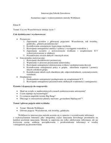 Innowacyjna Szkoła Zawodowa Scenariusz zajęć z wykorzystaniem metody WebQuest Klasa II Temat: Czy we Wszechświecie istnieje życie ? Cele dydaktyczne i wychowawcze: Poznawcze: 1. Zapoznanie uczniów z głównymi pojęciami: Wszechświat, rok świetlny, galaktyka, „planeta pozasłoneczna”. 2. Kształtowania umiejętności logicznego myślenia. 3. Rozwijanie umiejętności analizy i syntezy ( wyciąganie wniosków ). 4. Zapoznanie uczniów z nowoczesnymi środkami i urządzeniami ICT wykorzystywanymi w edukacji. 5. Poszukiwanie swoich słabych i mocnych stron. Emocjonalno-motywacyjne: 1. Rozwijanie dociekliwości poznawczej. 2. Wspieranie w procesie poszerzania samowiedzy. 3. Rozwijanie umiejętności dokonywania wyboru i podejmowania decyzji. 4. Kształtowanie umiejętności pracy w grupie, udzielania wsparcia i pomocy innym członkom grupy. 5. Kształtowanie takich cech charakteru jak: odpowiedzialność, systematyczność, rzetelność. Działaniowe: 1. Doskonalenie umiejętności posługiwania się urządzeniami ICT. 2. Rozwijanie umiejętności prezentowania zdobytych wiadomości i umiejętności. Pytania i dyspozycje do rozgrzewki: Skąd się wzięło w najdawniejszych czasach zainteresowanie astronomią? Czym zajmuje się kosmologia? Co oznacza angielski termin Big Bang? Dlaczego w starożytności planety nazwano „gwiazdami błądzącymi”? Temat i główne pojęcia mini-wykładu: Temat: Metoda WebQuest. Główne pojęcia: Wszechświat, rok świetlny, galaktyka. WebQuest to innowacyjna metoda uczenia się w oparciu o wyszukiwanie informacji z wykorzystaniem Internetu jako integralnej części nauczania dowolnego przedmiotu na każdym poziomie nauczania. Metoda ta zapewnia nie tylko zdobywanie informacji, ale jej krytyczną ocenę, selekcję, porządkowanie i przekształcanie informacji w wiedzę i umiejętność jej prezentowania. Robimy wielki skok i od świata nas otaczającego przechodzimy do Kosmosu – świata gigantycznego, który przerasta nasze zwykłe makroskopowe rozmiary miliardy, miliardy, miliardy razy. Chociaż ludzie obserwowali niebo i gwiazdy od zarania dziejów, to zdecydowana większość odkryć w dziedzinie astronomii miała miejsce stosunkowo niedawno – w ostatnich kilkudziesięciu latach. Było możliwe dzięki udoskonaleniu metod obserwacyjnych wykorzystujących najnowsze odkrycia fizyki oraz powstania technik – głównie elektroniki i techniki rakietowej. Dzięki temu, badając Kosmos, używamy nie tylko nie tylko przyrządów naziemnych, ale też odbywamy wyprawy kosmiczne, wysyłając ludzi i sondy – roboty. Wiedzę z tego zakresu postaramy się usystematyzować i podać ją w możliwie prostej postaci tak, aby można było się orientować w najnowszych odkryciach współczesnej astrofizyki. Odwiedzimy najodleglejsze galaktyki i gwiazdy znajdujące się na „krańcach” naszego Wszechświata. Te najdalsze obiekty widzimy dzisiaj takimi, jakie były miliardy lat temu, gdyż wysłane przez nie światło pokonuje tak wielkie odległości przez długi czas i dopiero dzisiaj dociera do nas. Dzięki temu możemy zajrzeć również w głąb czasu i obserwować zjawiska, które miały miejsce miliardy lat temu. W swojej wędrówce w czasie dotrzemy do początku Wszechświata i poznamy, jak to wszystko się rodziło, dotrzemy do początku czasu i przestrzeni. Według współczesnych poglądów fizyków bowiem, wraz z obecnym stanem materii narodziła się przestrzeń i czas. Całą otaczająca nas ogromną przestrzeń, którą wypełniają energia i materia w postaci różnych ciał niebieskich nazywamy Wszechświatem. Odległości między ciałami niebieskimi są ogromne. Posługiwanie się przy podawaniu tych odległości takimi jednostkami jak metr czy kilometr byłoby bardzo niewygodne. Dlatego astronomowie wprowadzili jednostki większe tj. jednostkę astronomiczną i rok świetlny. Rok świetlny jest to odległość jako pokonuje światło w ciągu jednego roku. Galaktyki to bardzo duże układy gwiazd powiązanych ze sobą grawitacyjnymi siłami wzajemnego przyciągania. W skład galaktyki może wchodzić nawet kilkaset miliardów gwiazd. Opis ćwiczenia: Tytuł: Cywilizacje pozaziemskie. Cel główny: Zebranie i przeanalizowanie informacji dotyczących warunków powstania życia ( w znanej nam formie ) we Wszechświecie. Zrozumienie roli i znaczenie pracy zespołowej. Czas trwania: 2 x 4 godz. Pomoce: Filmy edukacyjne: „Grawitacja”, „Nieważkość i przeciążenie”, materiały przygotowane przez uczniów, magnetowid , Internet, czasopisma „Świat Nauki”. Wycieczka do obserwatorium astronomicznego do Wrocławia. Aranżacja przestrzeni: pracownia komputerowa. Przebieg ćwiczenia: - Uczniowie wraz z nauczycielem po zapoznaniu się z głównym celem zajęć dokonują podziału na cztery grupy. - Nauczyciel przedstawia opis rezultatu jaki mają osiągnąć uczniowie. - Przydzielenie zadań każdej z grup oraz zapoznanie się z opisem ról. Role: 1. 2. 3. 4. Badacz przeszłości Badacz teraźniejszości Poszukiwacz Badacz przyszłości Badacz przeszłości Zadania: 1. 2. 3. 4. Jak rodził się współczesny obraz Kosmosu i Ziemi? Badania przedkopernikańskie. Teoria Kopernika. Od Galileusza do XX wieku. Badacz teraźniejszości Zadania: 1. Współczesne badania naukowe na temat powstania Wszechświata – teoria Wielkiego Wybuchu. 2. Współczesne techniki obserwacji. 3. Współczesne urządzenia do Badania Kosmosu. 4. Loty kosmiczne. Poszukiwacz Zadania: 1. 2. 3. 4. 5. Historia poglądów o możliwości istnienia innych cywilizacji. Argumenty przemawiające za istnieniem życia we Wszechświecie. Jakie warunki muszą zaistnieć, aby powstało życie w znanej nam formie? Współczesne poglądy istnienia życia poza Ziemią. Trudności związane z odkrywaniem planet obiegających odległe gwiazdy. Badacz przyszłości Zadania: 1. Od czego mogą zależeć dalsze losy Wszechświata? 2. Gęstość krytyczna a losy Wszechświata. 3. Śm