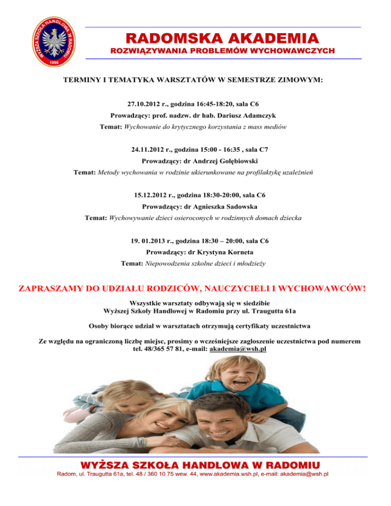 TERMINY I TEMATYKA WARSZTATÓW W SEMESTRZE ZIMOWYM: 27.10.2012 r., godzina 16:45-18:20, sala C6 Prowadzący: prof. nadzw. dr hab. Dariusz Adamczyk Temat: Wychowanie do krytycznego korzystania z mass mediów 24.11.2012 r., godzina 15:00 - 16:35 , sala C7 Prowadzący: dr Andrzej Gołębiowski Temat: Metody wychowania w rodzinie ukierunkowane na profilaktykę uzaleŜnień 15.12.2012 r., godzina 18:30-20:00, sala C6 Prowadzący: dr Agnieszka Sadowska Temat: Wychowywanie dzieci osieroconych w rodzinnych domach dziecka 19. 01.2013 r., godzina 18:30 – 20:00, sala C6 Prowadzący: dr Krystyna Korneta Temat: Niepowodzenia szkolne dzieci i młodzieŜy ZAPRASZAMY DO UDZIAŁU RODZICÓW, NAUCZYCIELI I WYCHOWAWCÓW! Wszystkie warsztaty odbywają się w siedzibie WyŜszej Szkoły Handlowej w Radomiu przy ul. Traugutta 61a Osoby biorące udział w warsztatach otrzymują certyfikaty uczestnictwa Ze względu na ograniczoną liczbę miejsc, prosimy o wcześniejsze zagłoszenie uczestnictwa pod numerem tel. 48/365 57 81, e-mail: [email protected]
