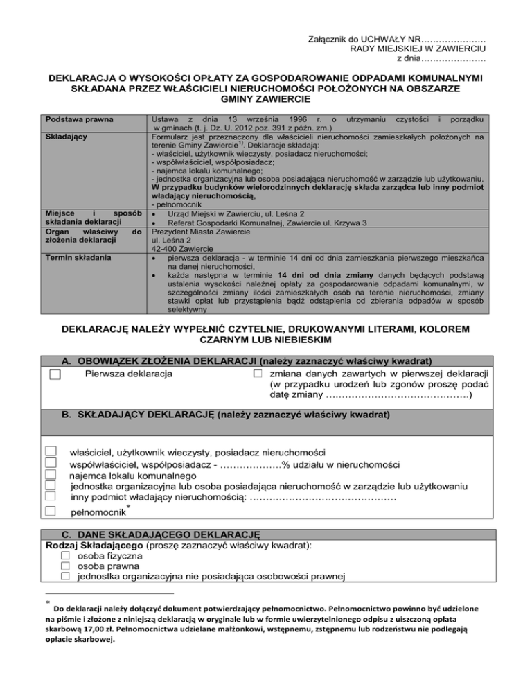 Załącznik do UCHWAŁY NR…………………. RADY MIEJSKIEJ W ZAWIERCIU z dnia…………………. DEKLARACJA O WYSOKOŚCI OPŁATY ZA GOSPODAROWANIE ODPADAMI KOMUNALNYMI SKŁADANA PRZEZ WŁAŚCICIELI NIERUCHOMOŚCI POŁOŻONYCH NA OBSZARZE GMINY ZAWIERCIE Podstawa prawna Składający Miejsce i sposób składania deklaracji Organ właściwy do złożenia deklaracji Termin składania Ustawa z dnia 13 września 1996 r. o utrzymaniu czystości i porządku w gminach (t. j. Dz. U. 2012 poz. 391 z późn. zm.) Formularz jest przeznaczony dla właścicieli nieruchomości zamieszkałych położonych na 1) terenie Gminy Zawiercie . Deklaracje składają: - właściciel, użytkownik wieczysty, posiadacz nieruchomości; - współwłaściciel, współposiadacz; - najemca lokalu komunalnego; - jednostka organizacyjna lub osoba posiadająca nieruchomość w zarządzie lub użytkowaniu. W przypadku budynków wielorodzinnych deklarację składa zarządca lub inny podmiot władający nieruchomością, - pełnomocnik Urząd Miejski w Zawierciu, ul. Leśna 2 Referat Gospodarki Komunalnej, Zawiercie ul. Krzywa 3 Prezydent Miasta Zawiercie ul. Leśna 2 42-400 Zawiercie pierwsza deklaracja - w terminie 14 dni od dnia zamieszkania pierwszego mieszkańca na danej nieruchomości, każda następna w terminie 14 dni od dnia zmiany danych będących podstawą ustalenia wysokości należnej opłaty za gospodarowanie odpadami komunalnymi, w szczególności zmiany ilości zamieszkałych osób na terenie nieruchomości, zmiany stawki opłat lub przystąpienia bądź odstąpienia od zbierania odpadów w sposób selektywny DEKLARACJĘ NALEŻY WYPEŁNIĆ CZYTELNIE, DRUKOWANYMI LITERAMI, KOLOREM CZARNYM LUB NIEBIESKIM A. OBOWIĄZEK ZŁOŻENIA DEKLARACJI (należy zaznaczyć właściwy kwadrat) Pierwsza deklaracja zmiana danych zawartych w pierwszej deklaracji (w przypadku urodzeń lub zgonów proszę podać datę zmiany ….………………………………….) B. SKŁADAJĄCY DEKLARACJĘ (należy zaznaczyć właściwy kwadrat) właściciel, użytkownik wieczysty, posiadacz nieruchomości współwłaściciel, współposiadacz - ……………….% udziału w nieruchomości najemca lokalu komunalnego jednostka organizacyjna lub osoba posiadająca nieruchomość w zarządzie lub użytkowaniu inny podmiot władający nieruchomością: ……………………………………… pełnomocnik C. DANE SKŁADAJĄCEGO DEKLARACJĘ Rodzaj Składającego (proszę zaznaczyć właściwy kwadrat): osoba fizyczna osoba prawna jednostka organizacyjna nie posiadająca osobowości prawnej Do deklaracji należy dołączyć dokument potwierdzający pełnomocnictwo. Pełnomocnictwo powinno być udzielone na piśmie i złożone z niniejszą deklaracją w oryginale lub w formie uwierzytelnionego odpisu z uiszczoną opłata skarbową 17,00 zł. Pełnomocnictwa udzielane małżonkowi, wstępnemu, zstępnemu lub rodzeństwu nie podlegają opłacie skarbowej. Imię i nazwisko (dotyczy osób fizycznych)/ Pełna nazwa (dotyczy osób prawnych i jednostek organizacyjnych nieposiadających osobowości prawnej) PESEL (dotyczy osób fizycznych) / NIP i REGON (dotyczy osób prawnych i jednostek organizacyjnych nieposiadających osobowości prawnej) PESEL NIP REGON/KRS ADRES ZAMIESZKANIA (dotyczy osób fizycznych) / ADRES SIEDZIBY (dotyczy osób prawnych i jednostek organizacyjnych nieposiadających osobowości prawnej Kraj Województwo Powiat Gmina Ulica Nr domu Miejscowość Kod pocztowy Poczta Telefon kontaktowy Nr lokalu Adres e-mail ADRES DO KORESPONDENCJI (należy wypełnić, jeśli adres jest inny niż wskazany powyżej) Kraj Województwo Powiat Gmina Ulica Nr domu Miejscowość Kod pocztowy Poczta Nr lokalu ADRES NIERUCHOMOŚCI, NA KTÓREJ POWSTAJĄ ODPADY KOMUNALNE (w przypadku większej liczby nieruchomości, dane należy zamieścić w odrębnym załączniku) Miejscowość Ulica Nr domu Przeznaczenie nieruchomości (należy zaznaczyć właściwy kwadrat) Nieruchomość na terenie, której wyłącznie zamieszkują mieszkańcy Nieruchomość na terenie, której zamieszkują mieszkańcy oraz prowadzona jest działalność gospodarcza, w wyniku której powstają odpady komunalne (w przypadku zaznaczenia tej pozycji należy wypełnić poniższą tabelę) L. p. 1. 2. 3. Numer lokalu Nazwa podmiotu prowadzącego działalność gospodarczą Opis umowy o odbiór odpadów (podmiot z którym została zawarta, numer umowy, rodzaje i wielkość odbieranych pojemników) D. OBECNY STAN GOSPODARKI ODPADAMI – NIERUCHOMOŚCI ZAMIESZKAŁE2) 1. Stan własności posiadanego pojemnika na odbiór odpadów komunalnych zmieszanych (stan obecny – należy zaznaczyć właściwy kwadrat) Pojemnik na własność Pojemnik użyczony (dzierżawa, bezpłatne użytkowanie na czas trwania umowy) Brak pojemnika 2. Ilość posiadanych pojemników, ich pojemność oraz częstotliwość opróżniania Ilość pojemników……………sztuk o poj. 120 l Ilość pojemników……………sztuk o poj. 240 l Ilość pojemników……………sztuk o poj. 1100 l Ilość pojemników………………sztuk o poj. .…. 3. Oświadczam, że na terenie nieruchomości wskazanej w części C (lub w załączniku w przypadku większej ilości nieruchomości) niniejszej deklaracji zamieszkuje następująca liczba osób (należy podać łączną liczbę mieszkańców)3) : E. USTALENIE WYSOKOŚCI OPŁATY – NIERUCHOMOŚCI ZAMIESZKAŁE2) Oświadczam, że na terenie nieruchomości wskazanej w części C (lub w załączniku w przypadku większej ilości nieruchomości) niniejszej deklaracji odpady będą gromadzone i odbierane w sposób selektywny4) (należy zaznaczyć właściwy kwadrat) TAK NIE Miesięczna stawka opłaty za jednego mieszkańca (należy zaznaczyć właściwy kwadrat) …..zł – odpady gromadzone i odbierane w sposób selektywny Wysokość opłaty miesięcznej za gospodarowanie odpadami (należy podać kwotę w PLN) …..zł odpady nie gromadzone i odbierane w sposób sele