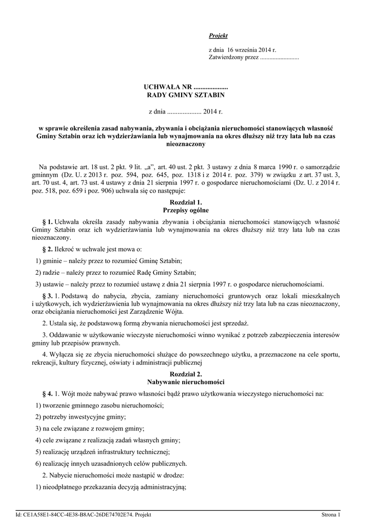 Projekt z dnia 16 września 2014 r. Zatwierdzony przez ......................... UCHWAŁA NR .................... RADY GMINY SZTABIN z dnia .................... 2014 r. w sprawie określenia zasad nabywania, zbywania i obciążania nieruchomości stanowiących własność Gminy Sztabin oraz ich wydzierżawiania lub wynajmowania na okres dłuższy niż trzy lata lub na czas nieoznaczony Na podstawie art. 18 ust. 2 pkt. 9 lit. „a”, art. 40 ust. 2 pkt. 3 ustawy z dnia 8 marca 1990 r. o samorządzie gminnym (Dz. U. z 2013 r. poz. 594, poz. 645, poz. 1318 i z 2014 r. poz. 379) w związku z art. 37 ust. 3, art. 70 ust. 4, art. 73 ust. 4 ustawy z dnia 21 sierpnia 1997 r. o gospodarce nieruchomościami (Dz. U. z 2014 r. poz. 518, poz. 659 i poz. 906) uchwala się co następuje: Rozdział 1. Przepisy ogólne § 1. Uchwała określa zasady nabywania zbywania i obciążania nieruchomości stanowiących własność Gminy Sztabin oraz ich wydzierżawiania lub wynajmowania na okres dłuższy niż trzy lata lub na czas nieoznaczony. § 2. Ilekroć w uchwale jest mowa o: 1) gminie – należy przez to rozumieć Gminę Sztabin; 2) radzie – należy przez to rozumieć Radę Gminy Sztabin; 3) ustawie – należy przez to rozumieć ustawę z dnia 21 sierpnia 1997 r. o gospodarce nieruchomościami. § 3. 1. Podstawą do nabycia, zbycia, zamiany nieruchomości gruntowych oraz lokali mieszkalnych i użytkowych, ich wydzierżawienia lub wynajmowania na okres dłuższy niż trzy lata lub na czas nieoznaczony, oraz obciążania nieruchomości jest Zarządzenie Wójta. 2. Ustala się, że podstawową formą zbywania nieruchomości jest sprzedaż. 3. Oddawanie w użytkowanie wieczyste nieruchomości winno wynikać z potrzeb zabezpieczenia interesów gminy lub przepisów prawnych. 4. Wyłącza się ze zbycia nieruchomości służące do powszechnego użytku, a przeznaczone na cele sportu, rekreacji, kultury fizycznej, oświaty i administracji publicznej Rozdział 2. Nabywanie nieruchomości § 4. 1. Wójt może nabywać prawo własności bądź prawo użytkowania wieczystego nieruchomości na: 1) tworzenie gminnego zasobu nieruchomości; 2) potrzeby inwestycyjne gminy; 3) na cele związane z rozwojem gminy; 4) cele związane z realizacją zadań własnych gminy; 5) realizację urządzeń infrastruktury technicznej; 6) realizację innych uzasadnionych celów publicznych. 2. Nabycie nieruchomości może nastąpić w drodze: 1) nieodpłatnego przekazania decyzją administracyjną; Id: CE1A58E1-84CC-4E38-B8AC-26DE74702E74. Projekt Strona 1 2) zakupu nieruchomości; 3) przyjęcia darowizny, zrzeczenia się, zamiany, spadku lub zapisu; 4) wywłaszczenia; 5) podziałów oraz scaleń i podziałów. § 5. Zgoda Rady wyrażona w formie uchwały wymagana jest przy nabyciu nieruchomości, której wartość przekracza 50.000 zł, z wyjątkiem przypadku określonego w §4 ust. 2 pkt 1. § 6. 1. Odpłatne nabycie nieruchomości następuje po cenie ustalonej w wyniku negocjacji ze zbywcą, jednak nie wyższej niż wartość ustaloną przez rzeczoznawcę majątkowego, chyba że za zbyciem za wyższą cenę przemawiają szczególne okoliczności. 2. Uzgodnienie ceny i spisanie protokołu z przeprowadzonych negocjacji stanowi podstawę do zawarcia umowy w formie aktu notarialnego. Rozdział 3. Zbywanie nieruchomości i oddawanie w użytkowanie wieczyste § 7. 1. Wójt może zbywać i oddawać w użytkowanie wieczyste nieruchomości wchodzące w skład zasobu, jeżeli nieruchomości te są zbędne do realizacji zadań Gminy. 2. Zbycie nieruchomości może nastąpić w drodze: 1) sprzedaży nieruchomości; 2) oddania w użytkowanie wieczyste; 3) zamiany; 4) wniesienia jako wkład niepieniężny (aport) do spółki; 5) innych czynności prawnych. § 8. Cenę zbycia lub wywoławczą Wójt określa w zarządzeniu o przeznaczeniu nieruchomości do zbycia, z zastrzeżeniem §9 i §10. § 9. Jeżeli wartość nieruchomości przekracza 50.000 zł, do jej zbycia lub oddania w użytkowanie wieczyste wymagana jest zgoda Rady wyrażona w formie uchwały. Zasada powyższa obowiązuje również przy zamianie nieruchomości. § 10. W przypadku zbycia nieruchomości w formie darowizny, wymagana jest każdorazowo zgoda rady wyrażona w formie uchwały. § 11. Zbycie nieruchomości i oddanie w użytkowanie wieczyste następuje według zasad określonych w ustawie oraz jej przepisach wykonawczych. § 12. Wójt może dokonywać zamiany nieruchomości w przypadku, gdy jest to uzasadnione potrzebami Gminy lub uzasadnionymi potrzebami innych osób prawnych lub fizycznych. § 13. Warunki zamiany nieruchomości uzgadnia się w drodze rokowań. Rozdział 4. Obciążanie nieruchomości ograniczonymi prawami rzeczowymi. § 14. 1. Wójt może na nieruchomościach ustanawiać ograniczone prawa rzeczowe: 1) użytkowanie; 2) hipotekę; 3) służebność gruntową i osobistą; 4) służebność przesyłu na rzecz przedsiębiorcy, który zamierza wybudować lub którego własność stanowią urządzenia, o których mowa w art. 49 §1 kodeksu cywilnego. 2. Opłatę za użytkowanie oraz ustanowienie służebności ustala Wójt w drodze zarządzenia. 3. Nieodpłatne obciążenie nieruchomości prawem użytkowania lub służebnością może nastąpić jedynie na rzecz Skarbu Państwa. Id: CE1A58E1-84CC-4E38-B8AC-26DE74702E74. Projekt Strona 2 4. Oddanie w użytkowanie nieruchomości o wartości powyżej 50.000 zł, z wyjątkiem przypadków według których konieczność oddania nieruchomości w użytkowanie wynika z przepisów prawa, wymaga zgody Rady. § 15. Nieruchomości stanowiące własność Gminy mogą zostać obciążone hipoteką o wartości powyżej 50.000 zł jedynie za zgodą Rady. Rozdział 5. Wydzierżawianie i wynajmowanie nieruchomości § 16. Nieruchomości wchodzące w skład zasobu nieruchomości mogą być wydzierżawiane, wynajmowane jeżeli nie są zbędne do realizacji zadań Gminy. § 17. 1. Najemców i dzierżawców nieruchomości na czas ozna
