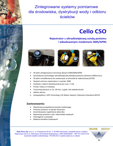 Zintegrowane systemy pomiarowe dla środowiska, dystrybucji wody i odbioru ścieków Cello CSO Rejestrator z ultradźwiękową sondą poziomu i wbudowanym modemem SMS/GPRS W pełni zintegrowana transmisja danych GSM/SMS/GPRS Sprawdzona technologia ultradźwiękowej detekcji poziomu (Siemens Milltronics) W pełni certyfikowany do zastosowań w atmosferze wybuchowej (ATEX) Stopień ochrony rejestratora i czujnika: IP68 Zasilanie z baterii wbudowanej przez czas > 5 lat Prosty i łatwy w instalacji Transmisja danych co 15, 30 min, 1 godz. lub wielokrotność Zdalne alarmy Kompatybilny z GPS Technolog i UK Water Industry Telemetry Standard (WITS) Zastosowania: Rejestracja przepełniania kanału ściekowego Pomiary poziomu w kanale otwartym Kontrolowanie napełnienia zbiornika Rejestracja poziomu rzek i zbiorników wodnych Ostrzeganie o powodzi Badania kanałów ściekowych Złote Runo Sp. z o. o., ul. Koszykowa 59 lok. 2, 00-660 Warszawa, zarejestrowana w Sądzie Rejonowym dla m.st. Warszawy XII Wydział Gospodarczy, KRS 0000348491, NIP 701-022-04-22, wysokość kapitału zakładowego: 100 000,00 zł, kapitał opłacony w całości Rejestratory Cello są rodziną urządzeń wyposażonych w interfejs GSM, rejestrujących dane w sieci wodociągowej, gazowej lub elektrycznej. Obecnie na całym świecie zainstalowano ponad 250 000 urządzeń Cello, które stały się już standardem przemysłowym zdalnych sieci telemetrycznych. Siemens Milltronics jest uznanym producentem czujników poziomu. Ultradźwiękowy czujnik poziomu stosowany w rejestratorze Cello wykorzystuje już opatentowaną technologię. Dzięki temu pomiary poziomu są niezawodne a jednocześnie układy elektroniczne mają zoptymalizowaną konstrukcję ze względu na niskie zużycie energii i komunikację szeregową z rejestratorem Cello. Rejestrator poziomu Cello CSO jest wyposażony w zaawansowany system alarmowania wykorzystywany do wykrywania i natychmiastowego sygnalizowania nienormalnych warunków pracy. Rejestrator Cello obsługuje alarmy niskich i wysokich poziomów jak również alarmy profilowe. Rejestrator Cello także raportuje poziom sygnału GSM w danej lokalizacji, błędy sieci GSM i niski poziom baterii zasilającej. Konfigurowanie rejestratora Cello jest bardzo proste – w tym celu wykorzystuje się kreator instalacji "krok po kroku". W trakcie konfigurowania rejestratora Cello wykonywany jest pomiar jakości (siły) sygnału GSM, co pozwala na wybranie najlepszej, dla danej lokalizacji, sieci GSM. W trakcie wykonywania instalacji, operator może skonfigurować ultradźwiękowy czujnik poziomu wykorzystując do tego laptopa, wykonać wizualizację echa od obiektu docelowego i wybrać najbardziej odpowiedni algorytm pomiarowy. Dane wysyłane przez rejestrator Cello mogą być zbierane na kilka sposobów, w tym: Oprogramowanie firmy Technolog zainstalowane na komputerze lokalnym Oprogramowanie firmy Technolog jest potężnym narzędziem realizującym graficzne odwzorowanie danych, analizę danych, export danych do różnych formatów, umożliwiającym bezpieczne udostępnianie i przesyłanie danych pomiędzy dwoma serwerami z wykorzystaniem połączenia IP lub dial-up. Centrum danych Technolog Centrum danych Technolog wykorzystuje bezpośrednie połączenie z operatorami GSM. Dane są bezpiecznie przechowywane, a następnie przekazywane do użytkownika sieci korporacyjnej lub udostępniane za pośrednictwem Internetu. Alarmy generowane przez rejestrator Cello znajdujący się w danej lokalizacji mogą być przekazane w formie wiadomości SMS lub e-mail do właściwych służb terenowych Rejestrator poziomu Cello CSO jest wyposażony w specjalnie zaprojektowaną antenę zwiększającą poziom odbieranego sygnału GSM w miejscu podziemnej instalacji. Rejestruje wartości poziomu odczytane z ultradźwiękowego czujnika poziomu (w regularnych odstępach czasu od 1 minuty do 60 minut) i przesyła je do komputera użytkownika z wykorzystaniem wiadomości SMS lub komunikacji GPRS (z określoną przez użytkownika częstością, typowo raz na dzień, raz na tydzień lub raz na miesiąc). Alarmy są wysyłane natychmiast. Rejestrator Cello realizuje funkcje zasilania ultradźwiękowego czujnika poziomu oraz komunikacji z tym czujnikiem z wykorzystaniem inteligentnego protokołu komunikacji szeregowej. To sprawia, że system jest bardziej niezawodny niż konwencjonalny czujnik z wyjściem analogowym. Ultradźwiękowy czujnik poziomu może być instalowany w pobliżu docelowego poziomu, który ma być mierzony. Układy elektroniczne czujnika są szczelnie zamknięte, aby były odporne na trudne warunki eksploatacji i powodzie. Ultradźwiękowy czujnik poziomu wykorzystuje opatentowane algorytmy pozwalające na wiarygodne określenie czasu potrzebnego na powrót odbitej fali akustycznej z powrotem do czujnika. Czujnik również kompensuje zmiany prędkości dźwięku wywołane zmianami temperatury. Inteligentna elektronika umieszczona w czujniku optymalizuje proces pomiarowy ze względu na minimalne zużycie energii. Specyfikacja techniczna Specyfikacja czujnika Wejście Zakres Dokładność Czujnik temperatury Kąt wiązki Iskrobezpieczeństwo Parametry środowiskowe Wymiary CSO Ultradźwiękowy pomiar poziomu od 0,2 m do 3 m ±10 mm Zintegrowany, do kompensacji prędkości dźwięku 12° dla poziomu –3 dB Certyfikowane iskrobezpieczeństwo SIRA 12ATEX 2007X - EEx ia IIC T4 (Ta= –20°C do +60°C) IECEx SIR 12.0001X - Ex ia IIC T4 (Ta= –20°C do +60°C) Temperatura otoczenia w czasie pracy: –20°C do +60°C Stopień ochrony: IP68 (zanurzenia na głębokość 1 m przez czas większy niż 24 godziny) Monitor CSO: 217 mm × 82 mm × 88 mm Specyfikacja Cello I.S. Mk. Modem GSM Czteropasmowy: 900 MHz / 1800 MHz lub 850 MHz / 1900 MHz Antena zintegrowana Transmisja danych SMS lub GPRS co 15 minut, 30 minut, 1 godzina, 1 dzień, 1 tydzień lub miesięcznie w zaprogramowanym dniu i czasie Port szeregowy Typ: full duplex, transm