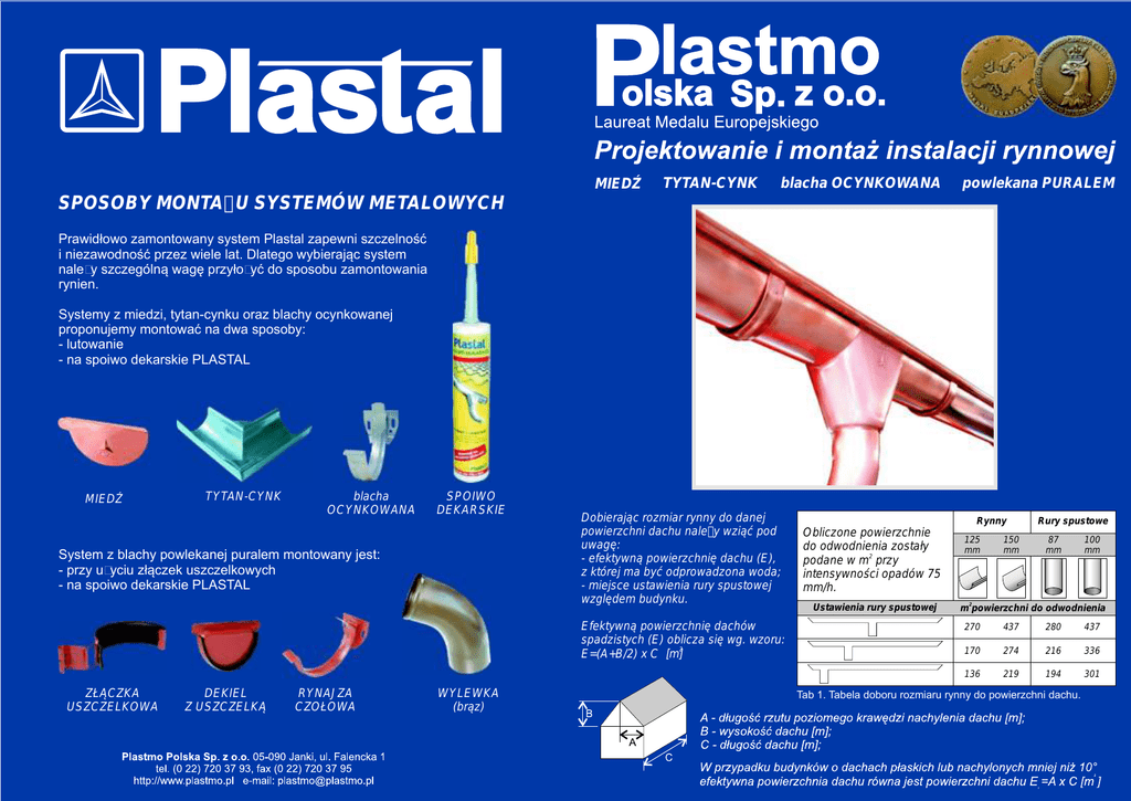 MIEDŹ TYTAN-CYNK blacha OCYNKOWANA powlekana PURALEM SPOSOBY MONTAŻU SYSTEMÓW METALOWYCH Prawidłowo zamontowany system Plastal zapewni szczelność i niezawodność przez wiele lat. Dlatego wybierając system należy szczególną wagę przyłożyć do sposobu zamontowania rynien. Systemy z miedzi, tytan-cynku oraz blachy ocynkowanej proponujemy montować na dwa sposoby: - lutowanie - na spoiwo dekarskie PLASTAL MIEDŹ TYTAN-CYNK blacha OCYNKOWANA SPOIWO DEKARSKIE System z blachy powlekanej puralem montowany jest: - przy użyciu złączek uszczelkowych - na spoiwo dekarskie PLASTAL Dobierając rozmiar rynny do danej powierzchni dachu należy wziąć pod uwagę: - efektywną powierzchnię dachu (E), z której ma być odprowadzona woda; - miejsce ustawienia rury spustowej względem budynku. Efektywną powierzchnię dachów spadzistych (E) oblicza się wg. wzoru: E=(A+B/2) x C [m]2 ZŁĄCZKA USZCZELKOWA DEKIEL Z USZCZELKĄ RYNAJZA CZOŁOWA WYLEWKA (brąz) Rynny Obliczone powierzchnie do odwodnienia zostały podane w m2 przy intensywności opadów 75 mm/h. Ustawienia rury spustowej 125 mm 150 mm Rury spustowe 87 mm 100 mm m2powierzchni do odwodnienia 270 437 280 437 170 274 216 336 136 219 194 301 Tab 1. Tabela doboru rozmiaru rynny do powierzchni dachu. UWAGA: Kolejność montażu zależy od typu (rodzaju) stosowanej rynajzy. Wyznaczyć miejsce gdzie będą zamontowane sztucery (najniższe punkty instalacji - A). A 1 2 Następnie przygotować rynajzy. Jeżeli będą stosowane rynajzy długie należy je wygiąć odpowiednio do kąta nachylenia dachu (bardzo pomocna w tym celu jest giętarka). Zaleca się ponumerowanie rynajz, gdyż tylko przy zachowaniu właściwej kolejności można uzyskać odpowiedni spadek. Rynajza nr 10 będzie usytuowana najniżej. C kierunek spadku C - najwyższy punkt instalacji kierunek spadku 4 7a B kierunek spadku max 60 cm A - miejsce zamontowania sztucera B - miejsce zamontowania narożnika 3 Dekiel uniwersalny z uszczelką grzebieniową należy nałożyć na koniec rynny i docisnąć. W montażu bardzo pomocny jest gumowy młotek do nabicia dekla. W przypadku systemu z miedzi, tytan-cynku czy blachy ocynkowanej dekiel jest lutowany lub klejony za pomocą spoiwa dekarskiego Plastal. 6 Montaż rynny rozpoczynamy od umieszczenia noska rynajzy w zewnętrznym wywinięciu rynny (wulście) (rys.7a) następnie dociskamy rynnę do wewnętrznych powierzchni rynajz i zaginamy blaszki znajdujące się na tylnych wewnętrznych ściankach rynajz. (rys.7b) nosek rynajzy wulsta rynny 5 W miejscu przewidzianym na sztucer należy wyciąć w rynnie otwór odpowiadający średnicy odpływu sztucera (rys nr 5). Otwór powinien być usytuowany w osi sztucera i równej odległości od sąsiadujących rynajz. A 7b Jeżeli stosowane będą rynajzy doczołowe spadek należy uzyskać przez rozciągnięcie sznurka pomiędzy rynajzą najniżej usytuowaną tuż przy sztucerze a skrajną, przy narożniku (Rys. 3) lub umieszczoną w najwyższym punkcie (Rys. 4). Rynajzy należy montować max co 60 cm z zachowaniem spadku minimum 2 mm na 1 m.b. w stosunku do poziomu. UWAGA: W przypadku zastosowania rynajz typu blaszka - blaszka możemy montować rynnę z uprzednio zamontowanym na niej sztucerem. Sztucer należy mocować na rynnie umieszczając jego przednią krawędź w zewnętrznym wywinięciu rynny „wulście”. Dociskając sztucer do rynny należy zagiąć do środka jego uszy mocujące. 8a uszy mocujące 8b INFORMACJA O RYNAJZACH D 9 W przypadku systemu powlekanego puralem do połączenia dwóch odcinków rynien lub rynny z narożnikiem służy złączka z uszczelką grzebieniową. Montaż złączki rozpoczynamy od odgięcia blaszki w kształcie odwróconego U,(D) która znajduje się na zewnętrznej płaszczyźnie złączki (rys.9). Złączkę wieszamy na tylnych krawędziach rynien, a następnie dociskając ją do zewnętrznych płaszczyzn rynien zakładamy zaczep na wulstę rynny i zapinamy klamrę. Montaż kończymy dogięciem blaszki zabezpieczającej wypięcie klamry (D). W przypadku rynien ocynkowanych i powlekanych puralem możemy zastosować spoiwo dekarskie Plastal zachowując zakład rynna w rynnę 5 cm. Natomiast łączenie rynien wykonanych z miedzi i tytan-cynku powinno być lutowane. 10 Rurę spustową montujemy do ścian budynku używając obejm. Obejmy montować należy maksymalnie co 2 m. Pierwszą górną obejmę umieszcza się bezpośrednio pod kolanem. W przypadku budynków wysokich do łączenia dwóch rur spustowych służy mufa. * Rynajza długa i czołowa typu „blaszkablaszka” dostępna jest w systemach: tytancynkowym, ocynkowanym i powlekanym puralem w rozmiarach 280 i 333. Rynajza czołowa typu „blaszka-blaszka” dostępna jest dodatkowo w systemie miedzianym 280 i 333. ** Rynajza długa i czołowa typu „blaszkanosek” występuje w systemach ocynkowanym i powlekanym puralem w rozmiarach 280 i 333. Rynajza czołowa typu „blaszka-nosek” z systemu ocynkowanego wykorzystywana jest w systemie tytan-cynkowym. Rynajza długa typu „blaszka-nosek” dostępna jest również w systemie miedzianym w rozmiarze 280 i 333. UWAGA: Wszystkie rynajzy przetłaczane są typu „blaszka-nosek”.