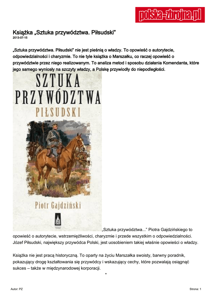 Książka „Sztuka przywództwa. Piłsudski” 2013-07-15 „Sztuka przywództwa. Piłsudski” nie jest pieśnią o władzy. To opowieść o autorytecie, odpowiedzialności i charyzmie. To nie tyle książka o Marszałku, co raczej opowieść o przywództwie przez niego realizowanym. To analiza metod i sposobu działania Komendanta, które jego samego wyniosły na szczyty władzy, a Polskę przywiodły do niepodległości. „Sztuka przywództwa...” Piotra Gajdzińskiego to opowieść o autorytecie, wstrzemięźliwości, charyzmie i przede wszystkim o odpowiedzialności. Józef Piłsudski, największy przywódca Polski, jest uosobieniem takiej właśnie opowieści o władzy. Książka nie jest pracą historyczną. To oparty na życiu Marszałka swoisty, barwny poradnik, pokazujący drogę kształtowania się przywódcy i wskazujący cechy, które pozwalają osiągnąć sukces – także w międzynarodowej korporacji. * Autor: PZ Strona: 1 „Oto idzie cholerne Imperium Brytyjskie!” – krzyknął na widok Winstona Churchilla jeden z robotników. Taką charyzmę – a także wizję przyszłości – miał też Józef Piłsudski. Bolesław Wieniawa-Długoszowski, późniejszy legionista, adiutant Marszałka i generał, po raz pierwszy zobaczył Piłsudskiego w Paryżu, dokąd ten przyjechał szukać żołnierzy do Legionów. „W tym okresie Komendant przypominał mi jednego z największych samotników. Kolumba, który błagał o okręty potrzebne mu do odkrycia nieznanego a wyczuwalnego lądu” – wspominał. Prawdziwi przywódcy rodzą się w trudnych czasach – to wówczas ich pewność siebie, wiara w sukces, konsekwencja i determinacja objawiają swoją sprawczą moc. Dla Polaków Piłsudski pozostaje kwintesencją tych cech. „Z podziwem i przyjemnością patrzyłam na tego człowieka, nie doznając żadnego zawodu. Jest tak obdarzony przez naturę we wszelki urok człowieczy: talent, zapał, dowcip, żywość i wdzięk” – pisała w Dziennikach Zofia Nałkowska. „Polska Zbrojna” objęła książkę patronatem medialnym. Piotr Gajdziński, „Sztuka przywództwa. Piłsudski”, Wydawnictwo Poznańskie 2013, ISBN 978-837177-953-4, s. 184, oprawa twarda. Autor: PZ Strona: 2