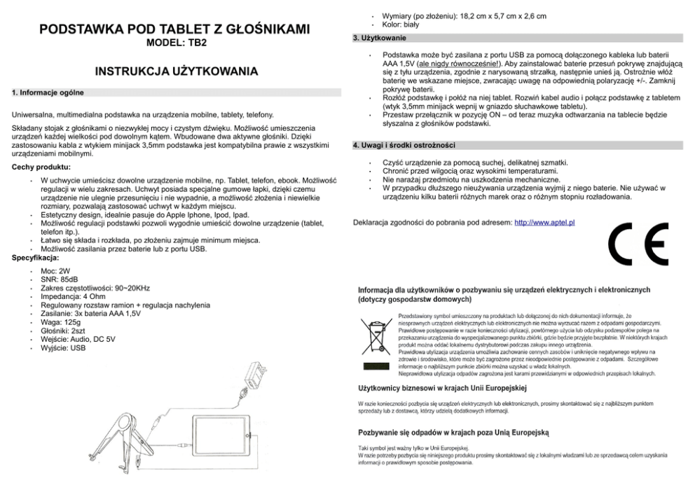 PODSTAWKA POD TABLET Z GŁOŚNIKAMI MODEL: TB2 • • 3. Użytkowanie • INSTRUKCJA UŻYTKOWANIA 1. Informacje ogólne Uniwersalna, multimedialna podstawka na urządzenia mobilne, tablety, telefony. Składany stojak z głośnikami o niezwykłej mocy i czystym dźwięku. Możliwość umieszczenia urządzeń każdej wielkości pod dowolnym kątem. Wbudowane dwa aktywne głośniki. Dzięki zastosowaniu kabla z wtykiem minijack 3,5mm podstawka jest kompatybilna prawie z wszystkimi urządzeniami mobilnymi. Cechy produktu: • W uchwycie umieścisz dowolne urządzenie mobilne, np. Tablet, telefon, ebook. Możliwość regulacji w wielu zakresach. Uchwyt posiada specjalne gumowe łapki, dzięki czemu urządzenie nie ulegnie przesunięciu i nie wypadnie, a możliwość złożenia i niewielkie rozmiary, pozwalają zastosować uchwyt w każdym miejscu. • Estetyczny design, idealnie pasuje do Apple Iphone, Ipod, Ipad. • Możliwość regulacji podstawki pozwoli wygodnie umieścić dowolne urządzenie (tablet, telefon itp.). • Łatwo się składa i rozkłada, po złożeniu zajmuje minimum miejsca. • Możliwość zasilania przez baterie lub z portu USB. Specyfikacja: • • • • • • • • • • Moc: 2W SNR: 85dB Zakres częstotliwości: 90~20KHz Impedancja: 4 Ohm Regulowany rozstaw ramion + regulacja nachylenia Zasilanie: 3x bateria AAA 1,5V Waga: 125g Głośniki: 2szt Wejście: Audio, DC 5V Wyjście: USB Wymiary (po złożeniu): 18,2 cm x 5,7 cm x 2,6 cm Kolor: biały • • Podstawka może być zasilana z portu USB za pomocą dołączonego kableka lub baterii AAA 1,5V (ale nigdy równocześnie!). Aby zainstalować baterie przesuń pokrywę znajdującą się z tyłu urządzenia, zgodnie z narysowaną strzałką, następnie unieś ją. Ostrożnie włóż baterię we wskazane miejsce, zwracając uwagę na odpowiednią polaryzację +/-. Zamknij pokrywę baterii. Rozłóż podstawkę i połóż na niej tablet. Rozwiń kabel audio i połącz podstawkę z tabletem (wtyk 3,5mm minijack wepnij w gniazdo słuchawkowe tabletu). Przestaw przełącznik w pozycję ON – od teraz muzyka odtwarzania na tablecie będzie słyszalna z głośników podstawki. 4. Uwagi i środki ostrożności • • • • Czyść urządzenie za pomocą suchej, delikatnej szmatki. Chronić przed wilgocią oraz wysokimi temperaturami. Nie narażaj przedmiotu na uszkodzenia mechaniczne. W przypadku dłuższego nieużywania urządzenia wyjmij z niego baterie. Nie używać w urządzeniu kilku baterii różnych marek oraz o różnym stopniu rozładowania. Deklaracja zgodności do pobrania pod adresem: http://www.aptel.pl