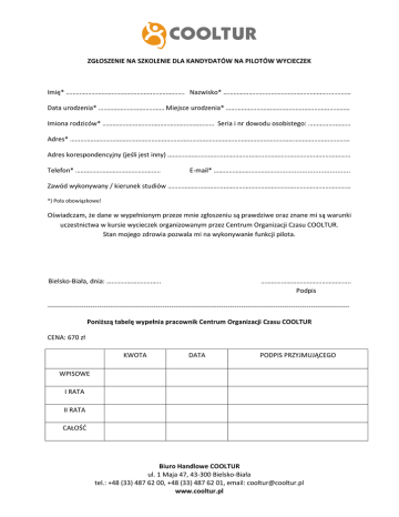 ZGŁOSZENIE NA SZKOLENIE DLA KANDYDATÓW NA PILOTÓW WYCIECZEK Imię* ……………………………………………………………. Nazwisko* …………………….………………………………..………… Data urodzenia* ………………………………… Miejsce urodzenia* …………………………….………………………………… Imiona rodziców* ………………………………………………………… Seria i nr dowodu osobistego: …………….……… Adres* ………………………………………………………………………………………………………………………………………………… Adres korespondencyjny (jeśli jest inny) ……………………………………………………………………………………………… Telefon* ………………………………………….. E-mail* …………………………………...................................... Zawód wykonywany / kierunek studiów ……………………………………………………………………………………………… *) Pola obowiązkowe! Oświadczam, że dane w wypełnionym przeze mnie zgłoszeniu są prawdziwe oraz znane mi są warunki uczestnictwa w kursie wycieczek organizowanym przez Centrum Organizacji Czasu COOLTUR. Stan mojego zdrowia pozwala mi na wykonywanie funkcji pilota. Bielsko-Biała, dnia: ………………………….. …………………………………………….. Podpis -------------------------------------------------------------------------------------------------------------------------------------Poniższą tabelę wypełnia pracownik Centrum Organizacji Czasu COOLTUR CENA: 670 zł KWOTA DATA PODPIS PRZYJMUJĄCEGO WPISOWE I RATA II RATA CAŁOŚĆ Biuro Handlowe COOLTUR ul. 1 Maja 47, 43-300 Bielsko-Biała tel.: +48 (33) 487 62 00, +48 (33) 487 62 01, email: [email protected] www.cooltur.pl