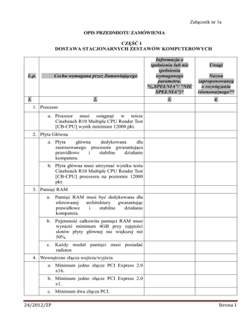 Załącznik nr 1a OPIS PRZEDMIOTU ZAMÓWIENIA CZĘŚĆ I DOSTAWA STACJONARNYCH ZESTAWÓW KOMPUTEROWYCH L.p. Cecha wymagana przez Zamawiającego Informacja o spełnieniu lub nie spełnieniu wymaganego parametru. *(„SPEŁNIA”/ ”NIE SPEŁNIA”)* Nazwa zaproponowaneg o rozwiązania równoważnego** 2. 3. 4. 1. Uwagi 1. Procesor a. Procesor musi osiągnąć w teście Cinebench R10 Multiple CPU Render Test [CB-CPU] wynik minimum 12000 pkt. 2. Płyta Główna a. Płyta główna dedykowana dla zastosowanego procesora gwarantująca prawidłowe i stabilne działanie komputera. b. Płyta główna musi utrzymać wyniku testu Cinebench R10 Multiple CPU Render Test [CB-CPU] procesora na poziomie 12000 pkt. 3. Pamięć RAM a. Pamięć RAM musi być dedykowana dla oferowanej architektury gwarantując prawidłowe i stabilne działanie komputera. b. Pojemność całkowita pamięci RAM musi wynieść minimum 4GB przy zajętości slotów płyty głównej nie większej niż 50%. c. Każdy moduł pamięci musi posiadać radiator. 4. Wewnętrzne złącza wejścia/wyjścia a. Minimum jedno złącze PCI Express 2.0 x16. b. Minimum jedno złącze PCI Express 2.0 x1. c. Minimum dwa złącza PCI. 24/2012/ZP Strona 1 d. Minimum dwa złącza SATA III (6 Gb/s) e. Minimum dwa złącza SATA II (3 Gb/s) f. Minimum jedno złącze USB 2.0/1.1; 5. Porty zewnętrzne a. Minimum jeden interfejs PS2. b. Minimum jedno złącze USB 2.0/1.1; c. Minimum jedno złącze USB 3.0; d. Minimum jeden interfejs RJ-45 e. Minimum trzy kanały interfejsu audio stereo (wejście audio, wyjście słuchawkowe, wejście mikrofonu). 6. Karta graficzna a. Karta graficzna dedykowana dla oferowanej architektury gwarantująca prawidłowe i stabilne działanie komputera. b. Karta graficzna musi utrzymać wyniku testu Cinebench R10 Multiple CPU Render Test [CB-CPU] procesora na poziomie 12000 pkt. c. Karta graficzna musi osiągnąć w teście Cinebench R10 OpenGL Standard Test CB wynik minimum 5000 pkt. d. Interfejs połączeniowy karty graficznej musi wykorzystywać interfejs PCI Express 2.0. e. Karta graficzna musi posiadać możliwość połączenia z monitorem poprzez interfejs HDMI. f. Karta musi mieć możliwość uzyskania rozdzielczości 1920x1080 pikseli lub wyższej. g. Zamawiający dopuszcza kartę graficzną zintegrowaną z płytą główną. 7. Karta sieciowa a. Zintegrowana z płytą główną Gigabit Ethernet LAN minimum 10/100/1000 Mb/s. 8. Karta sieciowa a. Zintegrowana z płytą główną. 9. Dysk Twardy 24/2012/ZP Strona 2 a. Dysk twardy SSD 2.5 cala o pojemności minimum 90 GB z interfejsem SATAIII (6 Gb/s). b. Dysk musi być zamontowany i podłączony w opisanej poniżej wewnętrznej kieszeni dysku twardego. 10. Kieszeń dysku twardego a. Kieszeń dysku twardego musi gwarantować prawidłowe i stabilne działanie z zaoferowanym dyskiem twardym. b. Kieszeń dysku twardego musi być zamontowana i podłączona w obudowie zestawu komputerowego oraz posiadać kluczyk i zamek blokujący dostęp do dysku. 11. Napęd optyczny a. Napęd optyczny musi być zamontowany i podłączony w obudowie zestawu komputerowego. b. Napęd optyczny musi posiadać interfejs połączeniowy SATA. c. Napęd optyczny musi mieć możliwość nagrywania jednolub dwuwarstwowych płyt : CD-R,CD-RW, DVD-/+R, DVD-/+RW/. 12. Zasilacz a. Zasilacz musi gwarantować prawidłowe i stabilne działanie komputera przy pełnych długotrwałych obciążeniach, z zapasem mocy umożliwiającym wyposażenie obudowy w maximum dodatkowych urządzeń. Zasilacz powinien posiadać ponadto korekcje współczynnika mocy (PFC), filtry przeciwzwarciowe, przeciwprzepięciowe, i przeciwzakłóceniowe zapobiegające uszkodzeniu elementów Stacji Roboczej. 13. Obudowa a. Obudowa musi być standardu ATX typu Midi Tower; b. Obudowa musi posiadać minimum jedną wnękę wewnętrzną 3,5 cala. c. Obudowa musi posiadać minimum jedną wnękę zewnętrzną 3,5 cala; 24/2012/ZP Strona 3 d. Obudowa musi posiadać minimum dwie wnęki zewnętrzną 5,25 cala; e. Obudowa musi posiadać minimum jedno wejście mikrofonu. f. Obudowa musi posiadać minimum jedno wejście słuchawkowe. g. Obudowa musi posiadać minimum dwa złącza USB 2.0/1.1. h. Obudowa musi posiadać boczny kanał wentylacyjny. 14. Monitor LCD a. Monitor musi posiadać matrycę TN z podświetleniem LED o przekątnej ekranu minimum 20 cali; b. Czas reakcji matrycy maksymalnie 5 ms; c. Monitor zasilacz. musi posiadać monitora wbudowany d. Monitor musi uzyskać rozdzielczości 1920 x 1080 pikseli lub wyższej. e. Monitor musi posiadać minimum jedno złącze HDMI; f. Monitor musi posiadać minimum jedno złącze D-SUB lub/i DVI. g. W zestawie z monitorem muszą być dołączone przewody: I. II. III. kabel sygnałowy HDMI, kabel sygnałowy D-SUB lub/i DVI, kabel zasilania 230 V. 15. Klawiatura a. Klawiatura klasyczna musi interfejs połączeniowy PS2. posiadać b. Rozmieszczenie klawiszy klawiatury musi być standardu QWERTY z wydzieloną częścią numeryczną. 16. Mysz a. Mysz laserowa musi posiadać interfejs połączeniowy typu USB 2.0/1.1 oraz kabel o długości 1,5 – 2 m. 24/2012/ZP Strona 4 b. Rozdzielczość pracy myszki musi być minimum 1000 dpi. c. W zestawie z myszką powinna być dostarczona podkładka dedykowana dla tego rodzaju urządzenia gwarantująca poprawną jej pracę. 17. BIOS a. BIOS musi mieć możliwość ustawienia aktualnego czasu i daty systemowej. b. BIOS musi mieć możliwość włączenia/wyłączenia zintegrowanych portów i urządzeń płyty głównej służących do komunikacji między innymi: USB, port równoległy, port szeregowy, karta sieciowa, itp. c. BIOS musi mieć możliwość blokowania/odblokowania uruchamiania (bootowania) stacji roboczej za pomocą interfejsów służących do komunikacji. d. BIOS musi mieć możliwość blokowania/odblokowania (bootowania) stacji roboczej z zewnętrznych urządzeń. e. BIOS musi mieć możliwość ustawienie sekwencji uruchamiania (bootowania) dysków twa