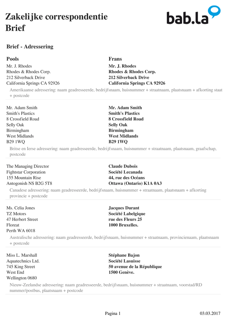 Zakelijke correspondentie Brief Brief - Adressering Pools Frans Mr. J. Rhodes Mr. J. Rhodes Rhodes & Rhodes Corp. Rhodes & Rhodes Corp. 212 Silverback Drive 212 Silverback Drive California Springs CA 92926 California Springs CA 92926 Amerikaanse adressering: naam geadresseerde, bedrijfsnaam, huisnummer + straatnaam, plaatsnaam + afkorting staat + postcode Mr. Adam Smith Mr. Adam Smith Smith's Plastics Smith's Plastics 8 Crossfield Road 8 Crossfield Road Selly Oak Selly Oak Birmingham Birmingham West Midlands West Midlands B29 1WQ B29 1WQ Britse en Ierse adressering: naam geadresseerde, bedrijfsnaam, huisnummer + straatnaam, plaatsnaam, graafschap, postcode The Managing Director Claude Dubois Fightstar Corporation Société Lecanada 155 Mountain Rise 44, rue des Océans Antogonish NS B2G 5T8 Ottawa (Ontario) K1A 0A3 Canadese adressering: naam geadresseerde, bedrijfsnaam, huisnummer + straatnaam, plaatsnaam + afkorting provincie + postcode Ms. Celia Jones Jacques Durant TZ Motors Société Labelgique 47 Herbert Street rue des Fleurs 25 Floreat 1000 Bruxelles. Perth WA 6018 Australische adressering: naam geadresseerde, bedrijfsnaam, huisnummer + straatnaam, provincienaam, plaatsnaam + postcode Miss L. Marshall Stéphane Bajon Aquatechnics Ltd. Société Lasuisse 745 King Street 50 avenue de la République West End 1500 Genève. Wellington 0680 Nieuw-Zeelandse adressering: naam geadresseerde, bedrijfsnaam, huisnummer + straatnaam, voorstad/RD nummer/postbus, plaatsnaam + postcode Pagina 1 03.03.2017 Zakelijke correspondentie Brief Mirosław Zdaniuk Clarisse Beaulieu Okonel Sp. z.o.o. Société Lafrance ul. Złota 3 18, rue du Bac 00-115 Warszawa 75500 PARIS. Standaard adressering in Nederland: bedrijfsnaam, naam geadresseerde, straatnaam + huisnummer, postcode + plaatsnaam Brief - Aanhef Pools Frans Szanowny Panie Prezydencie, Monsieur le président, Zeer formeel, geadresseerde heeft een speciale titel die in plaats van de naam wordt gebruikt Szanowny Panie, Monsieur, Formeel, mannelijke geadresseerde, naam onbekend Szanowna Pani, Madame, Formeel, vrouwelijke geadresseerde, naam onbekend Szanowni Państwo, Madame, Monsieur, Formeel, naam en geslacht van de geadresseerde onbekend Szanowni Państwo, Madame, Monsieur, Formeel, een groep onbekende mensen of een afdeling wordt aangesproken Szanowni Państwo, Aux principaux concernés, Formeel, naam en geslacht van de geadresseerde(n) volledig onbekend Szanowny Panie, Formeel, mannelijke geadresseerde, naam bekend Monsieur Dupont, Szanowna Pani, Madame Dupont, Formeel, vrouwelijke geadresseerde, gehuwd, naam bekend Szanowna Pani, Mademoiselle Dupont, Formeel, vrouwelijke geadresseerde, ongehuwd, naam bekend Pagina 2 03.03.2017 Zakelijke correspondentie Brief Szanowna Pani, Madame Dupont, Formeel, vrouwelijke geadresseerde, burgerlijke staat onbekend, naam bekend Szanowny Panie, Monsieur Dupont, Minder formeel, men heeft reeds zaken met de geadresseerde gedaan Drogi Tomaszu, Cher Benjamin, Informeel, men is bevriend met de geadresseerde, relatief ongebruikelijk Piszemy do Państwa w sprawie... Formeel, inleiding namens het gehele bedrijf Nous vous écrivons concernant... Piszemy do Państwa w związku z... Formeel, inleiding namens het gehele bedrijf Nous vous écrivons au sujet de... W nawiązaniu do... Suite à... Formeel, inleiding refereert aan iets, dat men bij het betreffende bedrijf gezien heeft Nawiązując do... En référence à... Formeel, inleiding refereert aan iets, dat men bij het betreffende bedrijf gezien heeft Piszę do Państwa z zapytaniem o... J'écris afin de me renseigner sur... Minder formeel, inleiding namens jezelf en jouw eigen bedrijf W imieniu Pana Michalaka, piszę do Państwa... Formeel, namens een andere persoon Je vous écris de la part de... Pańska firma została nam wysoce polecona/rekomendowana przez... Formeel, beleefde inleiding Votre société fut recommandée par... Brief - Hoofdtekst Pools Frans Czy miałby Pan coś przeciwko... Formeel verzoek, voorzichtig Si cela ne vous occasionne aucun désagrément... Pagina 3 03.03.2017 Zakelijke correspondentie Brief Czy byłby Pan tak uprzejmy... Formeel verzoek, voorzichtig Auriez-vous l'amabilité de... Byłbym zobowiązany, gdyby... Formeel verzoek, voorzichtig Je vous saurai gré de... Bylibyśmy wdzięczni, gdyby mógł Pan przesłać nam więcej informacji na temat... Formeel verzoek, zeer beleefd Nous vous saurions gré si vous aviez l'obligeance de nous envoyer plus d'informations sur... Byłbym wdzięczny, gdyby Pan zechciał... Formeel verzoek, zeer beleefd Je vous saurai gré de... Czy mógłby mi Pan przesłać... Formeel verzoek, beleefd Pourriez-vous me faire parvenir... Jesteśmy zainteresowani nabyciem/otrzymaniem... Formeel verzoek, beleefd Nous sommes intéressés par la réception de... Chciałbym zapytać, czy... Formeel verzoek, beleefd Je me permets de vous demander si... Czy mógłby mi Pan polecić... Formeel verzoek, direct Pourriez-vous recommander... Prosiłbym o przesłanie mi... Formeel verzoek, direct Auriez-vous l'obligeance de m'envoyer... Proszę o pilne... Formeel verzoek, zeer direct Nous vous prions de... Będziemy wdzięczni, jeśli... Formeel verzoek, beleefd, namens het bedrijf Nous vous serions reconnaissants si... Jaka jest Pańska obecna cena za... Specifiek formeel verzoek, direct Quelle est votre liste des prix pour... Pagina 4 03.03.2017 Zakelijke correspondentie Brief Jesteśmy zainteresowani...i chcielibyśmy się dowiedzieć... Formele aanvraag, direct Nous sommes intéressés par ... et nous désirerions savoir ... Z reklamy wnioskujemy, że produkują Państwo... Nous comprenons de part votre publicité que vous produisez... Formele aanvraag, direct Mamy zamiar/Nosimy się z zamiarem... Formele intentieverklaring, direct Notre intention est de... Dokładnie przeanalizowaliśmy Państwa propozycję Nous avons étudié votre proposition avec la plus grande i... attention et... Formeel, leidt tot een beslissing aangaand