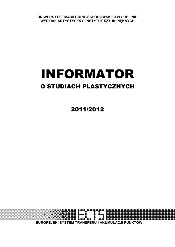 UNIWERSYTET MARII CURIE-SKŁODOWSKIEJ W LUBLINIE WYDZIAŁ ARTYSTYCZNY, INSTYTUT SZTUK PIĘKNYCH INFORMATOR O STUDIACH PLASTYCZNYCH 2011/2012 EUROPEJSKI SYSTEM TRANSFERU I AKUMULACJI PUNKTÓW Opracowanie i redakcja techniczna informatora Alicja Snoch-Pawłowska DRUK - WYDZIAŁ ARTYSTYCZNY UMCS W LUBLINIE LUBLIN 2011 2 Przedstawiamy studentom rozpoczynającym studia w roku akademickim 2011/2012 „Informator o studiach plastycznych” przygotowany zgodnie z systemem ECTS - Europejskim Systemem Transferu i Akumulacji Punktów. Studia w Instytucie Sztuk Pięknych Wydziału Artystycznego UMCS prowadzone są zgodnie z założeniami Deklaracji Bolońskiej, która jest wyznacznikiem nowoczesnych standardów kształcenia. Kompatybilność i porównywalność programów nauczania z większością europejskich uczelni otwiera drogę do kontynuowania studiów w innych ośrodkach, także poza granicami kraju oraz daje atut w postaci akceptowanego na terenie całej Unii Europejskiej dyplomu ukończenia szkoły wyższej. Oferta programowa studiów plastycznych na naszym Wydziale jest stale uaktualniana. W obecnym roku akademickim wracamy do trybu 5-letnich jednolitych studiów magisterskich na kierunkach grafika i malarstwo. W obrębie naszych studiów prowadzimy kształcenie zarówno w zakresie sztuk tradycyjnych, warsztatowych, jak i tych współczesnych, opartych na nowych mediach. Staramy się sprostać potrzebom i oczekiwaniom edukacyjnym młodych artystów, którym zapewniamy warunki wszechstronnego rozwoju w przyjaznej i twórczej atmosferze. Mamy nadzieję, że nasz przewodnik ułatwi Wam orientację w strukturze i programie podjętych studiów. Informator opracował zespół w składzie: prof. zw. Artur Popek ad. dr hab. Mariusz Drzewiński ad. Alicja Snoch-Pawłowska Dziekan Wydziału Artystycznego UMCS prof. zw. Urszula Bobryk 3 SPIS TREŚCI 1. Zapraszamy do Lublina - 6 2. Informacje o uczelni - 6 2.1. Adres - 6 2.2. Organizacja roku akademickiego 2009/2010 - 6 2.3. Władze UMCS - 7 2.4. Ogólne informacje o uczelni - 7 2.5. Wykaz prowadzonych kierunków studiów -8 2.6. Ogólne zasady przyjmowania na studia - 8 2.7. Najważniejsze przepisy obowiązujące na uczelni - 9 2.8. Dział Kształcenia - 9 2.9. Uczelniany Koordynator Procesu Bolońskiego i Europejskiego Systemu Transferu i Akumulacji Punktów (ECTS) - 9 3. Wydział Artystyczny UMCS -10 3.1. Opis i struktura Wydziału -10 3.2. Wydziałowy Koordynator Procesu Bolońskiego i ECTS - 11 4. Instytut Sztuk Pięknych Wydziału Artystycznego UMCS - 12 4.1. Opis i struktura Instytutu – 12 4.2. Wykaz nauczycieli akademickich w jednostkach dydaktycznych Instytutu -12 4.3. Kolegium Sztuk Pięknych w Kazimierzu Dolnym – 15 4.4. Baza dydaktyczna - 15 4.5. Prowadzone kierunki studiów – 16 4.6. Egzaminy wstępne do Instytutu Sztuk Pięknych - 16 4.6.1 Zasady kwalifikacji na studia I stopnia - 17 4.6.2 Zasady kwalifikacji na studia II stopnia - 18 4.7. Dodatkowa oferta dydaktyczna - 18 4.7.1. Kurs przygotowawczy na studia artystyczne - 18 4.7.2. Studia podyplomowe - 19 4.8. Metody nauczania - 21 4.9. Skala ocen - 21 4.10. Opiekunowie poszczególnych lat studiów - 22 4.11. Rada Wydziałowa Samorządu Studentów – 23 5. Informacje o programach studiów - 24 5.1. Rodzaje dyplomów - 24 5.2. Programy studiów i warunki uzyskania dyplomu – 24 5.2.1 Program studiów, efekty kształcenia i kwalifikacje absolwenta na kierunku Grafika, 5-letnie jednolite studia magisterskie, stacjonarne – 24 5.2.2 Program studiów, efekty kształcenia i kwalifikacje absolwenta na kierunku Malarstwo, 5-letnie jednolite studia magisterskie, stacjonarne – 26 5.2.3 Program studiów, efekty kształcenia i kwalifikacje absolwenta na kierunku Edukacja artystyczna w zakresie sztuk plastycznych, stacjonarne studia I stopnia – 28 5.2.4 Program studiów, efekty kształcenia i kwalifikacje absolwenta na kierunku Grafika, stacjonarne studia II stopnia – 30 5.2.5 Program studiów, efekty kształcenia i kwalifikacje absolwenta na kierunku Malarstwo, stacjonarne studia II stopnia–32 5.2.6 Program studiów, efekty kształcenia i kwalifikacje absolwenta na kierunku Edukacja artystyczna w zakresie sztuk Plastycznych, stacjonarne studia II stopnia–34 6. Struktura programów studiów - 36 6.1. Plany studiów i semestralne diagramy zajęć - 37 6.1.1. Plan studiów i diagramy zajęć na kierunku Grafika, 5-letnie jednolite studia magisterskie, stacjonarne – 37 6.1.2. Plan studiów i diagramy zajęć na kierunku Malarstwo, 5-letnie jednolite studia magisterskie, stacjonarne – 42 6.1.3 Plan studiów i diagramy zajęć na kierunku Edukacja artystyczna w zakresie sztuk plastycznych, 3-letnie stacjonarne studia I stopnia - 49 6.1.4. Plan studiów i diagramy zajęć na kierunku Grafika, 2-letnie stacjonarne studia II stopnia - 55 6.1.5. Plan studiów i diagramy zajęć na kierunku Malarstwo, 2-letnie stacjonarne studia II stopnia – 58 6.1.6. Plan studiów i diagramy zajęć na kierunku Edukacja artystyczna w zakresie sztuk plastycznych, 2-letnie stacjonarne studia II stopnia – 60 4 7. Katalog przedmiotów - 63 7.1. Przedmioty na kierunku Grafika, jednolite studia magisterskie, 5-letnie stacjonarne - 63 7.2. Przedmioty na kierunku Malarstwo, jednolite studia magisterskie, 5-letnie stacjonarne - 118 7.3. Przedmioty na kierunku Edukacja artystyczna w zakresie sztuk plastycznych, 3-letnie stacjonarne studia I stopnia - 165 7.4. Przedmioty na kierunku Grafika, 2-letnie stacjonarne studia II stopnia - 208 7.5. Przedmioty na kierunku Malarstwo, 2-letnie stacjonarne studia II stopnia - 232 7.6. Przedmioty na kierunku Edukacja artystyczna w zakresie sztuk plastycznych, 2-letnie stacjonarne studia II stopnia - 244 8. Ogólne informacje dla studentów - 266 8.1. Koszty utrzymania - 266 8.2. Zakwaterowanie - 266 8.3. Posiłki - 266 8.4. Opieka zdrowotna - 266 8.5. Świadczenia i udogodnienia dla studentów niepełnosprawnych - 266 8.6. Ubezpieczenie - 267 8.7. Komunikacja - 267 8.8. 