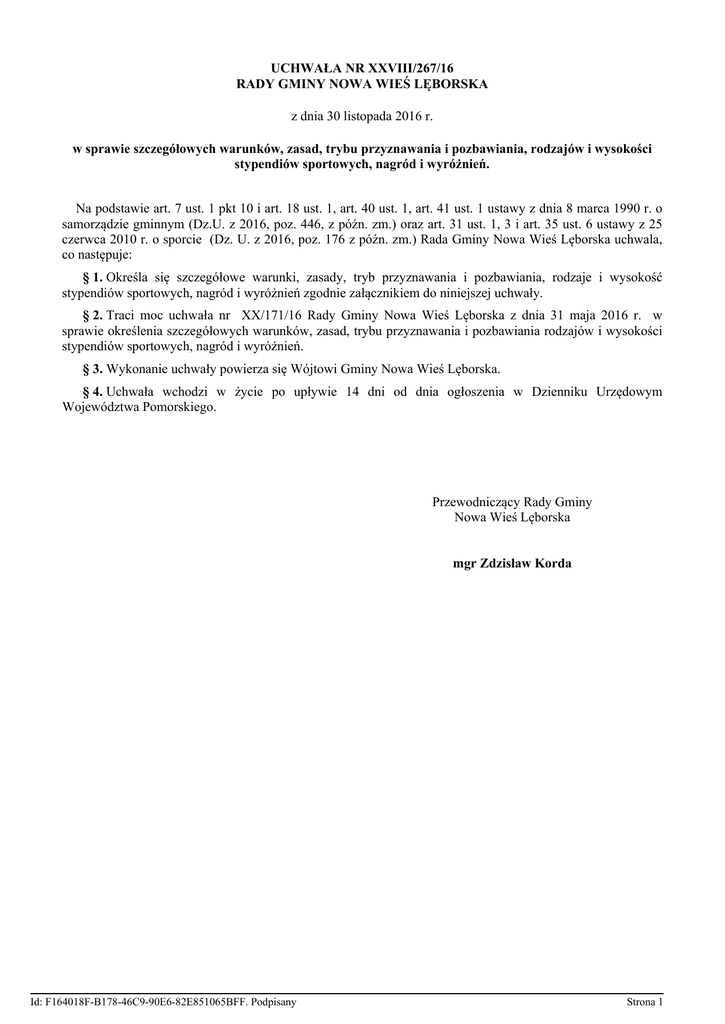 UCHWAŁA NR XXVIII/267/16 RADY GMINY NOWA WIEŚ LĘBORSKA z dnia 30 listopada 2016 r. w sprawie szczegółowych warunków, zasad, trybu przyznawania i pozbawiania, rodzajów i wysokości stypendiów sportowych, nagród i wyróżnień. Na podstawie art. 7 ust. 1 pkt 10 i art. 18 ust. 1, art. 40 ust. 1, art. 41 ust. 1 ustawy z dnia 8 marca 1990 r. o samorządzie gminnym (Dz.U. z 2016, poz. 446, z późn. zm.) oraz art. 31 ust. 1, 3 i art. 35 ust. 6 ustawy z 25 czerwca 2010 r. o sporcie (Dz. U. z 2016, poz. 176 z późn. zm.) Rada Gminy Nowa Wieś Lęborska uchwala, co następuje: § 1. Określa się szczegółowe warunki, zasady, tryb przyznawania i pozbawiania, rodzaje i wysokość stypendiów sportowych, nagród i wyróżnień zgodnie załącznikiem do niniejszej uchwały. § 2. Traci moc uchwała nr XX/171/16 Rady Gminy Nowa Wieś Lęborska z dnia 31 maja 2016 r. w sprawie określenia szczegółowych warunków, zasad, trybu przyznawania i pozbawiania rodzajów i wysokości stypendiów sportowych, nagród i wyróżnień. § 3. Wykonanie uchwały powierza się Wójtowi Gminy Nowa Wieś Lęborska. § 4. Uchwała wchodzi w życie po upływie 14 dni od dnia ogłoszenia w Dzienniku Urzędowym Województwa Pomorskiego. Przewodniczący Rady Gminy Nowa Wieś Lęborska mgr Zdzisław Korda Id: F164018F-B178-46C9-90E6-82E851065BFF. Podpisany Strona 1 Załącznik Nr 1 do Uchwały Nr XXVIII/267/16 Rady Gminy Nowa Wieś Lęborska z dnia 30 listopada 2016 r. Szczegółowe warunki, zasady, tryb przyznawania i pozbawiania, rodzaje i wysokość stypendiów sportowych, nagród i wyróżnień I. Postanowienia ogólne § 1. Ilekroć w "szczegółowych warunkach, zasadach, trybie przyznawania i pozbawiania, rodzajach i wysokościach stypendiów sportowych, nagród i wyróżnień " jest mowa o: 1. zawodniku – należy przez to rozumieć osobę fizyczną uprawiającą określoną dyscyplinę sportu, 2. stypendyście - należy przez to rozumieć zawodnika, któremu Wójt Gminy Nowa Wieś Lęborska przyznał stypendium sportowe, 3. wysokim wyniku sportowym – należy przez to rozumieć w szczególności: a) uzyskanie przez zawodnika klasy mistrzowskiej międzynarodowej na zawodach objętych kalendarzem sportowym właściwego związku sportowego, b) uzyskanie kwalifikacji olimpijskich, c) powołanie do kadry Polski w różnych kategoriach wiekowych, d) uzyskanie co najmniej jednego z następujących wyników sportowych w dyscyplinach olimpijskich: - zajęcie miejsca od 1 do 16 w Igrzyskach Olimpijskich, - zajęcie miejsca od 1 do 16 w zawodach Pucharu Świata, - zajęcie miejsca od 1 do 8 w mistrzostwach Świata Juniorów, - zajęcie miejsca od 1 do 8 w mistrzostwach Europy Juniorów, - zajęcie miejsca od 1 do 3 w Mistrzostwach Polski, - zajęcie miejsca od 1 do 3 w Mistrzostwach Polski Juniorów, Ogólnopolska Olimpiada Młodzieży, Mistrzostwa Polski Młodzików, Ogólnopolskie Zawody Dzieci (Finał), Puchar Polski (Finał), e) uzyskanie szczególnych osiągnięć sportowych w dyscyplinach nieolimpijskich nie mieszczących się w kryteriach opisanych w §1ust. 3 inne osiągnięcia sportowe mające wysoką rangę sportową biorąc pod uwagę znaczenie danej dyscypliny sportu, bądź w szczególny sposób promujący Gminę Nowa Wieś Lęborska. § 2. 1. Stypendium sportowe, nagroda lub wyróżnienie są wyrazem uznania dla prezentowanego przez zawodnika lub trenera poziomu sportowego oraz osiągnięcia wysokich wyników sportowych we współzawodnictwie międzynarodowym lub krajowym w danej dyscyplinie sportu. 2. Formami uznania dla osiągnięć oraz poziomu sportowego i wysokich wyników sportowych: 1) zawodnika są: a) stypendia sportowe, b) nagrody 2) trenera są: a) nagrody, b) wyróżnienia. Id: F164018F-B178-46C9-90E6-82E851065BFF. Podpisany Strona 1 II. Warunki, zasady, tryb przyznawania i pozbawiania, rodzaje i wysokość stypendiów sportowych § 3. 1. Stypendium sportowe może otrzymać zawodnik, który uprawia dyscyplinę sportu objętą współzawodnictwem sportowym, osiągnął wysoki wynik sportowy oraz jest mieszkańcem Gminy Nowa Wieś Lęborka lub zrzeszony jest w klubie sportowym, stowarzyszeniu mającym siedzibę na terenie Gminy Nowa Wieś Lęborska oraz reprezentuje postawę godną do naśladowania przez innych zawodników. 2. Zawodnik zobowiązany jest do godnego reprezentowania Gminy Nowa Wieś Lęborska oraz do promocji gminy poprzez np. umieszczenie herbu Gminy Nowa Wieś Lęborska na swojej garderobie sportowej lub w innej formie. § 4. 1. Z wnioskiem o przyznanie stypendium sportowego może wystąpić: 1) klub sportowy lub stowarzyszenie, w którym zrzeszony jest zawodnik, 2) właściwy polski związek sportowy lub okręgowy związek sportowy, 3) pełnoletni zawodnik, 4) rodzic zawodnika lub opiekun prawny, w przypadku gdy zawodnik jest niepełnoletni, 5) dyrektor placówki oświatowej z terenu Gminy Nowa Wieś Lęborska. 2. Wniosek o przyznanie stypendium sportowego należy składać na formularzu stanowiącym załącznik nr 1 do „szczegółowych warunków, zasad, trybu przyznawania i pozbawiania, rodzajów i wysokości stypendiów sportowych, nagród i wyróżnień". 3. Wniosek o przyznanie stypendium sportowego składa się w Urzędzie Gminy w Nowej Wsi Lęborskiej w terminie do 15 stycznia roku, na który ma być przyznane stypendium sportowe, uwzględniając wysokie wyniki sportowe osiągnięte w okresie 12 miesięcy roku poprzedniego. 4. Wniosek powinien zawierać: 1) dane osobowe zawodnika, jego aktualny adres zamieszkania, 2) określenie wnioskodawcy i jego adres zamieszkania lub siedziby, 3) opis wysokiego wyniku sportowego uprawniającego do ubiegania się o stypendium sportowe tj.: a) uzyskane przez zawodnika wyniki sportowe, b) przedłożenie oficjalnego protokołu z zawodów, na których zawodnik osiągnął wymagany wynik, lub innego dokumentu potwierdzającego osiągnięcie wysokiego wyniku sportowego. 5. Złożenie wniosku nie jest jednoznaczne z przyznaniem stypendi