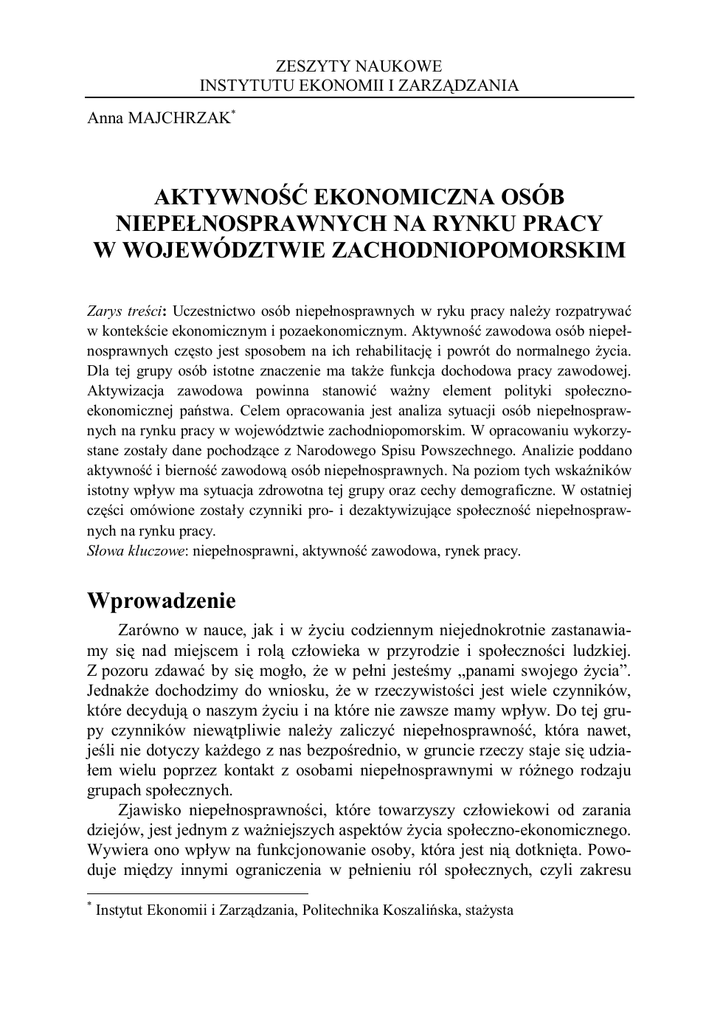 ZESZYTY NAUKOWE INSTYTUTU EKONOMII I ZARZĄDZANIA Anna MAJCHRZAK* AKTYWNOŚĆ EKONOMICZNA OSÓB NIEPEŁNOSPRAWNYCH NA RYNKU PRACY W WOJEWÓDZTWIE ZACHODNIOPOMORSKIM Zarys treści: Uczestnictwo osób niepełnosprawnych w ryku pracy należy rozpatrywać w kontekście ekonomicznym i pozaekonomicznym. Aktywność zawodowa osób niepełnosprawnych często jest sposobem na ich rehabilitację i powrót do normalnego życia. Dla tej grupy osób istotne znaczenie ma także funkcja dochodowa pracy zawodowej. Aktywizacja zawodowa powinna stanowić ważny element polityki społecznoekonomicznej państwa. Celem opracowania jest analiza sytuacji osób niepełnosprawnych na rynku pracy w województwie zachodniopomorskim. W opracowaniu wykorzystane zostały dane pochodzące z Narodowego Spisu Powszechnego. Analizie poddano aktywność i bierność zawodową osób niepełnosprawnych. Na poziom tych wskaźników istotny wpływ ma sytuacja zdrowotna tej grupy oraz cechy demograficzne. W ostatniej części omówione zostały czynniki pro- i dezaktywizujące społeczność niepełnosprawnych na rynku pracy. Słowa kluczowe: niepełnosprawni, aktywność zawodowa, rynek pracy. Wprowadzenie Zarówno w nauce, jak i w życiu codziennym niejednokrotnie zastanawiamy się nad miejscem i rolą człowieka w przyrodzie i społeczności ludzkiej. Z pozoru zdawać by się mogło, że w pełni jesteśmy „panami swojego życia”. Jednakże dochodzimy do wniosku, że w rzeczywistości jest wiele czynników, które decydują o naszym życiu i na które nie zawsze mamy wpływ. Do tej grupy czynników niewątpliwie należy zaliczyć niepełnosprawność, która nawet, jeśli nie dotyczy każdego z nas bezpośrednio, w gruncie rzeczy staje się udziałem wielu poprzez kontakt z osobami niepełnosprawnymi w różnego rodzaju grupach społecznych. Zjawisko niepełnosprawności, które towarzyszy człowiekowi od zarania dziejów, jest jednym z ważniejszych aspektów życia społeczno-ekonomicznego. Wywiera ono wpływ na funkcjonowanie osoby, która jest nią dotknięta. Powoduje między innymi ograniczenia w pełnieniu ról społecznych, czyli zakresu * Instytut Ekonomii i Zarządzania, Politechnika Koszalińska, stażysta 104 Anna Majchrzak zadań, które człowiek spełnia, bądź powinien spełniać – w zależności od wieku, płci, pozycji w grupie itp.1 Osoby nią dotknięte ze względu na stan zdrowia mają ograniczone możliwości podjęcia pracy, mniejszą wydajność, co przekłada się na niższe zarobki. Osoby niepełnosprawne stanowią grupę wewnętrznie zróżnicowaną m.in. pod względem stopnia, rodzaju niepełnosprawności, miejsca zamieszkania, wieku, wykształcenia, sytuacji na rynku pracy i innych cech społecznoekonomicznych. Celem opracowania jest przedstawienie charakterystyki osób niepełnosprawnych według cech demograficznych i ekonomicznych w województwie zachodniopomorskim. Podjęto próbę wyróżnienia cech, jakimi powinna odznaczać się osoba niepełnosprawna, aby zwiększyć swoje szanse na zatrudnienie oraz omówiono działania jakie muszą podjąć osoby niepełnosprawne by mogły zaistnieć na rynku pracy. Statystyka opisowa wykorzystana w opracowaniu, obejmuje osoby niepełnosprawne definiowane zgodnie z metodologia NSP 20022. Jest to zarazem podstawowe źródło informacji o cechach subpopulacji osób niepełnosprawnych. Choć z natury rzeczy liczebnie największy udział wśród niepełnosprawnych mają osoby starsze, to jednak szczególną uwagę w badaniu zwrócono na populację osób w wieku produkcyjnym. Analiza tej grupy została przeprowadzona w ujęciu przestrzennym, według powiatów województwa zachodniopomorskiego. Charakterystyka demograficzna osób niepełnosprawnych W Polsce występowała w okresie międzyspisowym (1988 – 2002) duża dynamika przyrostu liczby osób niepełnosprawnych3. Nastąpił wtedy wzrost liczby osób niepełnosprawnych z 3 736 tys. w 1988 r. do 5 457 tys. w 2002 r. (przyrost o 46,1%). Dynamikę wzrostu należy ocenić jako wysoką, co wynika głównie z dłuższego przeciętnego okresu życia, wejściem wyżu demograficznego w wiek produkcyjny, zmniejszeniem się popytu na pracę oraz poszukiwaniem alternatywnych źródeł dochodu. 1 Zob. Z. Kawczyńska-Butrym, Niepełnosprawność – specyfika pomocy społecznej, Wydawnictwo Śląsk, Katowice 1998, s. 10. 2 Zob. Osoby niepełnosprawne oraz ich gospodarstwa domowe 2002 r. Część I Osoby niepełnosprawne, GUS, Warszawa 2003, s. 15. 3 Tamże, s. 23. Aktywność ekonomiczna osób niepełnosprawnych na rynku pracy … 105 Liczba osób niepełnosprawnych w województwie zachodniopomorskim w 2002 stanowiła 13,7% ogółu ludności województwa (analogicznie w kraju 14,3%). Oznacza to, że co siódmy mieszkaniec województwa (podobnie jak w kraju) doświadcza niepełnosprawności, podczas gdy w 1988 roku, co dziesiąty4. Liczba osób niepełnosprawnych w wieku powyżej 16 lat - wg danych GUS z 2002 r. wynosi 224 446 osób, tj. 13,22% ogółu ludności województwa, natomiast w wieku od 0 do 15 lat - wynosi 9 052 osób tj. 5,35%. W ogólnej populacji niepełnosprawnych 52,5% (122 477 osób) stanowią kobiety. Analiza liczby osób niepełnosprawnych w poszczególnych grupach wiekowych pozwala zauważyć, że największy udział stanowi grupa osób w wieku 50 lat i więcej tj. 70%, z czego 35% to pięćdziesięciolatkowie, czyli roczniki z tzw. wyżu demograficznego urodzone w latach 50-tych XX w. Ważnym czynnikiem, determinującym status osoby na rynku pracy jest wykształcenie. Możliwość wykazania się właściwymi kwalifikacjami jest podstawowym kryterium uzyskania zatrudnienia, a dla osoby niepełnosprawnej uzyskanie pracy zgodnej z jej możliwościami i zainteresowaniami. To nie tylko sposób na polepszenie sytuacji ekonomicznej, ale także niezbędny warunek uzyskania poczucia własnej wartości i integracji ze społeczeństwem. Uzyskiwany poziom wykształcenia i zdobyte kwalifikacje decydują