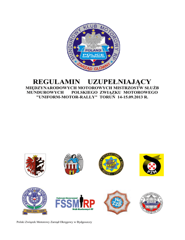 REGULAMIN UZUPEŁNIAJĄCY MIĘDZYNARODOWYCH MOTOROWYCH MISTRZOSTW SŁUŻB MUNDUROWYCH POLSKIEGO ZWIĄZKU MOTOROWEGO "UNIFORM-MOTOR-RALLY" TORUŃ 14-15.09.2013 R. Polski Związek Motorowy Zarząd Okręgowy w Bydgoszczy REGULAMIN UZUPEŁNIAJĄCY Międzynarodowych Motorowych Mistrzostw Służb Mundurowych “ UNIFORM – MOTOR – RALLY – 2013” TORUŃ 14-15.09.2013 o tytuł: Indywidualnego i Drużynowego Międzynarodowego Motorowego Mistrza Służb Mundurowych Polskiego Związku Motorowego oraz dla najlepszego zespołu nagroda specjalna „Puchar przechodni” ufundowany przez Pracownie Witraży INTEK-ART z Torunia 1. ORGANIZATOR -Mundurowy Klub Motorowy RP – ZARZĄD GŁÓWNY przy współpracy z: - Zarządem Okręgowym PZM w Bydgoszczy - Zarządem Automobilklubu Toruńskiego - MOSiR Toruń - Unicar Dwa Renault w Toruniu - Partner Renault – T. Pasikowski Włocławek - Autopol Toruń - Awix Oil w Toruniu - FHU „Robert” w Toruniu - Toruńska Akademia Jazdy 2. TERMIN I MIEJSCE Impreza odbędzie się w dn. 14 i 15.09.2013 r. w Toruniu na torze kartingowym przy Motoarenie. Patronat Honorowy nad imprezą objęli: 1. Prezydent IPMC – Reinhard Moser 2. Marszałek Woj. Kuj.- Pom. – Piotr Całbecki 3. Prezydent m. Torunia – Michał Zaleski Komitet honorowy 1. Prezydent MKMRP – przewodniczący 2. Kapelan MKMRP 3. Ks. kapelan Dziekan Wojsk Lądowych 4. Komendant Wojewódzki Policji w Bydgoszczy 5. Prezydent Federacji Stowarzyszeń Służb Mundurowych RP 6. Komendant Wojewódzki Państwowej Straży Pożarnej w Toruniu 7. Prezes Zarządu Okręgowego PZM w Bydgoszczy 8. Dyrektor Okręgowy Służby Więziennej w Bydgoszczy 9. Prezes OZDG w Bydgoszczy 10. Prezes Zarządu Woj. NSZZ Policjantów 11. Prezes Zarządu Woj. SE i R Policji w Bydgoszczy 12. Komendant Miejski Policji w Toruniu 13. Dowódca Garnizonu Toruń 14. Komendant Miejski PSP w Toruniu. 15. Dyrektor Aresztu Śledczego w Toruniu 16. Komendant Straży Miejskiej w Toruniu 17. Prezesi Automobilklubu Toruńskiego 18. Prezes Unicar Dwa Renault Toruń 19. Prezes Wydawnictwa „Adam Marszałek” 20. Autoryzowany Partner Renault Tadeusz Pasikowski 21. Prezes Autopol Toruń 22. Dyrektor Miejskiego Ośrodka Sportu i Rekreacji w Toruniu 23. Prezydent Knight Riders Poland 24. Prezes Toruńskiej Akademii Jazdy 25. Prezes Awix Oil w Toruniu 4. UCZESTNICTWO – KLASYFIKACJA a. uczestnikiem imprezy może być tylko członek jednej z niżej wymienionych organizacji: - klub lub stowarzyszenie będące członkiem Polskiego Związku Motorowego - czynny lub emerytowany funkcjonariusz formacji mundurowej (policja, straż pożarna, wojsko, służba więzienna, straż miejska itp.). b. każdy uczestnik musi posiadać odpowiedni dokument potwierdzający przynależność do w/w stowarzyszenia lub formacji c. każdy uczestnik musi posiadać prawo jazdy minimum kategorii A i B d. w dniu imprezy obowiązuje ubiór : pełne obuwie, długie spodnie, górna część garderoby z długimi rękawami i rękawice chroniące dłonie. Kaski zapewnia organizator ale można używać własne . Zalecany strój polowy poszczególnych formacji mundurowych e. prowadzona będzie klasyfikacja indywidualna i zespołowa f. Każdy Region MKMRP, Grupa Wojewódzka IPA, klub zagraniczny IPMC i IPA oraz każda struktura wojewódzka służby lub stowarzyszenia może być reprezentowana przez 1 drużynę składającą się z 2-3 zawodników (do wyniku zespołu zalicza się rezultaty dwóch najlepszych zawodników danego zespołu). Zgłoszenie innej liczby zespołów wymaga uzgodnienia z organizatorem. Każdy uczestnik Mistrzostw zobowiązany jest wpłacić wpisowe w kwocie 60 zł na konto Mundurowego Klubu Motorowego RP Getin Bank PL16 1560 0013 2354 2204 2000 0002 PLN lub w dniu imprezy w biurze zawodów. Zawody odbywać się będą w dniach 14 i 15 września 2013 r. na torze kartingowym zlokalizowanym przy stadionie żużlowym Motoarena w Toruniu. Biuro imprezy zlokalizowane będzie w obiekcie Motoareny. 5. KIEROWNICTWO I WŁADZE IMPREZY - Przewodniczący Komitetu Organizacyjnego - Józef Szydliński - Zespół Sędziów Sportowych przewodniczący członek członek - Anna Montewska - Ewa Munnik - Jarosław Kuncman Sekretarz Generalny MKMRP tel. 691 486846 - Dyrektor imprezy - Zbigniew Ligocki lic. I-319/12 tel.510 035 115 - Dyrektor ds. organizacyjnych - Ryszard Kochel lic. II-777/11 tel. 605 609 710 - Dyrektor ds.chronometrażu i obliczeń - Grzegorz Ostrowski tel.500 227 301 - Kierownik obsady sędziów i prób - Jarosław Kuncman lic. II-659/06 tel.501 666858 - Kierownik zabezpieczenia - Wiesław Rozpirski lic. I-734/99 lic. II-659/06 6. PROGRAM IMPREZY SOBOTA 14.09.2013 930 – oficjalne rozpoczęcie zawodów, podniesienie flagi państwowej, przywitanie gości 1000 – rozpoczęcie zawodów NIEDZIELA 15.09.2013 900 – kontynuacja zawodów 1200 – ogłoszenie wyników, wręczenie pucharów, uroczyste zakończenie mistrzostw Konkurencje: (pojazdy do prób sprawnościowych zapewnia organizator) 1. Próba sprawnościowa gokartem. 2. Próba slalomowa samochodem 3. Próba sprawnościowa samochodem (Sz – 1) 4. Próba sprawnościowa samochodem (Sz - 2) 5. Próba slalomowa samochodem (SL) 6. Próba samochodowa (trolley) 7. Próba samochodowa (test stewarda) 8. Próba sprawnościowa (motocykl) 9. Próba sprawnościowa (quad) *godzina zakończenia może ulec zmianie (komunikat w dniu zawodów) Organizatorzy w ramach atrakcji przewidują udostępnienie symulatorów: zderzeniowego i dachowania oraz próbę samochodową (auto gogle). Po zakończeniu wszystkich konkurencji przeprowadzona zostanie próba sprawnościowa gokartem rozegrana pomiędzy trzema najlepszymi uczestnikami imprezy i reprezentantami AWIX Racing Arena o puchar AWIX-OIL. 7. PUNKTACJA - uzyskany czas przeliczany jest i wpisany jako punkty karne - za złe przejechanie wyznaczonej trasy lub ominięcie słupka = TARYFA (taryfa jest to 110% punktów najwolniejszego uczestnika na danej próbie) - przewrócenie lub przesuni