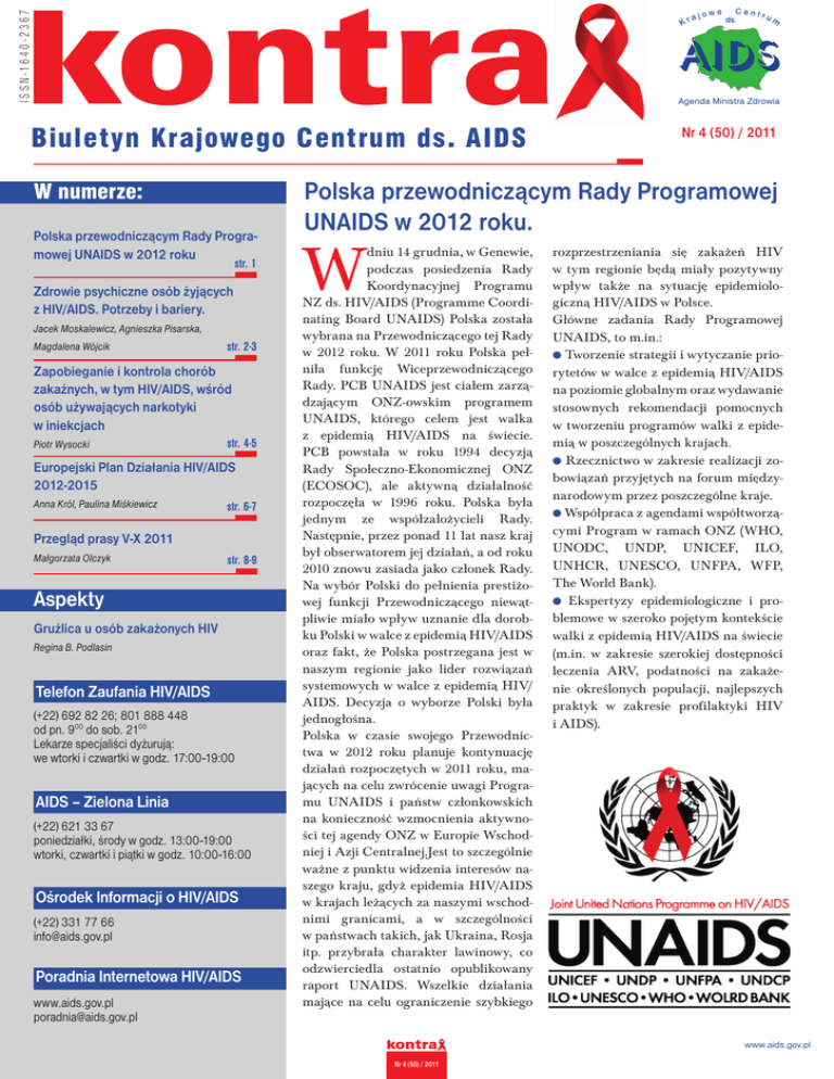 I S S N -16 4 0 -23 67 Agenda Ministra Zdrowia Biuletyn Krajowego Centrum ds. AIDS W numerze: Polska przewodniczącym Rady Programowej UNAIDS w 2012 roku str. 1 Zdrowie psychiczne osób żyjących z HIV/AIDS. Potrzeby i bariery. Jacek Moskalewicz, Agnieszka Pisarska, Magdalena Wójcik str. 2-3 Zapobieganie i kontrola chorób zakaźnych, w tym HIV/AIDS, wśród osób używających narkotyki w iniekcjach Piotr Wysocki str. 4-5 Europejski Plan Działania HIV/AIDS 2012-2015 Anna Król, Paulina Miśkiewicz str. 6-7 Przegląd prasy V-X 2011 Małgorzata Olczyk str. 8-9 Aspekty Gruźlica u osób zakażonych HIV Regina B. Podlasin Telefon Zaufania HIV/AIDS (+22) 692 82 26; 801 888 448 od pn. 900 do sob. 2100 Lekarze specjaliści dyżurują: we wtorki i czwartki w godz. 17:00-19:00 AIDS – Zielona Linia (+22) 621 33 67 poniedziałki, środy w godz. 13:00-19:00 wtorki, czwartki i piątki w godz. 10:00-16:00 Ośrodek Informacji o HIV/AIDS (+22) 331 77 66 [email protected] Poradnia Internetowa HIV/AIDS www.aids.gov.pl [email protected] Nr 4 (50) / 2011 Polska przewodniczącym Rady Programowej UNAIDS w 2012 roku. W dniu 14 grudnia, w Genewie, podczas posiedzenia Rady Koordynacyjnej Programu NZ ds. HIV/AIDS (Programme Coordinating Board UNAIDS) Polska została wybrana na Przewodniczącego tej Rady w 2012 roku. W 2011 roku Polska pełniła funkcję Wiceprzewodniczącego Rady. PCB UNAIDS jest ciałem zarządzającym ONZ-owskim programem UNAIDS, którego celem jest walka z epidemią HIV/AIDS na świecie. PCB powstała w roku 1994 decyzją Rady Społeczno-Ekonomicznej ONZ (ECOSOC), ale aktywną działalność rozpoczęła w 1996 roku. Polska była jednym ze współzałożycieli Rady. Następnie, przez ponad 11 lat nasz kraj był obserwatorem jej działań, a od roku 2010 znowu zasiada jako członek Rady. Na wybór Polski do pełnienia prestiżowej funkcji Przewodniczącego niewątpliwie miało wpływ uznanie dla dorobku Polski w walce z epidemią HIV/AIDS oraz fakt, że Polska postrzegana jest w naszym regionie jako lider rozwiązań systemowych w walce z epidemią HIV/ AIDS. Decyzja o wyborze Polski była jednogłośna. Polska w czasie swojego Przewodnictwa w 2012 roku planuje kontynuację działań rozpoczętych w 2011 roku, mających na celu zwrócenie uwagi Programu UNAIDS i państw członkowskich na konieczność wzmocnienia aktywności tej agendy ONZ w Europie Wschodniej i Azji Centralnej.Jest to szczególnie ważne z punktu widzenia interesów naszego kraju, gdyż epidemia HIV/AIDS w krajach leżących za naszymi wschodnimi granicami, a w szczególności w państwach takich, jak Ukraina, Rosja itp. przybrała charakter lawinowy, co odzwierciedla ostatnio opublikowany raport UNAIDS. Wszelkie działania mające na celu ograniczenie szybkiego rozprzestrzeniania się zakażeń HIV w tym regionie będą miały pozytywny wpływ także na sytuację epidemiologiczną HIV/AIDS w Polsce. Główne zadania Rady Programowej UNAIDS, to m.in.: ● Tworzenie strategii i wytyczanie priorytetów w walce z epidemią HIV/AIDS na poziomie globalnym oraz wydawanie stosownych rekomendacji pomocnych w tworzeniu programów walki z epidemią w poszczególnych krajach. ● Rzecznictwo w zakresie realizacji zobowiązań przyjętych na forum międzynarodowym przez poszczególne kraje. ● Współpraca z agendami współtworzącymi Program w ramach ONZ (WHO, UNODC, UNDP, UNICEF, ILO, UNHCR, UNESCO, UNFPA, WFP, The World Bank). ● Ekspertyzy epidemiologiczne i problemowe w szeroko pojętym kontekście walki z epidemią HIV/AIDS na świecie (m.in. w zakresie szerokiej dostępności leczenia ARV, podatności na zakażenie określonych populacji, najlepszych praktyk w zakresie profilaktyki HIV i AIDS). www.aids.gov.pl Nr 4 (50) / 2011 2 Zdrowie psychiczne osób żyjących z HIV/AIDS. Potrzeby i bariery. P otrzeby psychiczne osób żyjących z HIV/AIDS pozornie wydają się mieć drugorzędne znaczenie w porównaniu z zagrożeniem dla zdrowia i życia, jakie niesie za sobą infekcja HIV. Walka z wirusem jest też priorytetem odpowiednich służb medycznych. Dlatego też wśród licznych badań i prac na temat problemów wynikających z HIV/AIDS problemy zdrowia psychicznego pojawiają się stosunkowo rzadko. Studium „Mental Health and HIV/AIDS”1 – współfinansowane przez Komisję Europejską – jest pierwszym badaniem podejmującym tę problematykę w Polsce oraz jednym z pierwszych w tej części Europy. Badanie prowadzone w siedmiu krajach Europy Środkowo-Wschodniej obejmowało wiele przedsięwzięć badawczych, w tym analizę instytucjonalną, analizę dokumentacji medycznej, badania metodą delficką oraz zogniskowane wywiady grupowe (grupy fokusowe). Wyniki badań dotyczących instytucji opieki zostały przedstawione w artykule w Kontrze nr 2 (48)2. W tym artykule zamierzamy przedstawić wyniki zogniskowanych wywiadów grupowych realizowanych w kilku miastach w Polsce. Celem wywiadów była identyfikacja potrzeb, barier oraz wskazanie dobrych rozwiązań w zakresie zdrowia psychicznego osób żyjących z HIV/AIDS. Dyskusja skoncentrowana była wokół trzech pytań badawczych: ● Jakie są potrzeby w zakresie zdrowia psychicznego osób żyjących z HIV/ AIDS? ● Jakie bariery utrudniają osobom żyjącym z HIV/AIDS dostęp do pomocy i wsparcia w zakresie zdrowia psychicznego? ● o należałoby zrobić, żeby zapewnić C odpowiednią pomoc i opiekę w zakresie zdrowia psychicznego? Przeprowadzono cztery zogniskowane wywiady grupowe z osobami żyjącymi z HIV/AIDS, w większości członkami organizacji pozarządowych. W sumie w badaniach wzięło udział 25 osób, w tym 8 kobiet. Wszystkie wywiady zostały nagrane w wersji dźwiękowej, a następnie spisane. Analiza była prowadzona przez dwóch niezależnych sędziów kompetentnych. Analizy jakościowe prowadzone były metodą nazywaną analizą tematyczną (thematic analysis), która polega na identyfikowaniu tematów pojawiających się w wypowiedziach respondent