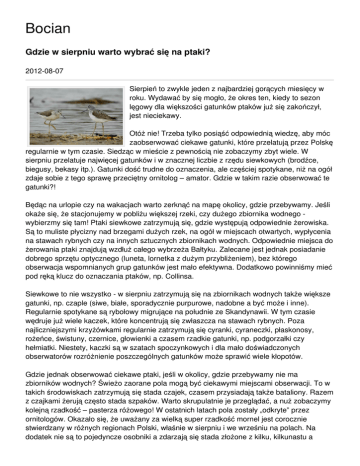 Bocian Gdzie w sierpniu warto wybrać się na ptaki? 2012-08-07 Sierpień to zwykle jeden z najbardziej gorących miesięcy w roku. Wydawać by się mogło, że okres ten, kiedy to sezon lęgowy dla większości gatunków ptaków już się zakończył, jest nieciekawy. Otóż nie! Trzeba tylko posiąść odpowiednią wiedzę, aby móc zaobserwować ciekawe gatunki, które przelatują przez Polskę regularnie w tym czasie. Siedząc w mieście z pewnością nie zobaczymy zbyt wiele. W sierpniu przelatuje najwięcej gatunków i w znacznej liczbie z rzędu siewkowych (brodźce, biegusy, bekasy itp.). Gatunki dość trudne do oznaczenia, ale częściej spotykane, niż na ogół zdaje sobie z tego sprawę przeciętny ornitolog – amator. Gdzie w takim razie obserwować te gatunki?! Będąc na urlopie czy na wakacjach warto zerknąć na mapę okolicy, gdzie przebywamy. Jeśli okaże się, że stacjonujemy w pobliżu większej rzeki, czy dużego zbiornika wodnego wybierzmy się tam! Ptaki siewkowe zatrzymują się, gdzie występują odpowiednie żerowiska. Są to muliste płycizny nad brzegami dużych rzek, na ogół w miejscach otwartych, wypłycenia na stawach rybnych czy na innych sztucznych zbiornikach wodnych. Odpowiednie miejsca do żerowania ptaki znajdują wzdłuż całego wybrzeża Bałtyku. Zalecane jest jednak posiadanie dobrego sprzętu optycznego (luneta, lornetka z dużym przybliżeniem), bez którego obserwacja wspomnianych grup gatunków jest mało efektywna. Dodatkowo powinniśmy mieć pod ręką klucz do oznaczania ptaków, np. Collinsa. Siewkowe to nie wszystko - w sierpniu zatrzymują się na zbiornikach wodnych także większe gatunki, np. czaple (siwe, białe, sporadycznie purpurowe, nadobne a być może i inne). Regularnie spotykane są rybołowy migrujące na południe ze Skandynawii. W tym czasie wędruje już wiele kaczek, które koncentrują się zwłaszcza na stawach rybnych. Poza najliczniejszymi krzyżówkami regularnie zatrzymują się cyranki, cyraneczki, płaskonosy, rożeńce, świstuny, czernice, głowienki a czasem rzadkie gatunki, np. podgorzałki czy hełmiatki. Niestety, kaczki są w szatach spoczynkowych i dla mało doświadczonych obserwatorów rozróżnienie poszczególnych gatunków może sprawić wiele kłopotów. Gdzie jednak obserwować ciekawe ptaki, jeśli w okolicy, gdzie przebywamy nie ma zbiorników wodnych? Świeżo zaorane pola mogą być ciekawymi miejscami obserwacji. To w takich środowiskach zatrzymują się stada czajek, czasem przysiadają także bataliony. Razem z czajkami żerują często stada szpaków. Warto skrupulatnie je przeglądać, a nuż zobaczymy kolejną rzadkość – pasterza różowego! W ostatnich latach pola zostały „odkryte” przez ornitologów. Okazało się, że uważany za wielką super rzadkość mornel jest corocznie stwierdzany w różnych regionach Polski, właśnie w sierpniu i we wrześniu na polach. Na dodatek nie są to pojedyncze osobniki a zdarzają się stada złożone z kilku, kilkunastu a nawet kilkudziesięciu ptaków! Warto także zerkać w niebo – w sierpniu odlatują bociany. Prowadząc odpowiednie obserwacje przy korzystnej pogodzie możemy być świadkami odlotów/przelotów gatunku. Wg wpisanych do Polskiej Kartoteki Przyrodniczej obserwacji migrujące stada tych ptaków w ostatnich latach były obserwowane już od połowy sierpnia. Zaznaczam, że wszelkie obserwacje mornela i pasterza różowego podlegają weryfikacji przez Komisję Faunistyczną Polskiego Towarzystwa Zoologicznego. Z ciekawymi obserwacjami zapraszamy do Polskiej Kartoteki Przyrodniczej. Mirosław Rzępała