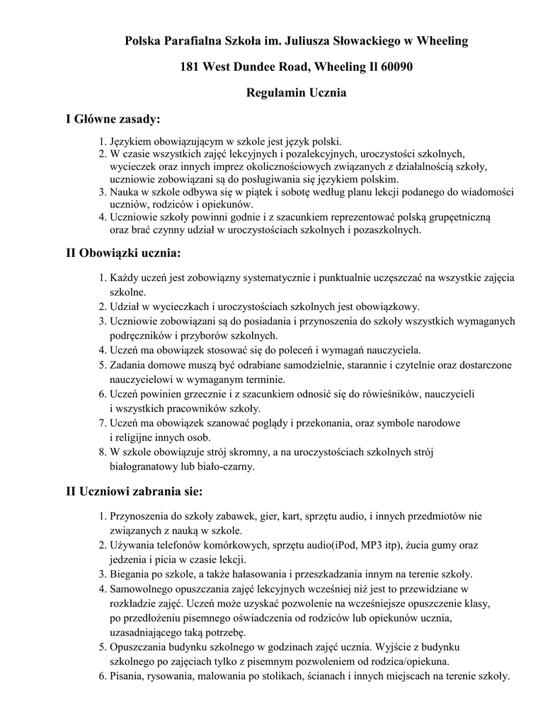 Polska Parafialna Szkoła im. Juliusza Słowackiego w Wheeling 181 West Dundee Road, Wheeling Il 60090 Regulamin Ucznia I Główne zasady: 1. Językiem obowiązującym w szkole jest język polski. 2. W czasie wszystkich zajęć lekcyjnych i pozalekcyjnych, uroczystości szkolnych, wycieczek oraz innych imprez okolicznościowych związanych z działalnością szkoły, uczniowie zobowiązani są do posługiwania się językiem polskim. 3. Nauka w szkole odbywa się w piątek i sobotę według planu lekcji podanego do wiadomości uczniów, rodziców i opiekunów. 4. Uczniowie szkoły powinni godnie i z szacunkiem reprezentować polską grupęetniczną oraz brać czynny udział w uroczystościach szkolnych i pozaszkolnych. II Obowiązki ucznia: 1. Każdy uczeń jest zobowiązny systematycznie i punktualnie uczęszczać na wszystkie zajęcia szkolne. 2. Udział w wycieczkach i uroczystościach szkolnych jest obowiązkowy. 3. Uczniowie zobowiązani są do posiadania i przynoszenia do szkoły wszystkich wymaganych podręczników i przyborów szkolnych. 4. Uczeń ma obowiązek stosować się do poleceń i wymagań nauczyciela. 5. Zadania domowe muszą być odrabiane samodzielnie, starannie i czytelnie oraz dostarczone nauczycielowi w wymaganym terminie. 6. Uczeń powinien grzecznie i z szacunkiem odnosić się do rówieśników, nauczycieli i wszystkich pracowników szkoły. 7. Uczeń ma obowiązek szanować poglądy i przekonania, oraz symbole narodowe i religijne innych osob. 8. W szkole obowiązuje strój skromny, a na uroczystościach szkolnych strój białogranatowy lub biało-czarny. II Uczniowi zabrania sie: 1. Przynoszenia do szkoły zabawek, gier, kart, sprzętu audio, i innych przedmiotów nie związanych z nauką w szkole. 2. Używania telefonów komórkowych, sprzętu audio(iPod, MP3 itp), żucia gumy oraz jedzenia i picia w czasie lekcji. 3. Biegania po szkole, a także hałasowania i przeszkadzania innym na terenie szkoły. 4. Samowolnego opuszczania zajęć lekcyjnych wcześniej niż jest to przewidziane w rozkładzie zajęć. Uczeń może uzyskać pozwolenie na wcześniejsze opuszczenie klasy, po przedłożeniu pisemnego oświadczenia od rodziców lub opiekunów ucznia, uzasadniającego taką potrzebę. 5. Opuszczania budynku szkolnego w godzinach zajęć ucznia. Wyjście z budynku szkolnego po zajęciach tylko z pisemnym pozwoleniem od rodzica/opiekuna. 6. Pisania, rysowania, malowania po stolikach, ścianach i innych miejscach na terenie szkoły. Polska Parafialna Szkoła im. Juliusza Słowackiego w Wheeling 181 West Dundee Road, Wheeling Il 60090 IV Nieobecność na zajęciach: 1. Nieobecność na lekcjach musi być usprawiedliwiona przez rodziców lub opiekunów ucznia. 2. O każdej nieusprawiedliwionej nieobecności w szkole, rodzice lub opiekunowie ucznia zostaną powiadomieni przez wychowawcę klasy. 3. Pięć kolejnych nieusprawiedliwionych nieobecności na zajęciach lekcyjnych jest przyczyną nieklasyfikacji ucznia, a sześć kolejnych nieobecności powoduje skreślenie go z listy uczniów. IV Prawa ucznia: 1. Uczeń ma prawo do poszanowania godności osobistej. 2. Uczeń ma prawo do właściwie zorganizowanego procesu kształcenia oraz życzliwego, podmiotowego traktowania w procesie dydaktyczno - wychowawczym. 3. Uczeń ma prawo do rzetelnej, sprawiedliwej oceny swego zachowania i postępów w nauce. 4. Uczeń ma prawo do zgłaszania wychowawcy klasy trudności w nauce i uzyskania pomocy. 5. Uczeń ma prawo do trzymiesięcznych wakacji. V Nagrody i wyróżnienia: 1. Pochwała udzielona przez nauczyciela na forum klasy. 2. Pochwała udzielona publicznie (apel szkolny) przez dyrektora szkoły. 3. Za wzorowe zachowanie i wysokie wyniki w nauce wyróżnienie ucznia w obecności całej szkoły. 4. Za pilność, obowiązkowość w uczestniczeniu na zajęcia, wzorowe zachowanie i postępy w nauce uczeń kwalifikuje się do otrzymania wyróżnienia ustalonego przez Radę Pedagogiczną i Zarząd Szkoły. VI Kary i nagany: 1. Upomnienie udzielone przez nauczyciela w rozmowie indywidualnej z uczniem. 2. Upomnienie ucznia w obecności klasy. 3. Nagana udzielona publicznie (apel szkolny) przez dyrektora szkoły. 4. Obniżenie oceny ze sprawowania. 5. Pisemne poinformowanie rodziców lub opiekunów o kłopotach z uczniem zatwierdzone przez Radę Pedagogiczną. 6. Pisemna nagana z poinformowaniem rodziców lub opiekunów udzielona przez dyrekcję szkoły z ostrzeżeniem o możliwości usunięcia ucznia ze szkoły. 7. Usunięcie ucznia ze szkoły zatwierdzone przez Radę Pedagogiczną i Zarząd Szkoły. 8. Za samowolne opuszczanie budynku szkolnego uczeń zostanie karnie usunięty ze szkoły w trybie natychmiastowym (bez zwrotu opłaty za szkołę) z jednoczesnym powiadomieniem szkoły macierzystej. Polska Parafialna Szkoła im. Juliusza Słowackiego w Wheeling 181 West Dundee Road, Wheeling Il 60090 OŚWIACZENIE Oświadczam, że zapoznałem/am się z regulaminem szkoły i będę stosował(a) się do powyższych zasad: Podpis ucznia.................................................................................... Data.................................. Wydrukowane nazwisko i imie ucznia ........................................................................................ Podpis rodzica/opiekuna................................................................. Data.................................. Wydrukowane nazwisko i imię rodzica/opiekuna......................................................................... ....................................................................................................................................................... Do użytku wewnętrznego: Przyjęto przez ................................................................................. Data................................. ______________________________________________________________________________